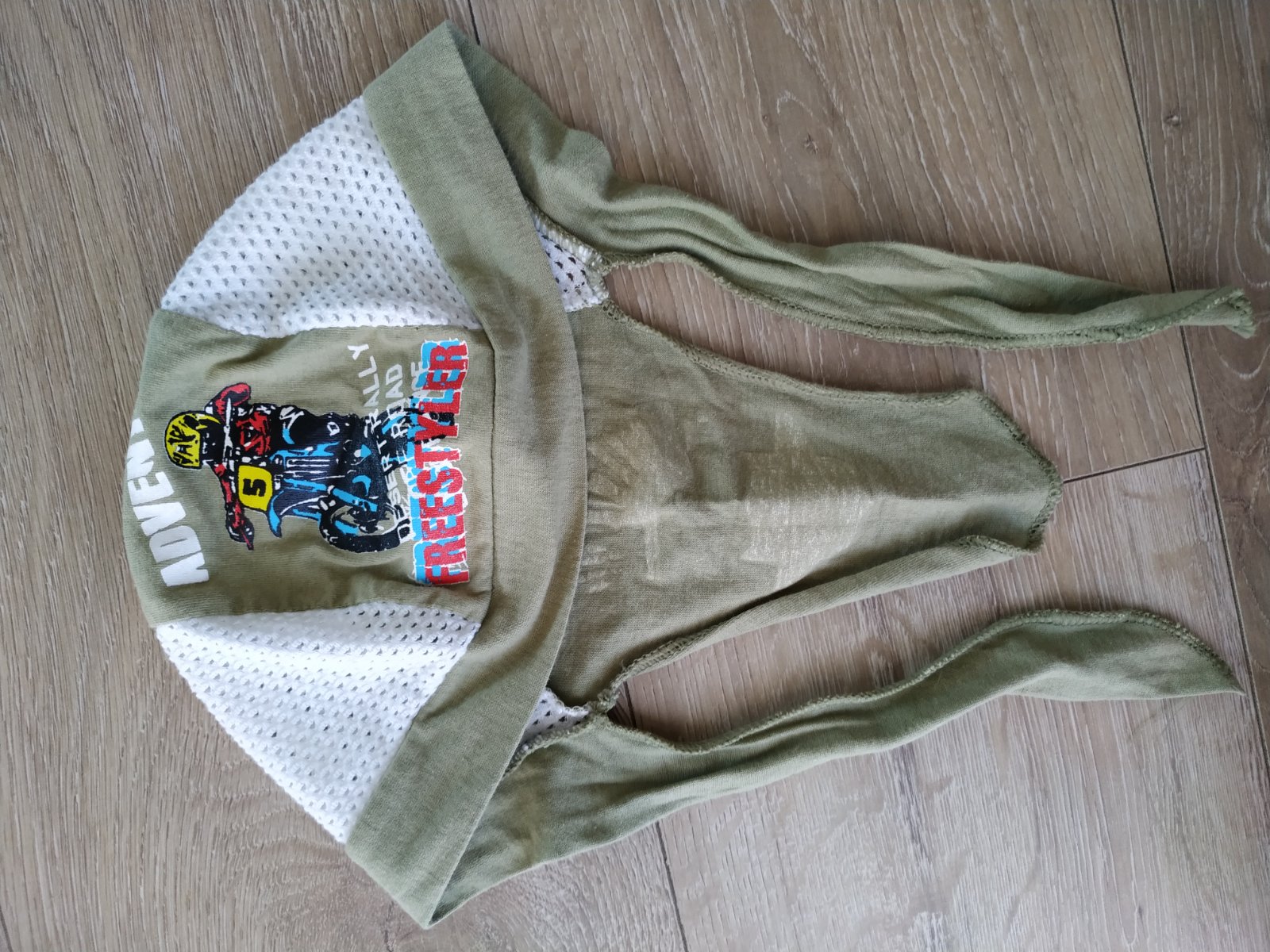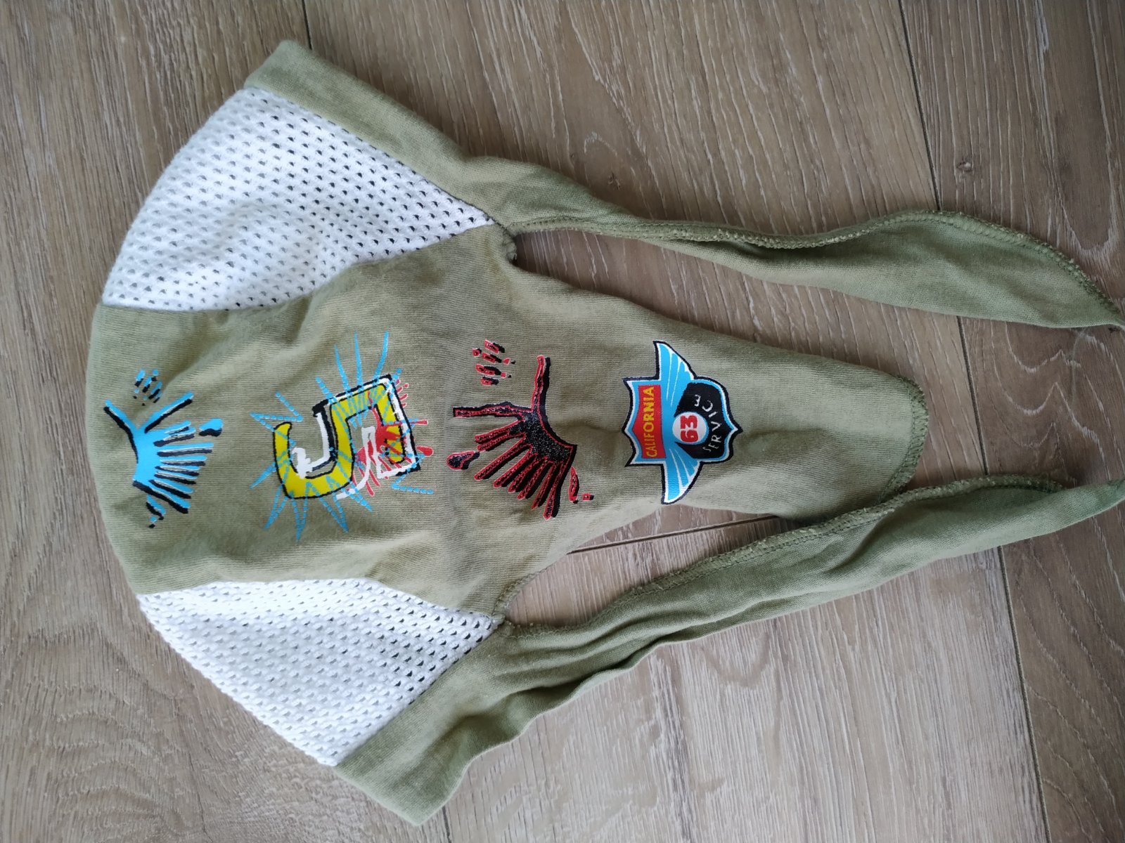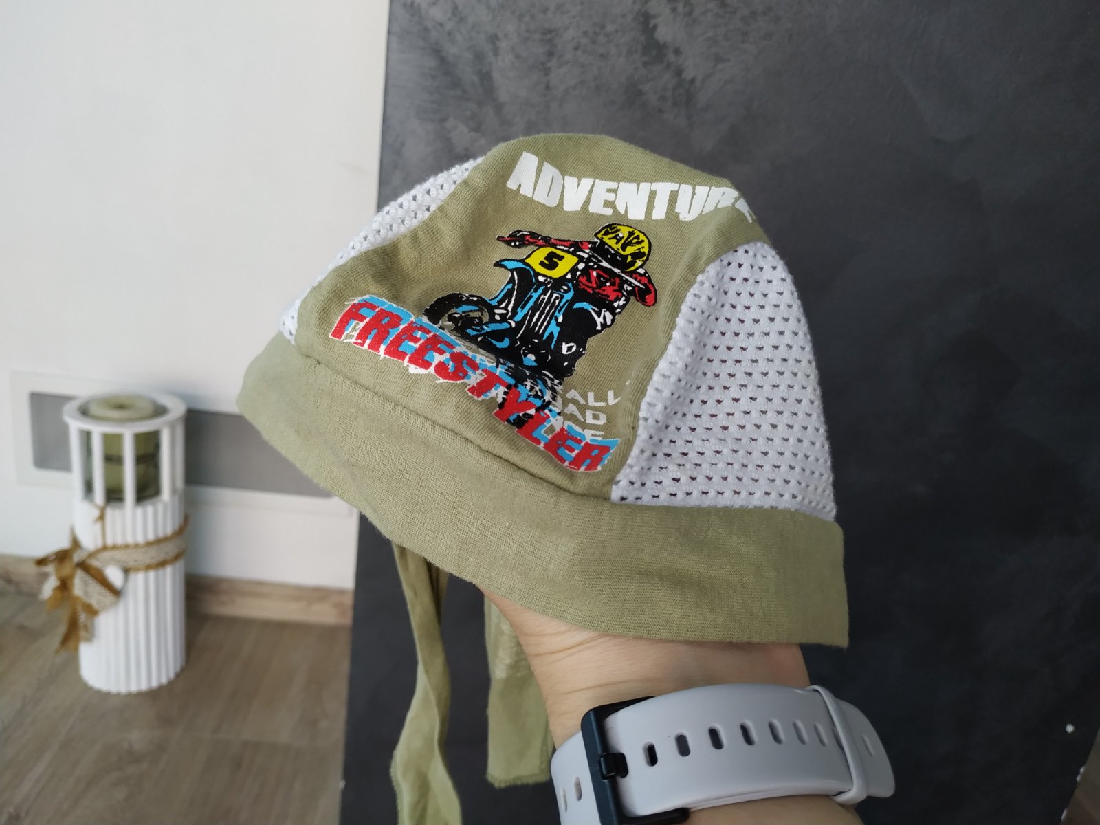 Letná čiapočka, iba jemne vyblednutá. Výborná na horúce letné dni. Zaviazovanie vzadu. Syn na foto mal 1,5 roka. Cena 1,70 € + pošt.