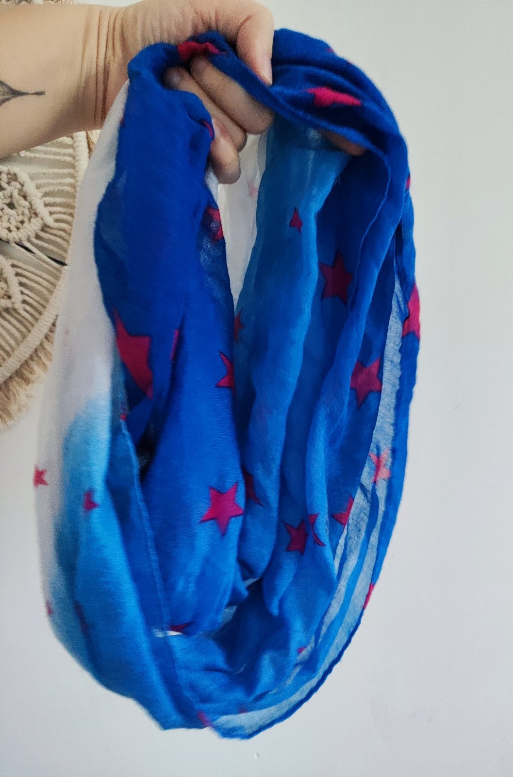 predám širokú maľovanú (štýl batika) šatku, je akokeby z dvoch vrstiev, strapce "posplietané"....