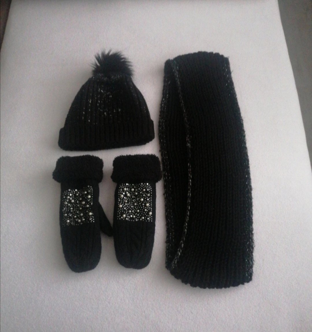 Pekná dievčenská súprava. Čiapka, šál a rukavice s kožušinou.