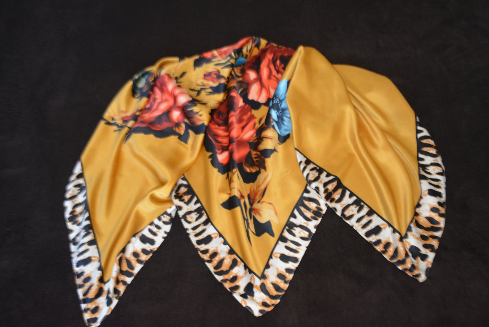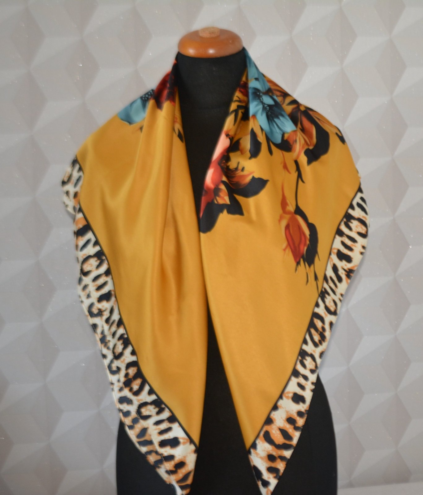 Veľká hodvábna šatka s potlačou kvetov, lem s jemným zvieracím motívom.