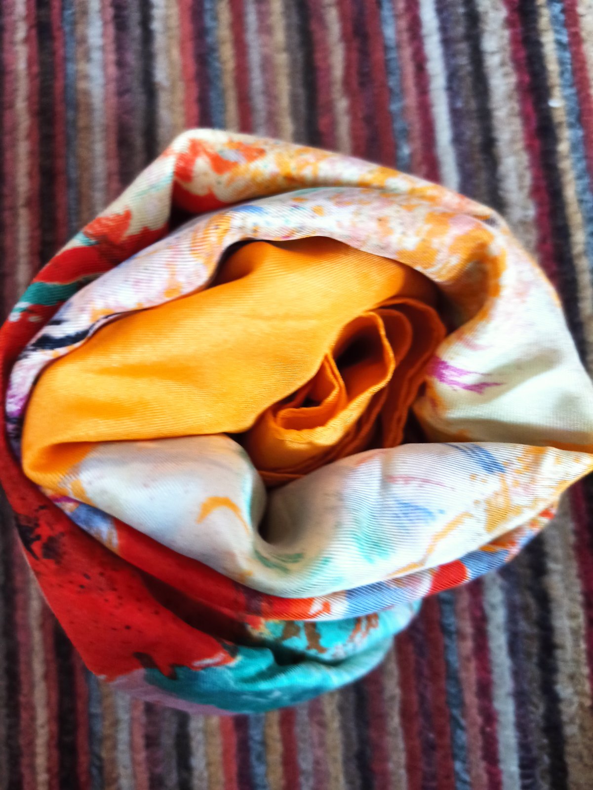 Nosena, pekný stav, oranžový okraj, nezeglila som ju, preto je pokrčené,