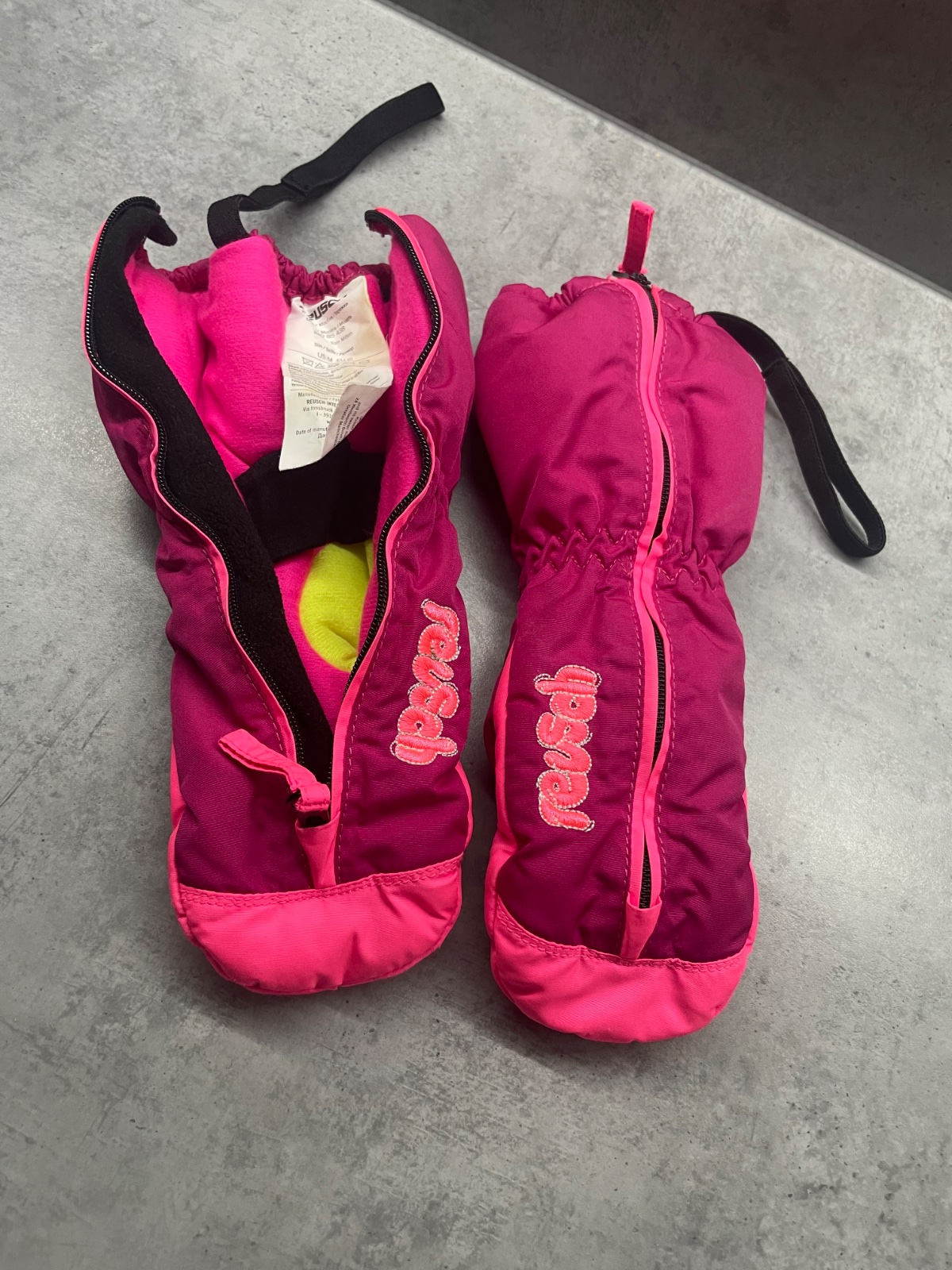 Nenosené ružové palčiaky s kožušinkou. Sú pletené a vnútri super teplé. Majú aj šnúrku, poprípade sa dá odstrihnúť. Celková dĺžka 27cm, od vrchu po kožušinu 18,5cm.