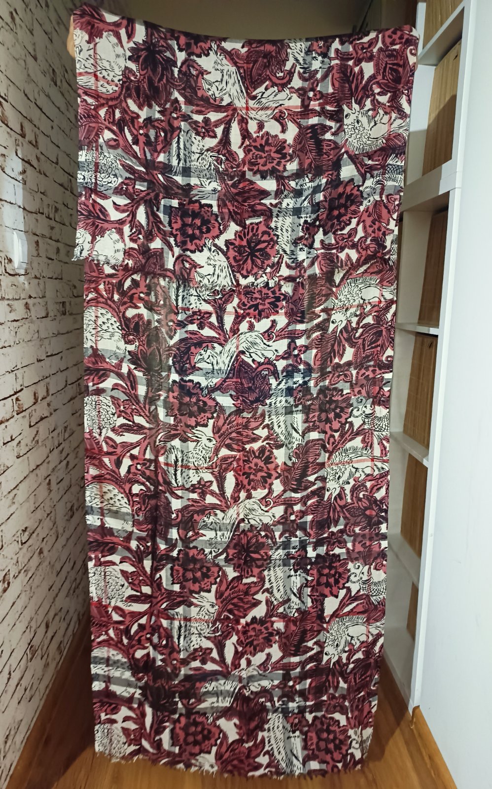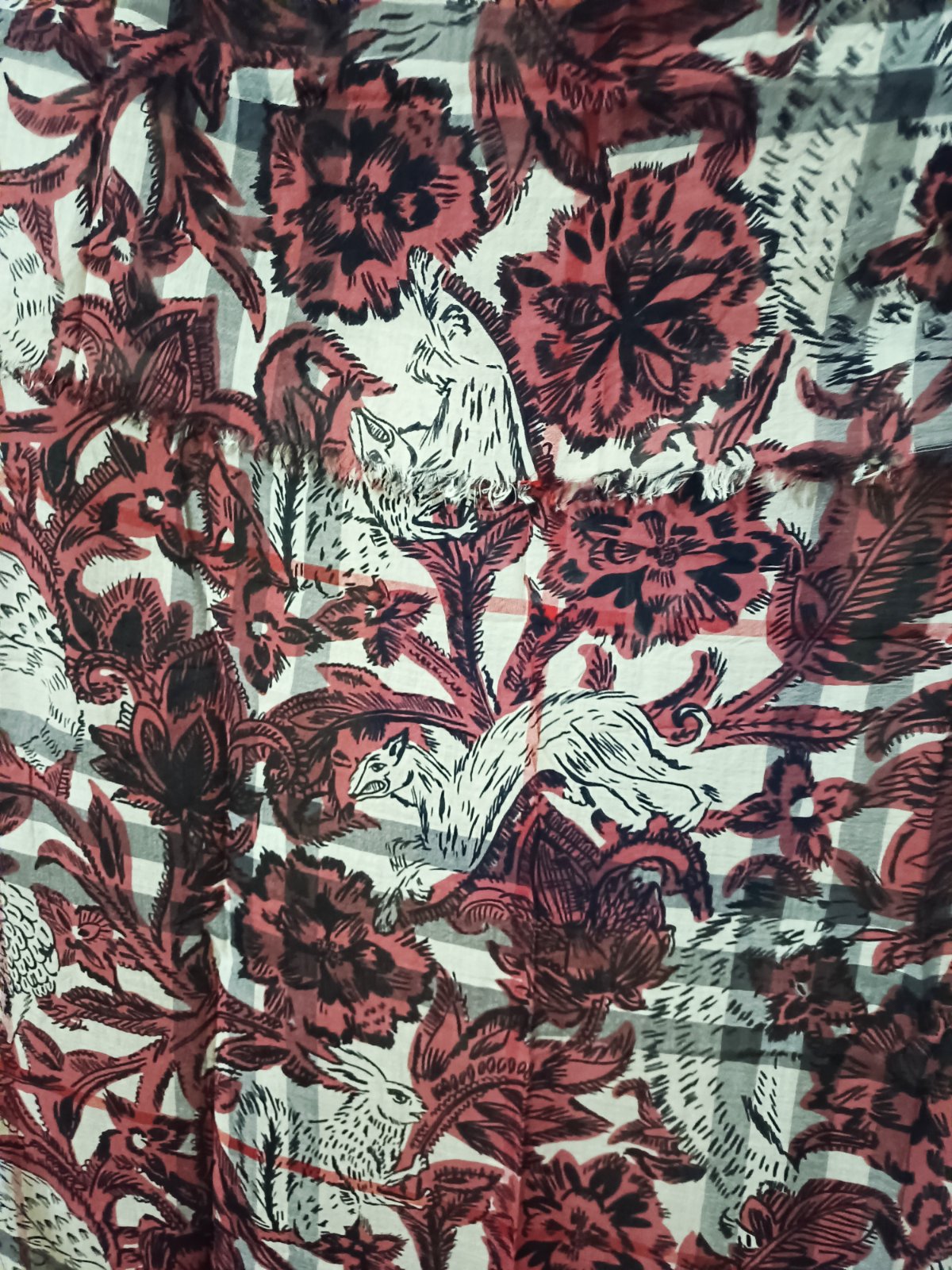 Veľký šál alebo pléd s výrazným potlačeným motívom – bordové kvety a medzi nimi biele zvieratá (vyzerajú ako líšky alebo vlci)