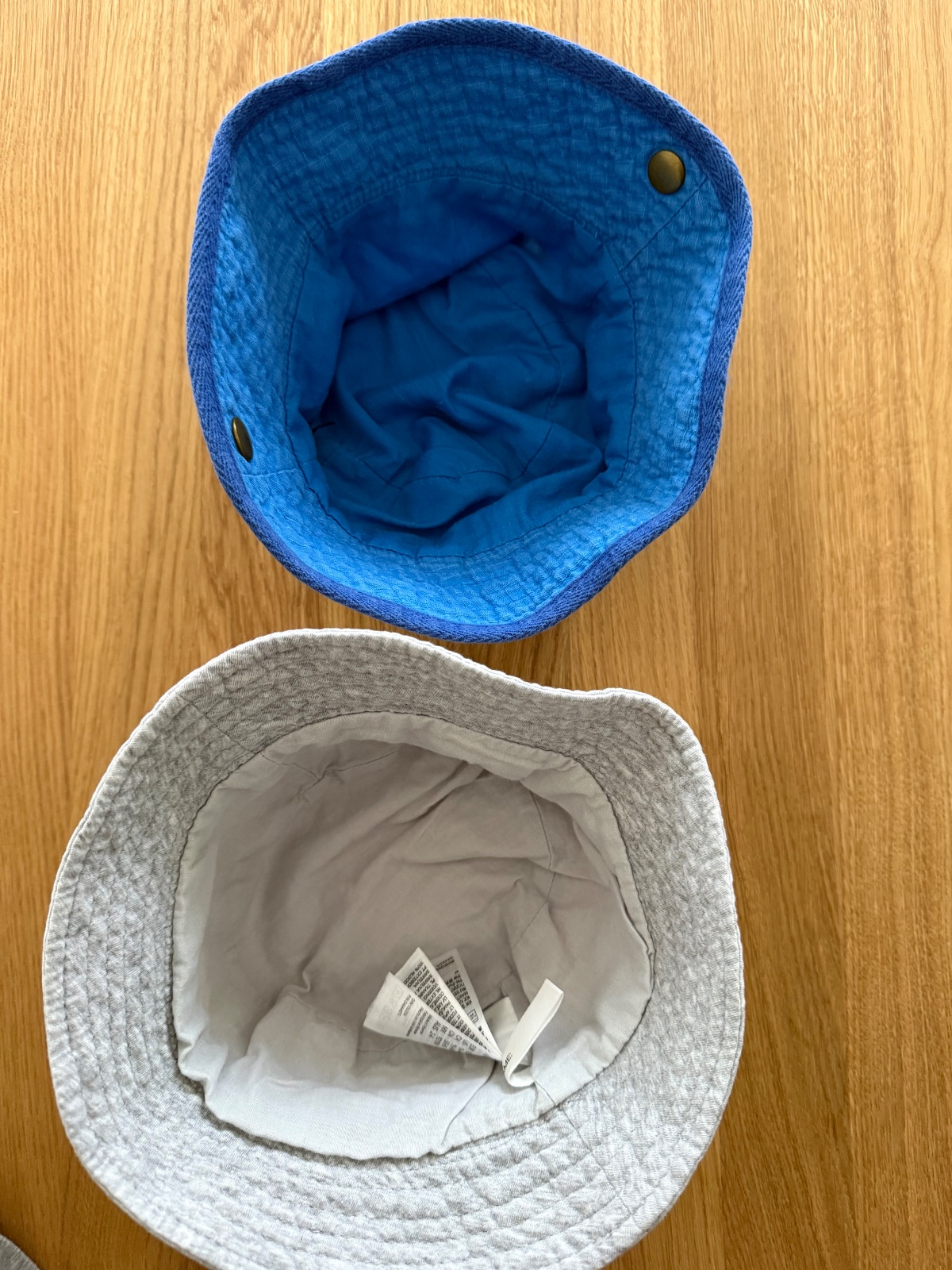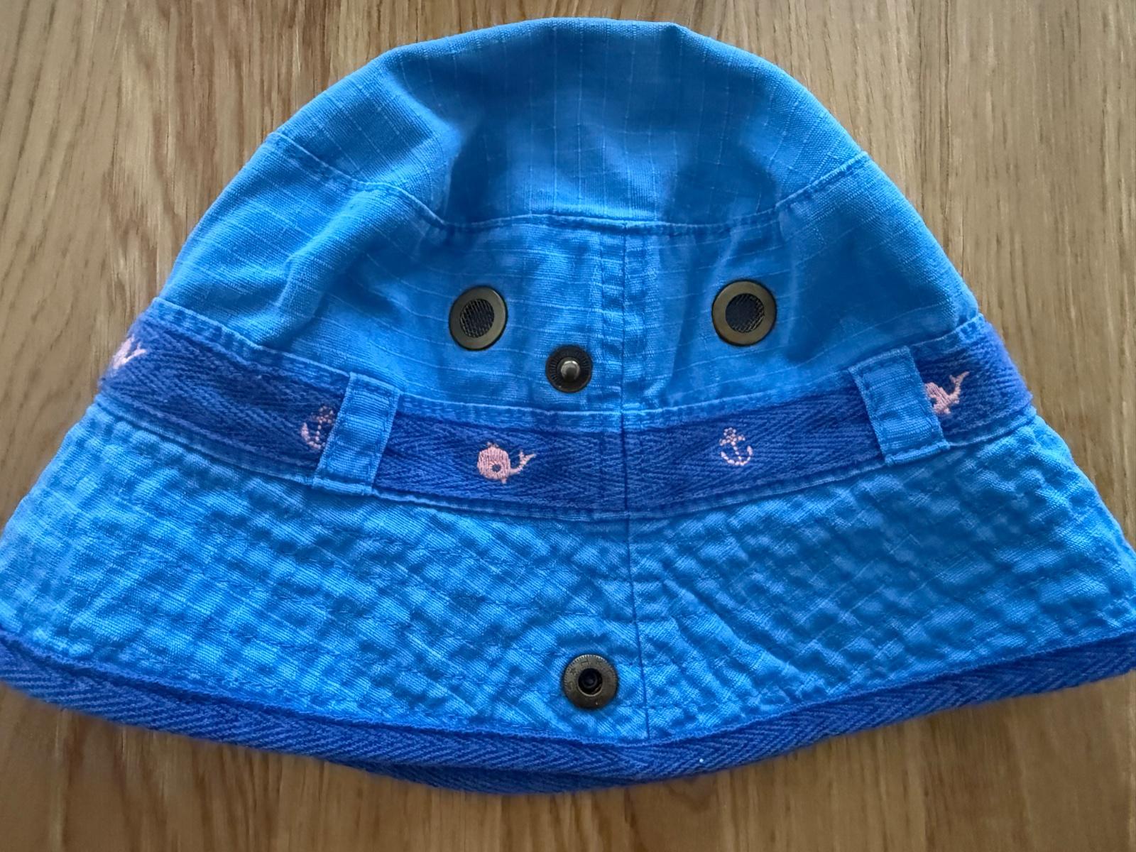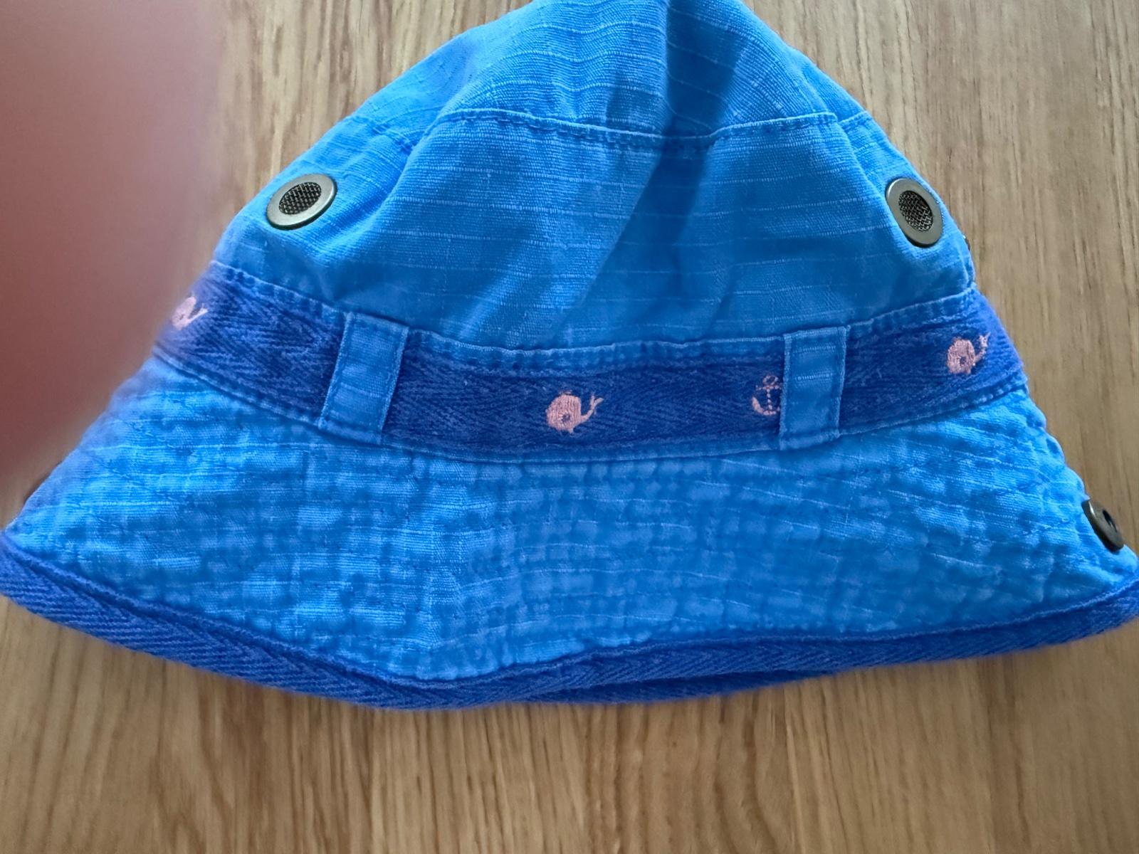 Klobuciky boli kupovane nove a nosil ich len moj syn. Sedy je H&M a velkost 92/104. Modry klobucik je Next, ma 2 cvocky, tym padom viete vypnut silt dohora. Vnutorna visacka je odstrihnuta kedze synovi vadila, ale velkost bude 92, klobuciky su zhruba rovnako velke - vid 2.foto.