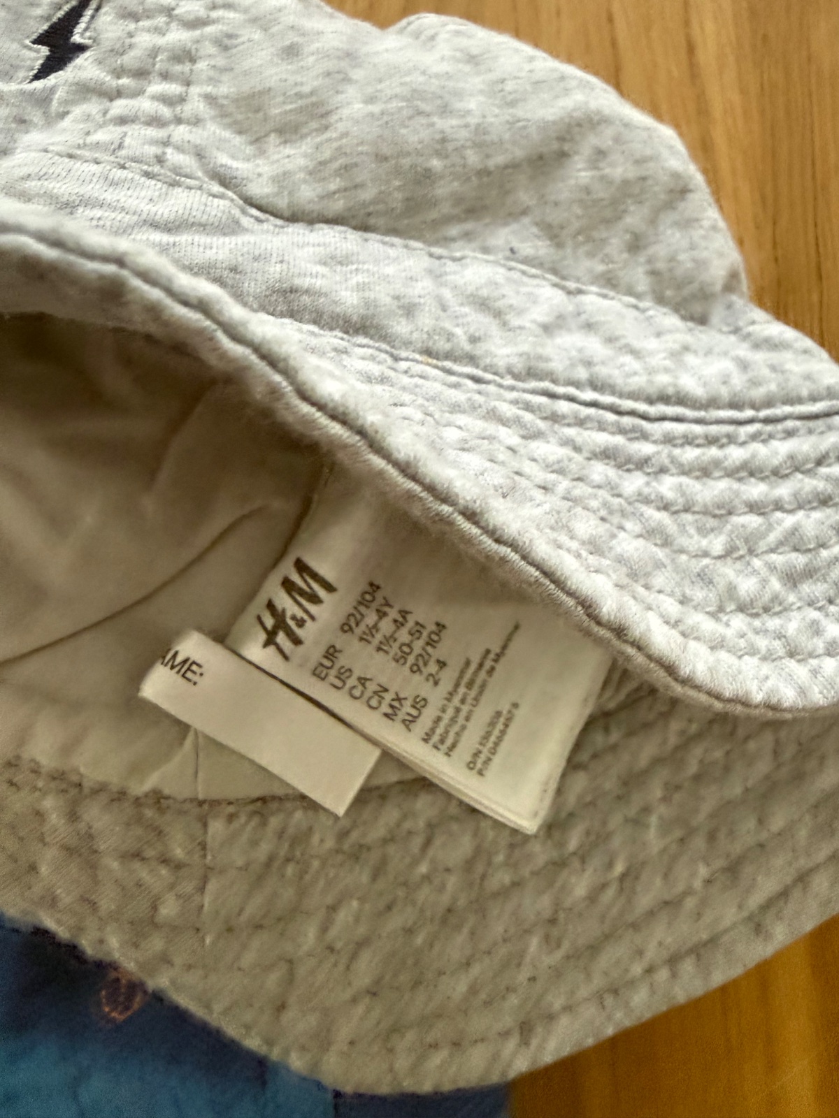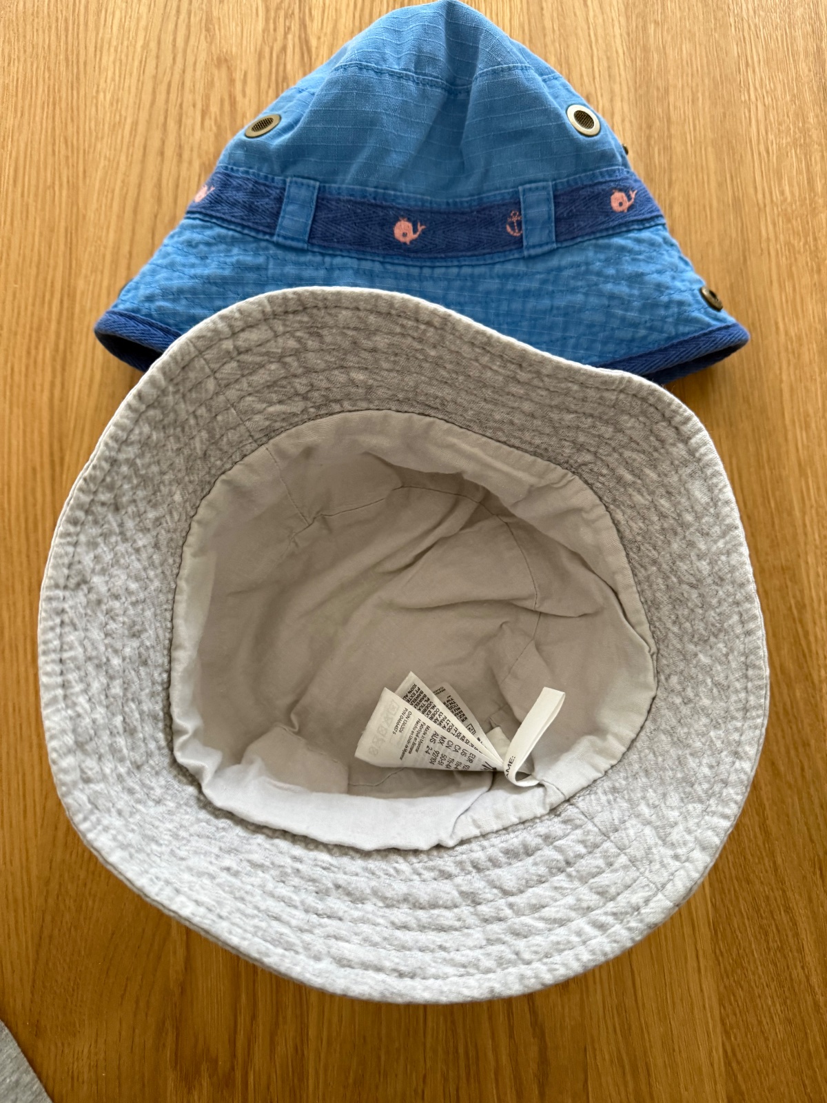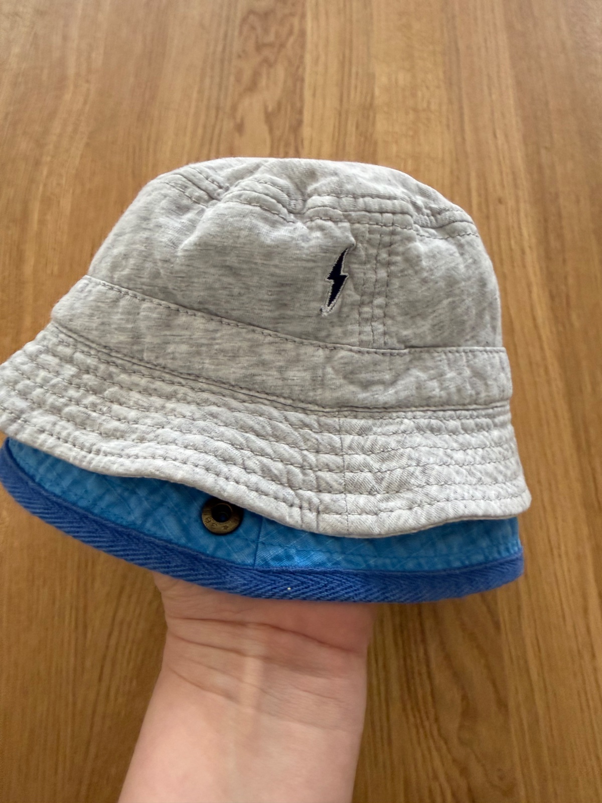 Klobuciky boli kupovane nove a nosil ich len moj syn. Sedy je H&M a velkost 92/104. Modry klobucik je Next, ma 2 cvocky, tym padom viete vypnut silt dohora. Vnutorna visacka je odstrihnuta kedze synovi vadila, ale velkost bude 92, klobuciky su zhruba rovnako velke - vid 2.foto.