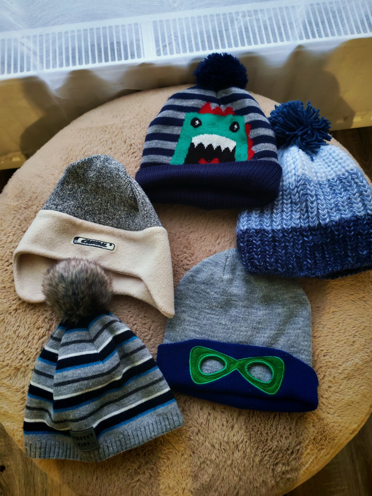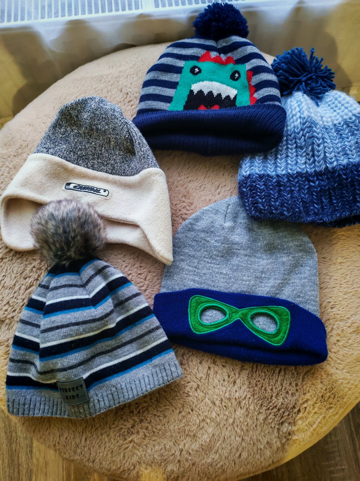 Hrubé pletené čiapky každá za 050 eur, tenké čipky zn. Broel za 1 euro