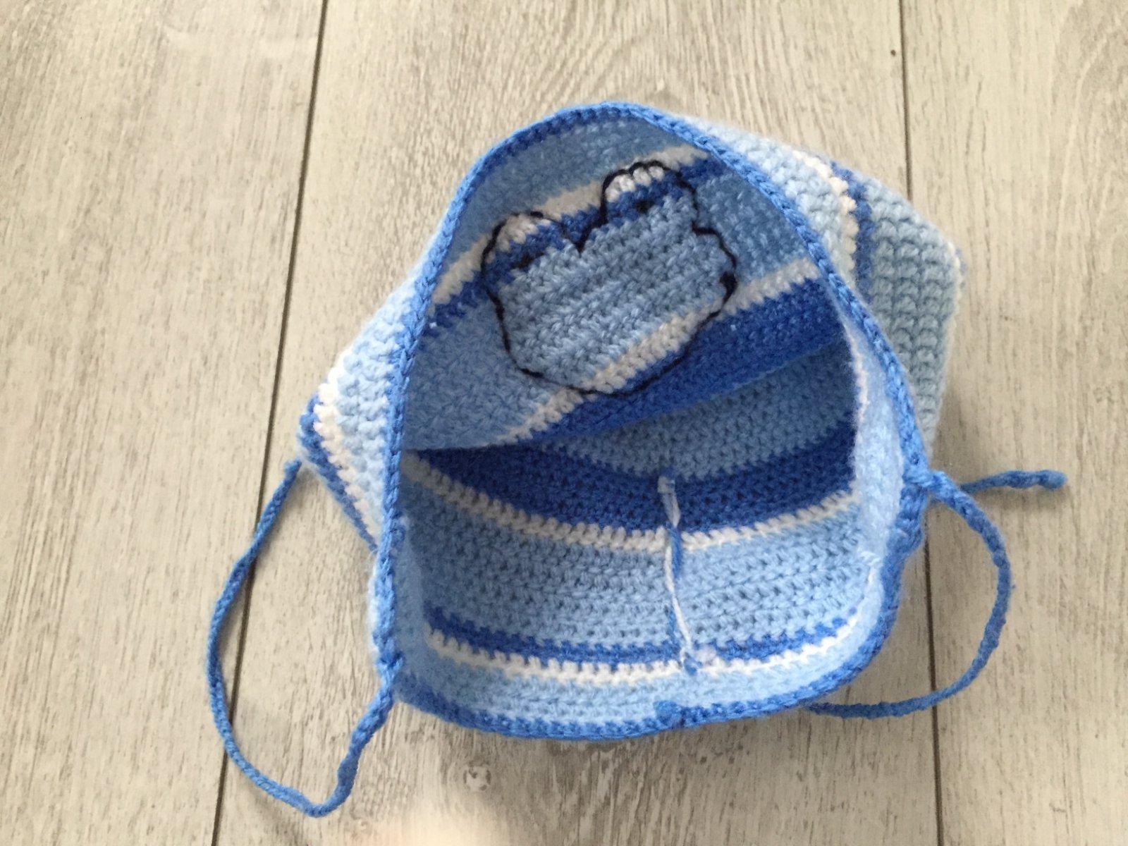 Hackovana ciapocka malo nosena. Sirka 23cm, vyska 17cm. Rukavicky su trocha uzsie, ale pekne drzia na ruckach, dlzka 12cm.