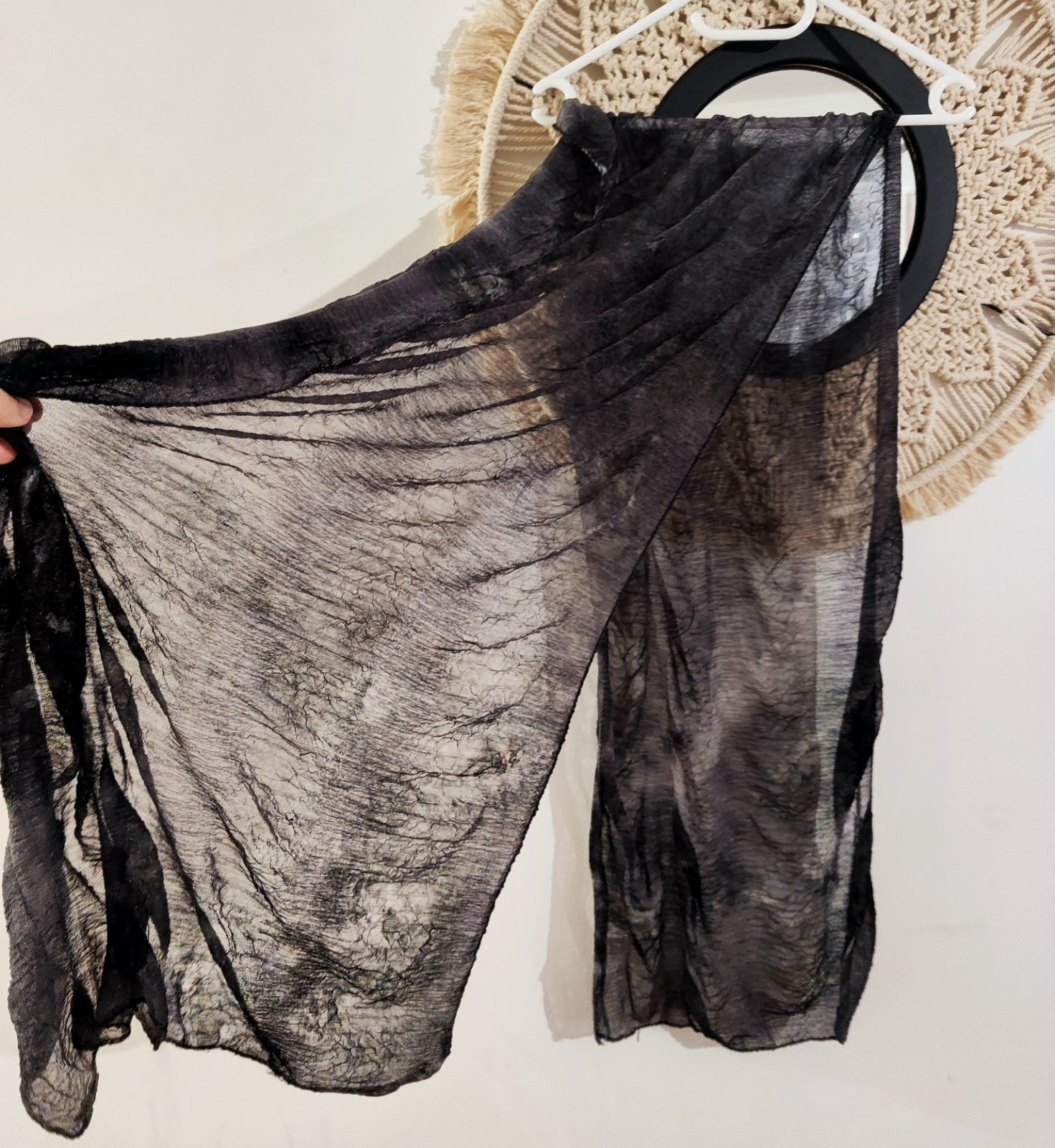 Šatka tmavo sivá. Nosená, na pár miestach zahrnutá nitka (viď foto), ale dá sa ešte ponosiť. 57x57 cm