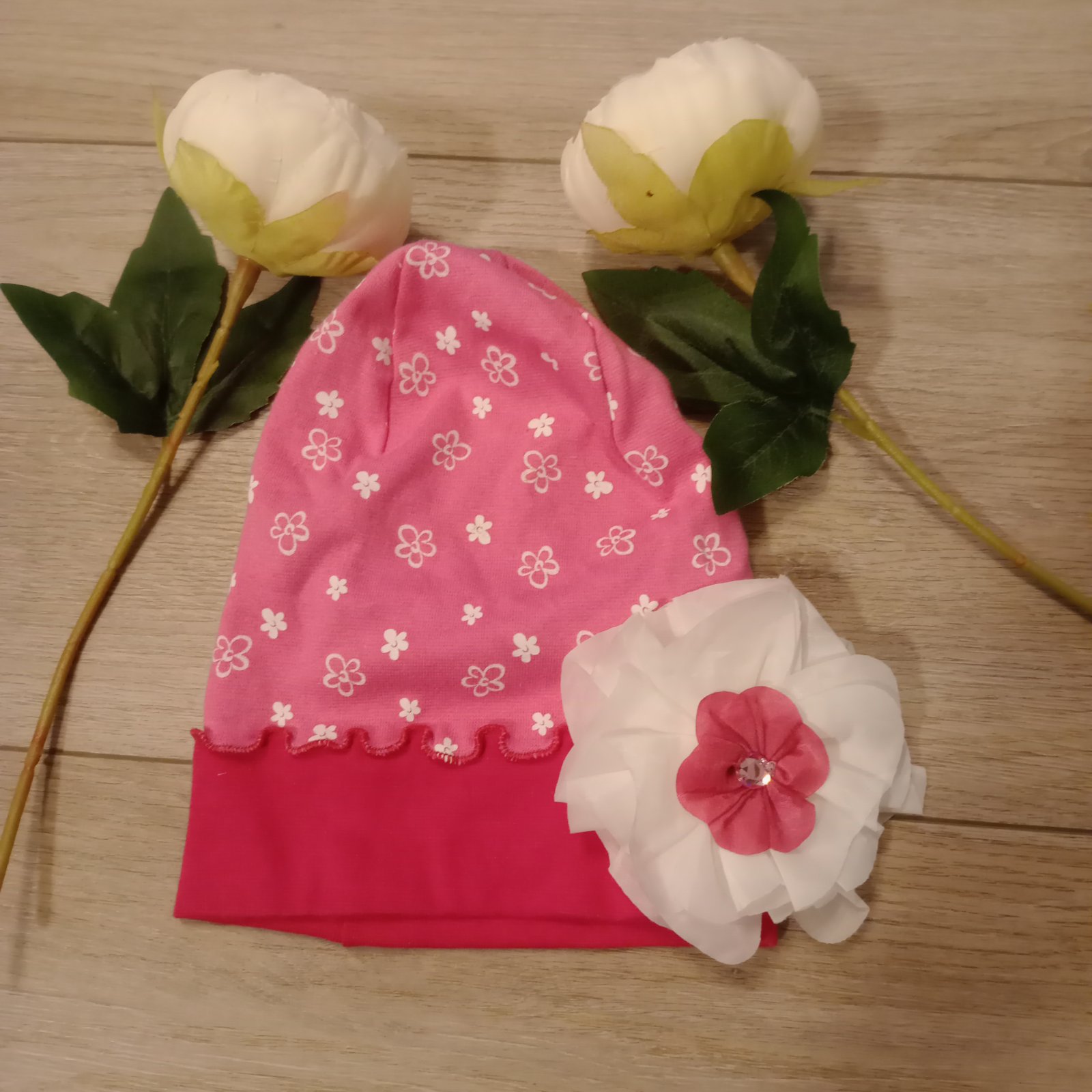Na 18-24 mesiacov, na obvod 48-50 cm, je to prechodná čiapka, vzadu vyzerá ako šatka.