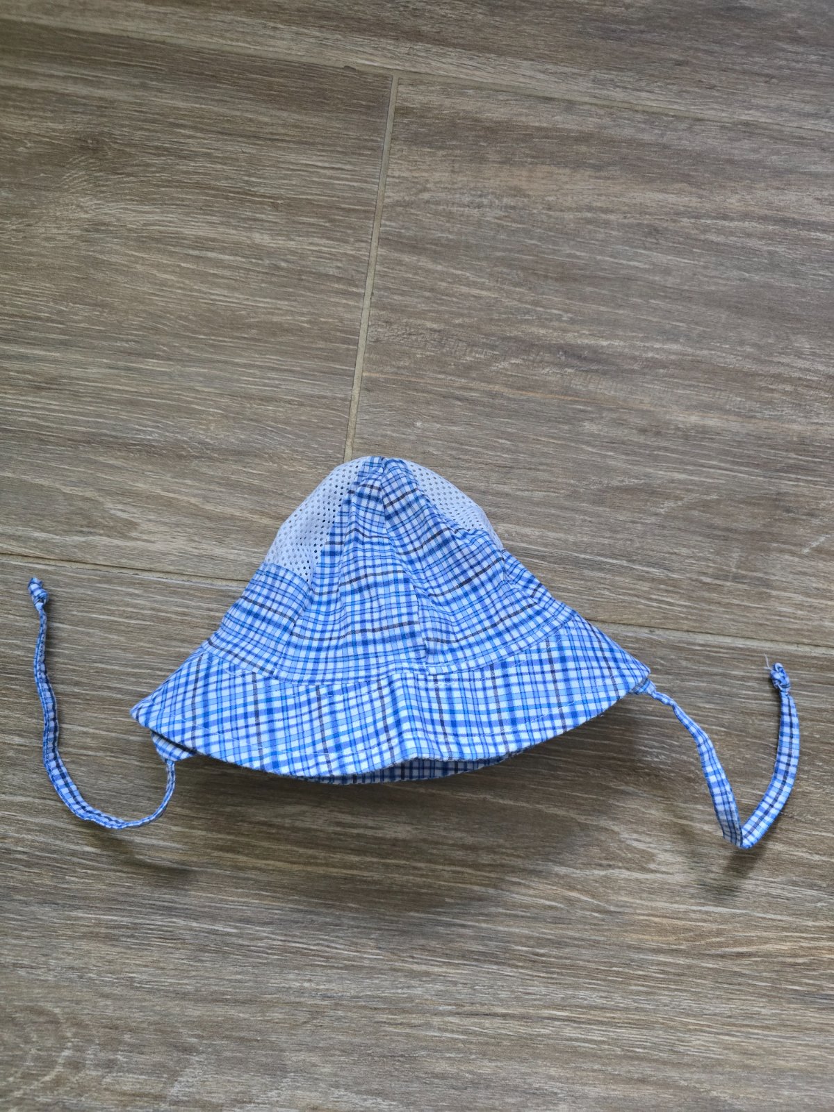 Svetlo.modrý klobúčik kombinovaný s bielou farbou, s viazaním na ušká. Top stav. Veľkosť uvedená na štítku: 48, my sme ho nosili vo veku 5-8 mes.