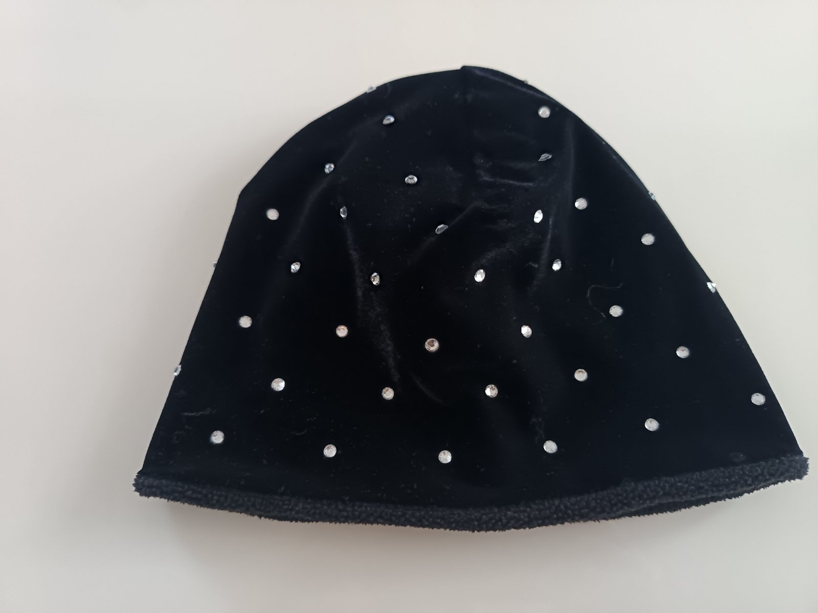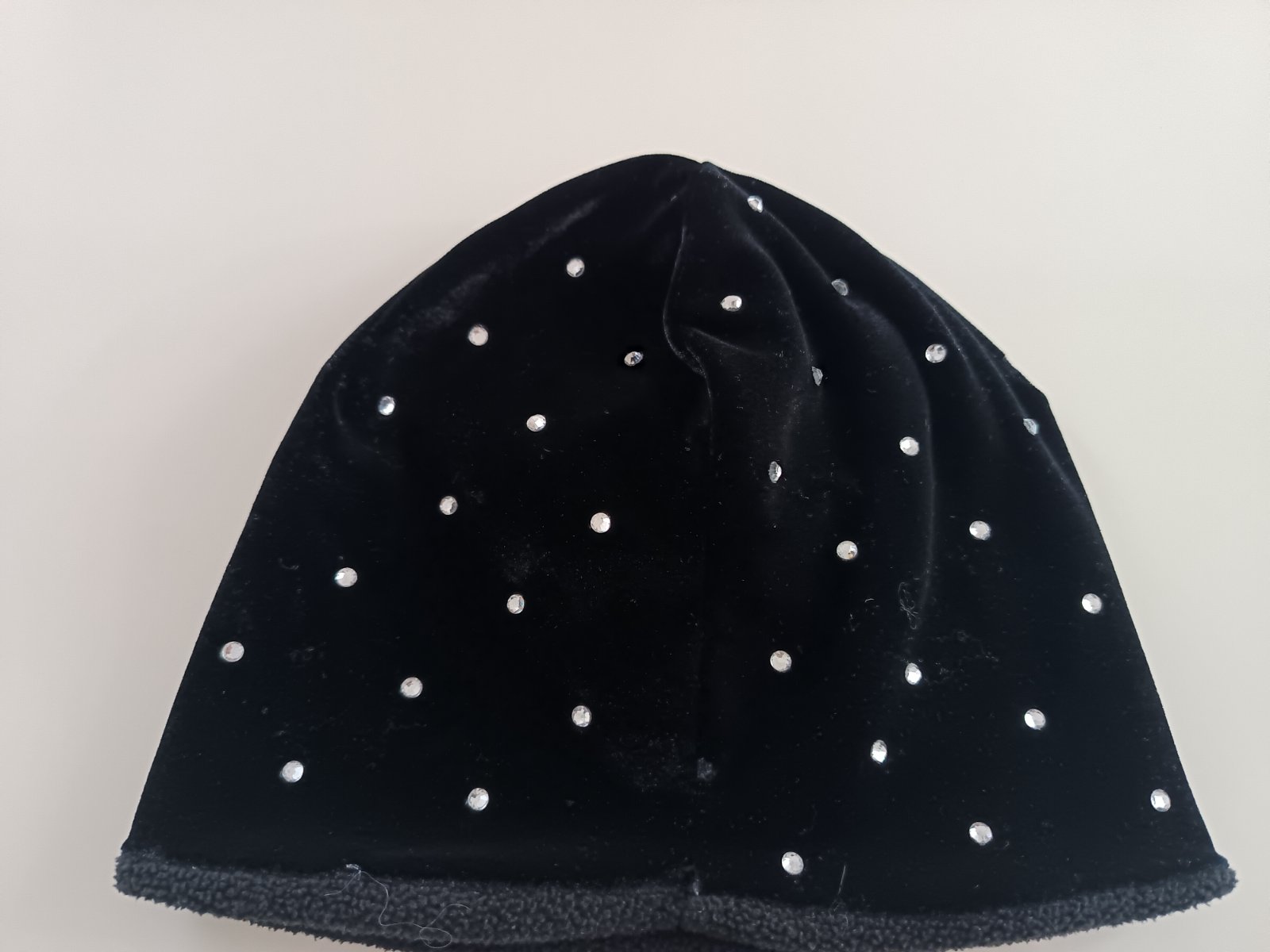 Čierna čiapka s kamienkami vhodná na prechod a zimu, podšita fleesom, bez poškodenia, celkový obvod je cca 49-50cm