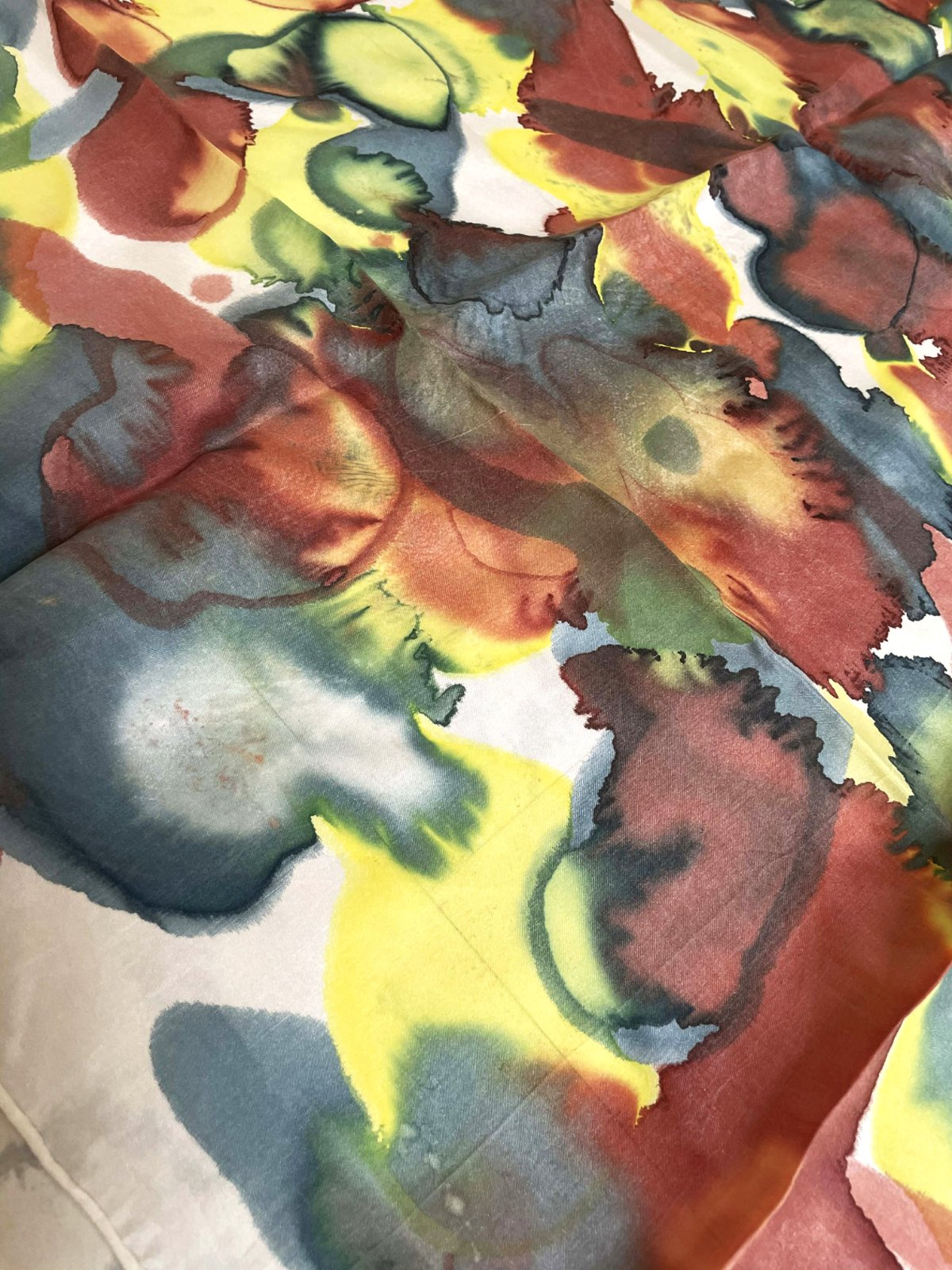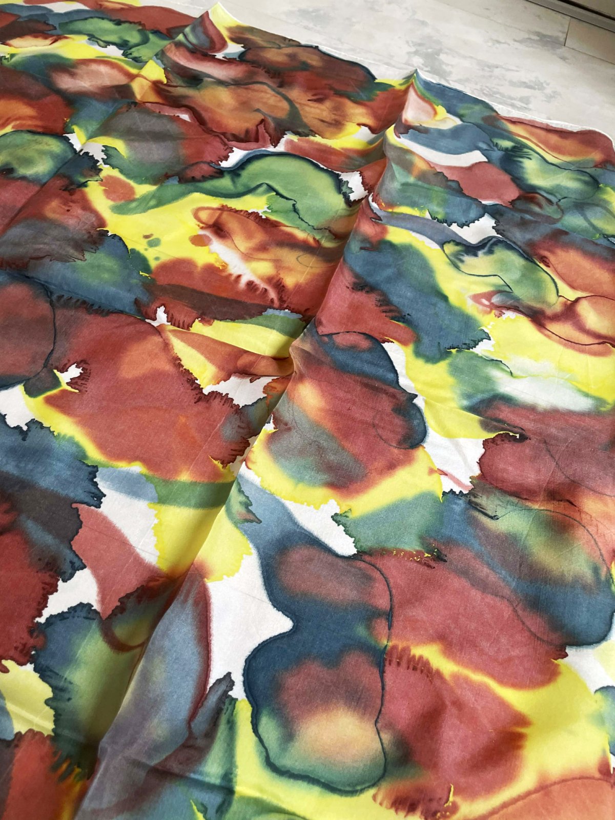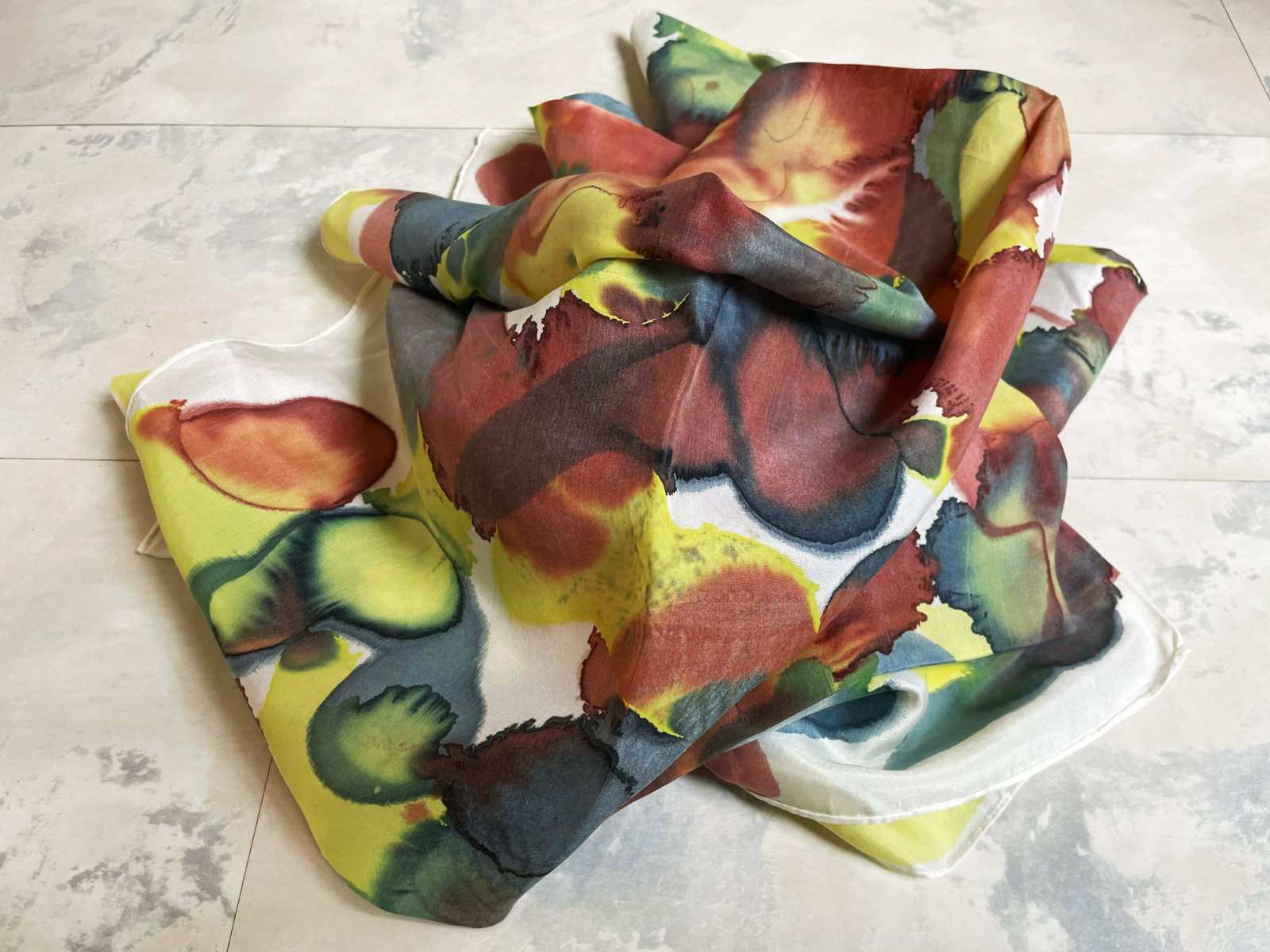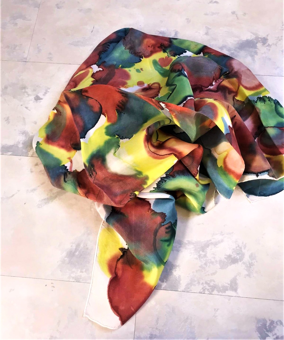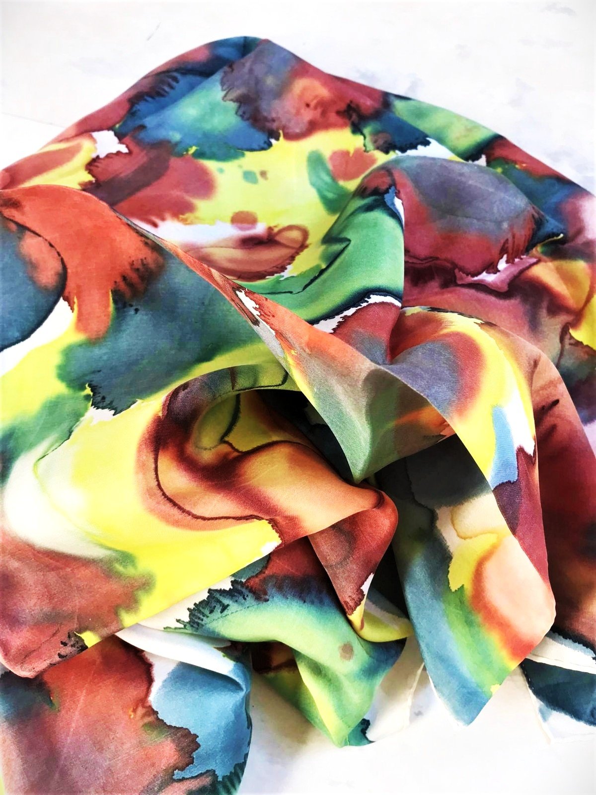 má abstraktný dizajn pripomínajúci akvarelovú maľbu so zmesou žltej, červenej, zelenej a tmavomodrej farby - elegantný a luxusný doplnok na oživenie jednoduchého outfitu.