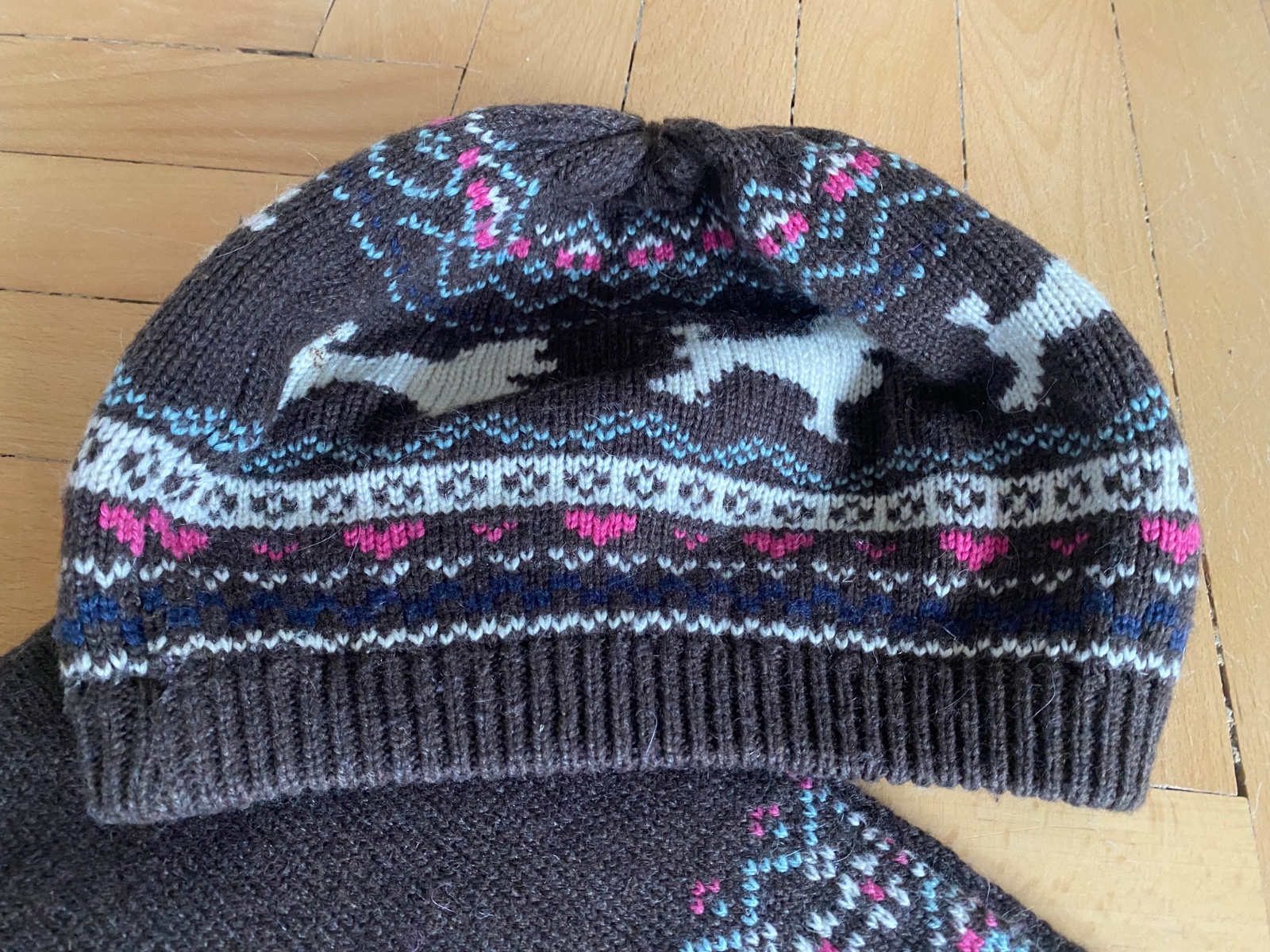 Set je v zachovalom stave, na spodnom leme čiapky na dvoch miestach vidno akoby žmolky, takú pocuchanú vlnu na povrchu, viď foto, ale je to zozadu, asi ako sa zrela čiapka o golier bundy.