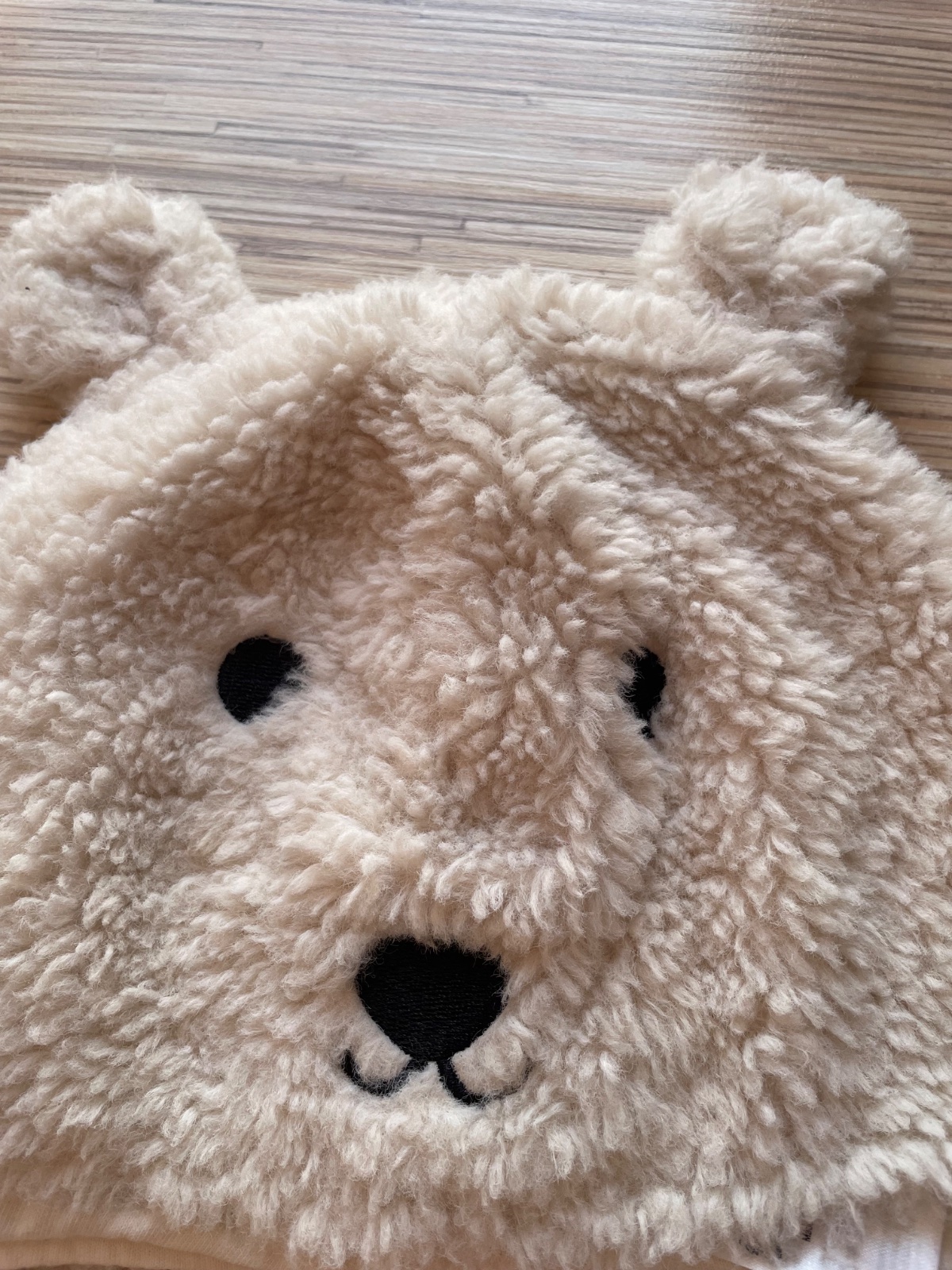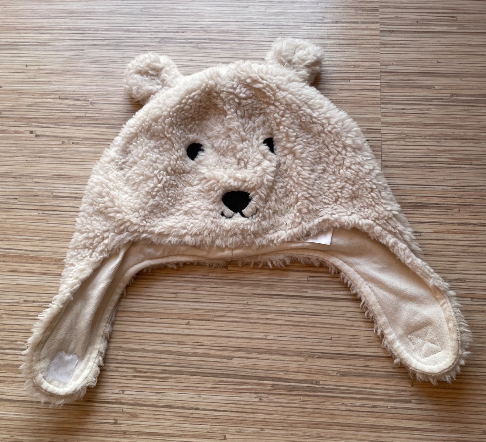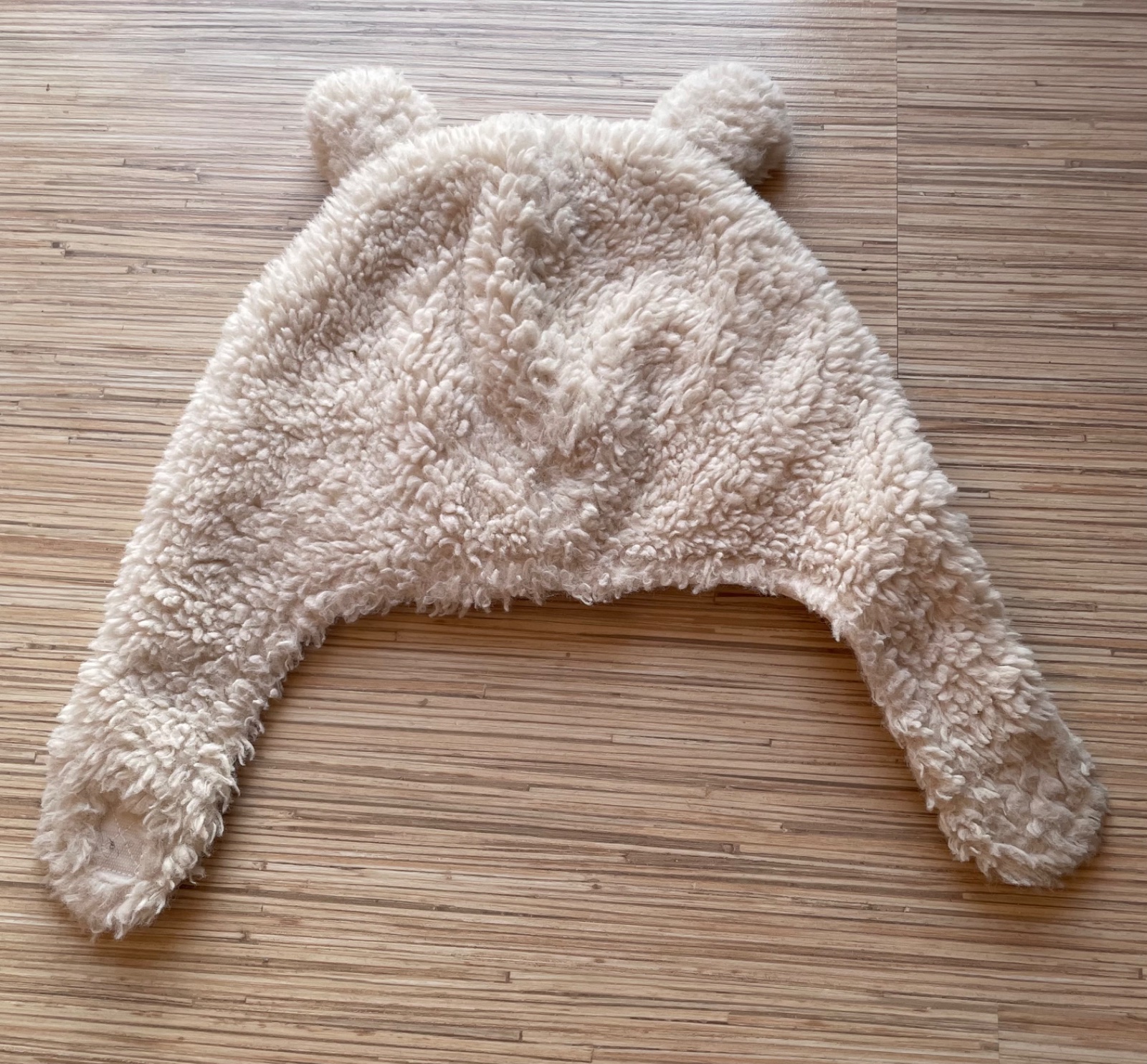 Kremova plysova jemna ciapka s uskami so zapinanim na suchy zips, velkost 92, suchy zips lepi, drzi, tak jemnejsie, uz si nepamatam ako drzal predtym.