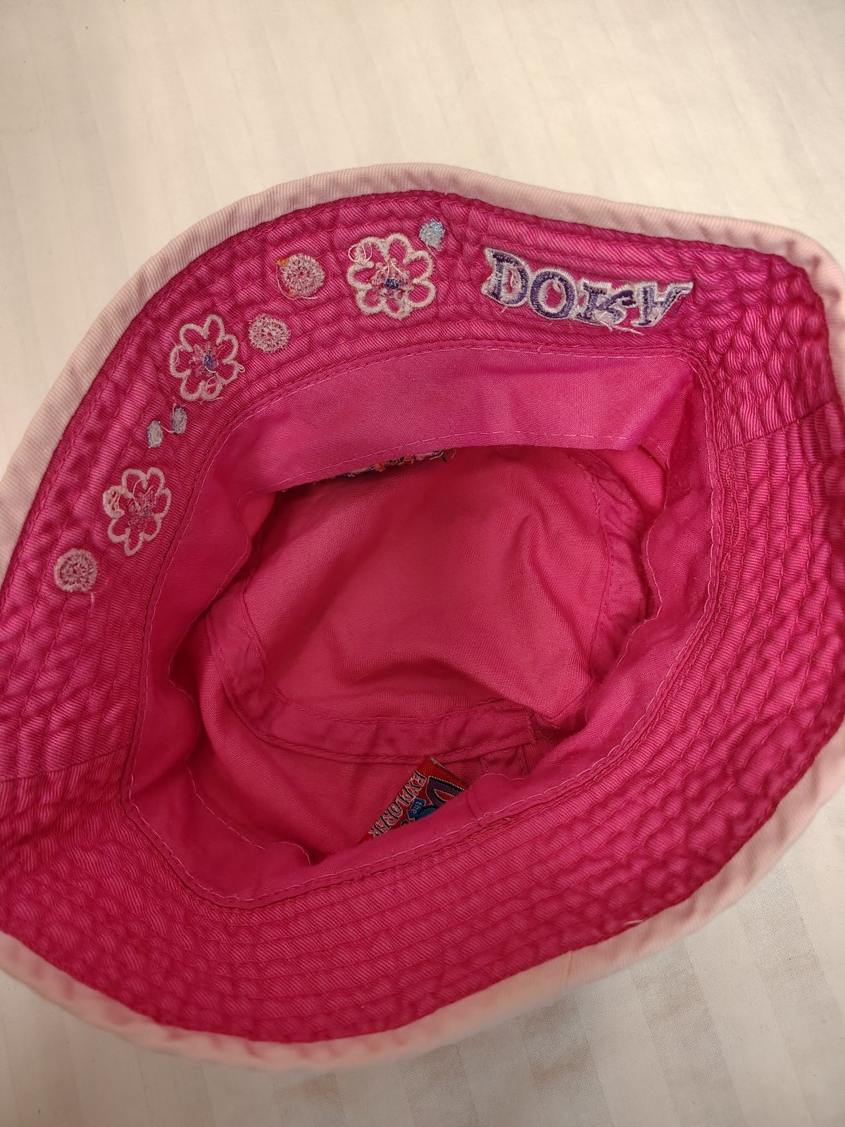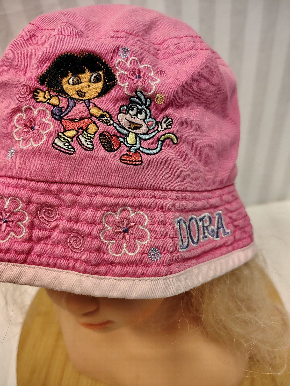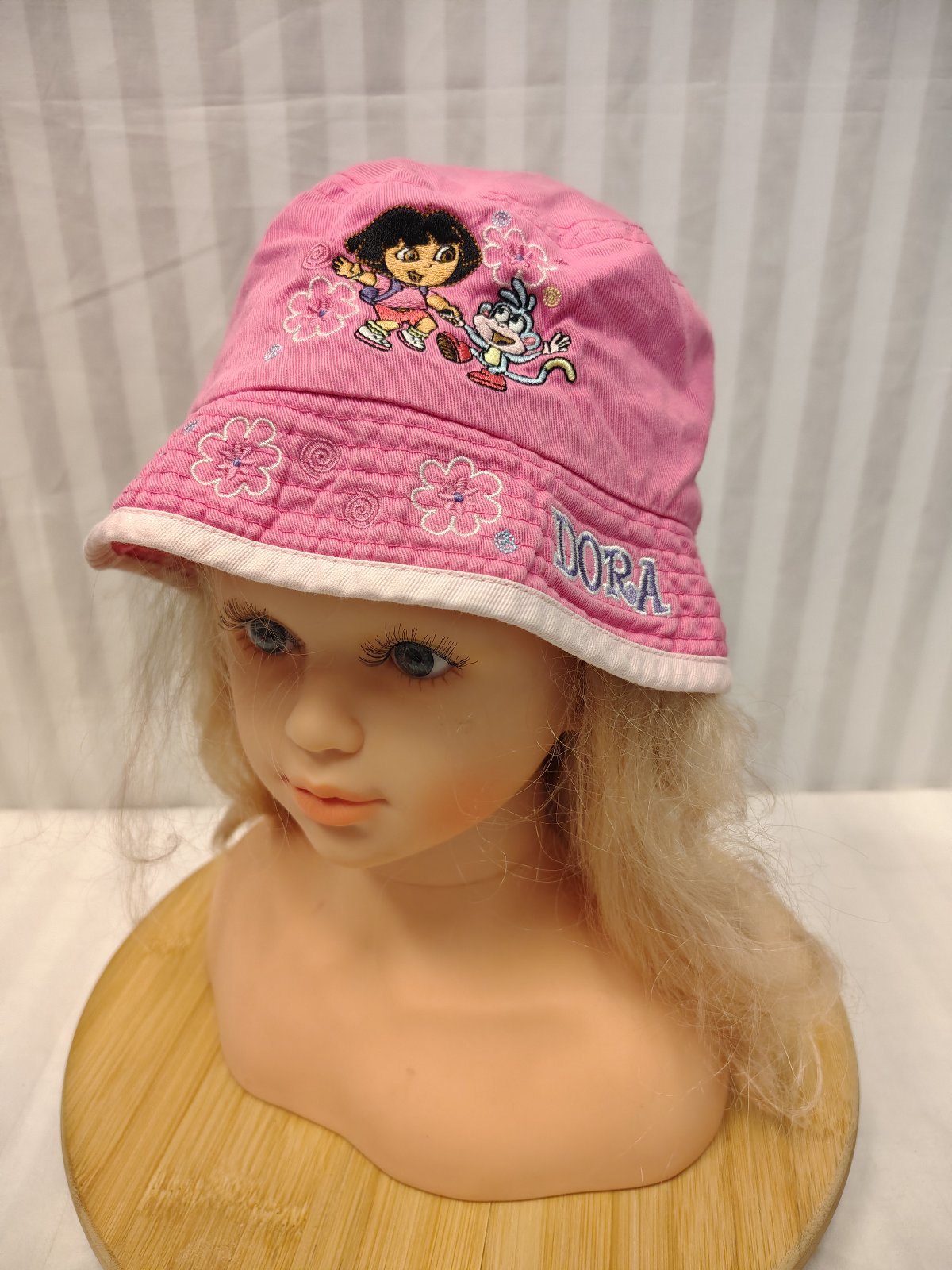 Dievčenský klobúčik Dora Prieskumníčka, č. 3006, obvod 53 cm, ide o krásny detský klobúk typu „bucket hat“ v sýtoružovej farbe s motívom obľúbenej rozprávky Dora the Explorer (Dora a Boots). Ide o kvalitný, oficiálne licencovaný produkt (Viacom / Nickelodeon). Klobúčik má pekné detaily – vyšívaný nápis „DORA“ a kvietky. Ide o starší, originálny kúsok, ktorý v bežných obchodoch už nezoženiete. Poteší každú malú fanúšičku Dory.