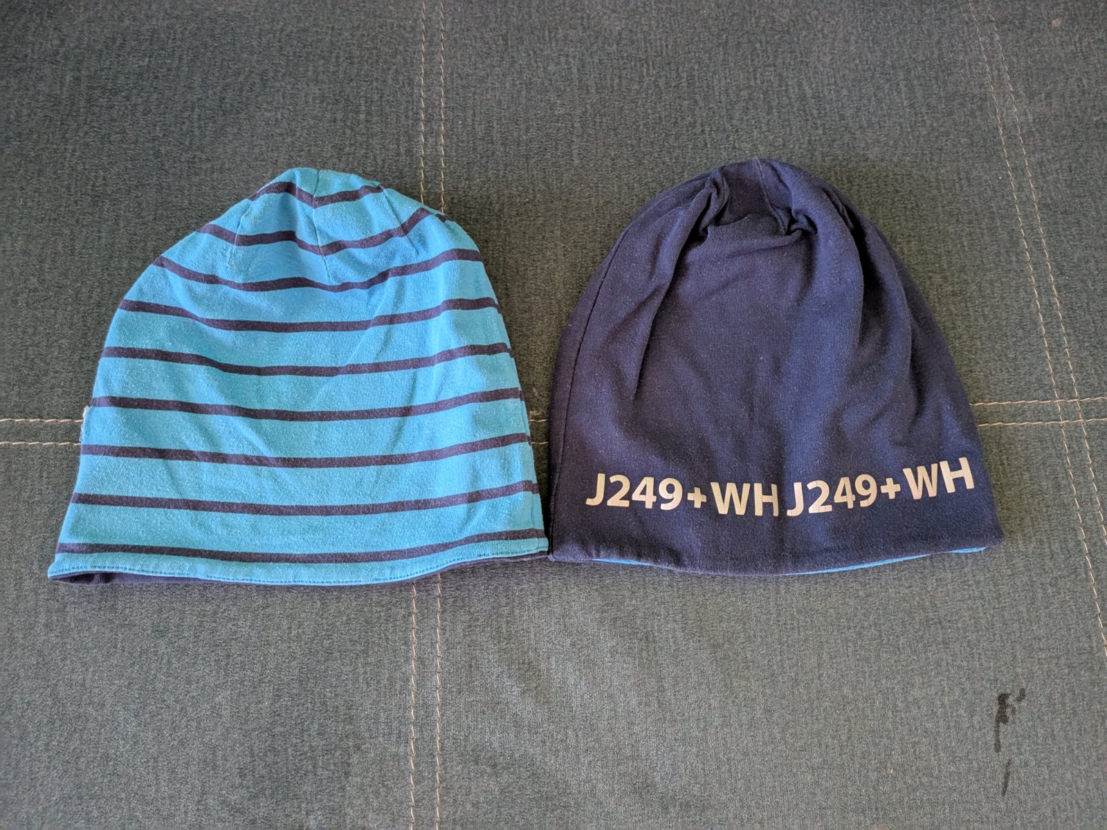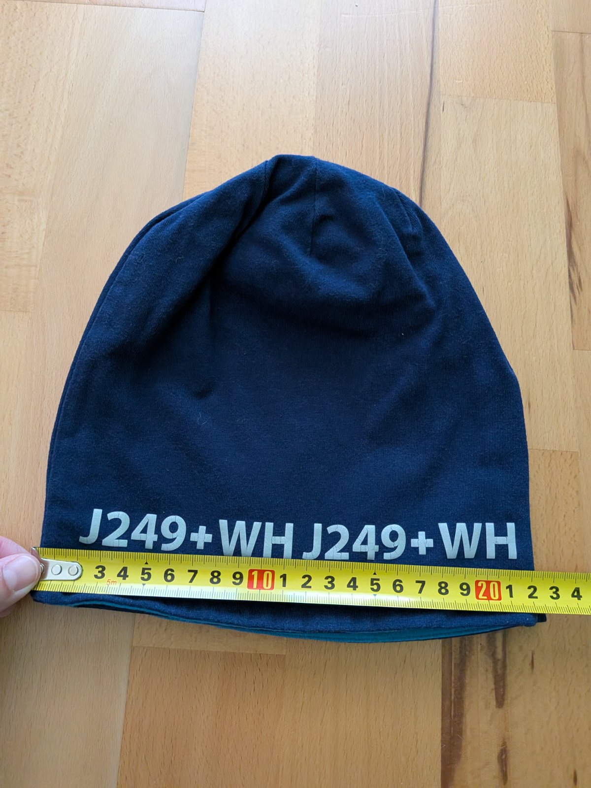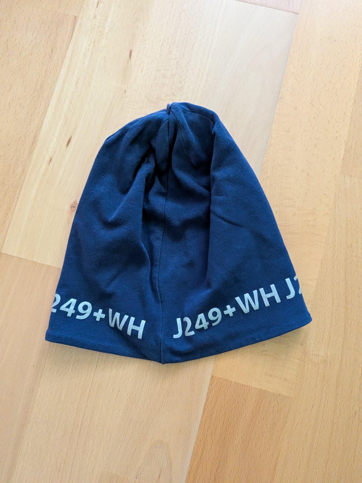 Detské čiapky z Tchiba s reflexným nápisom. Veľkosť 54 cm. Lístok je odstrihnutý - nosili ju aj naruby.