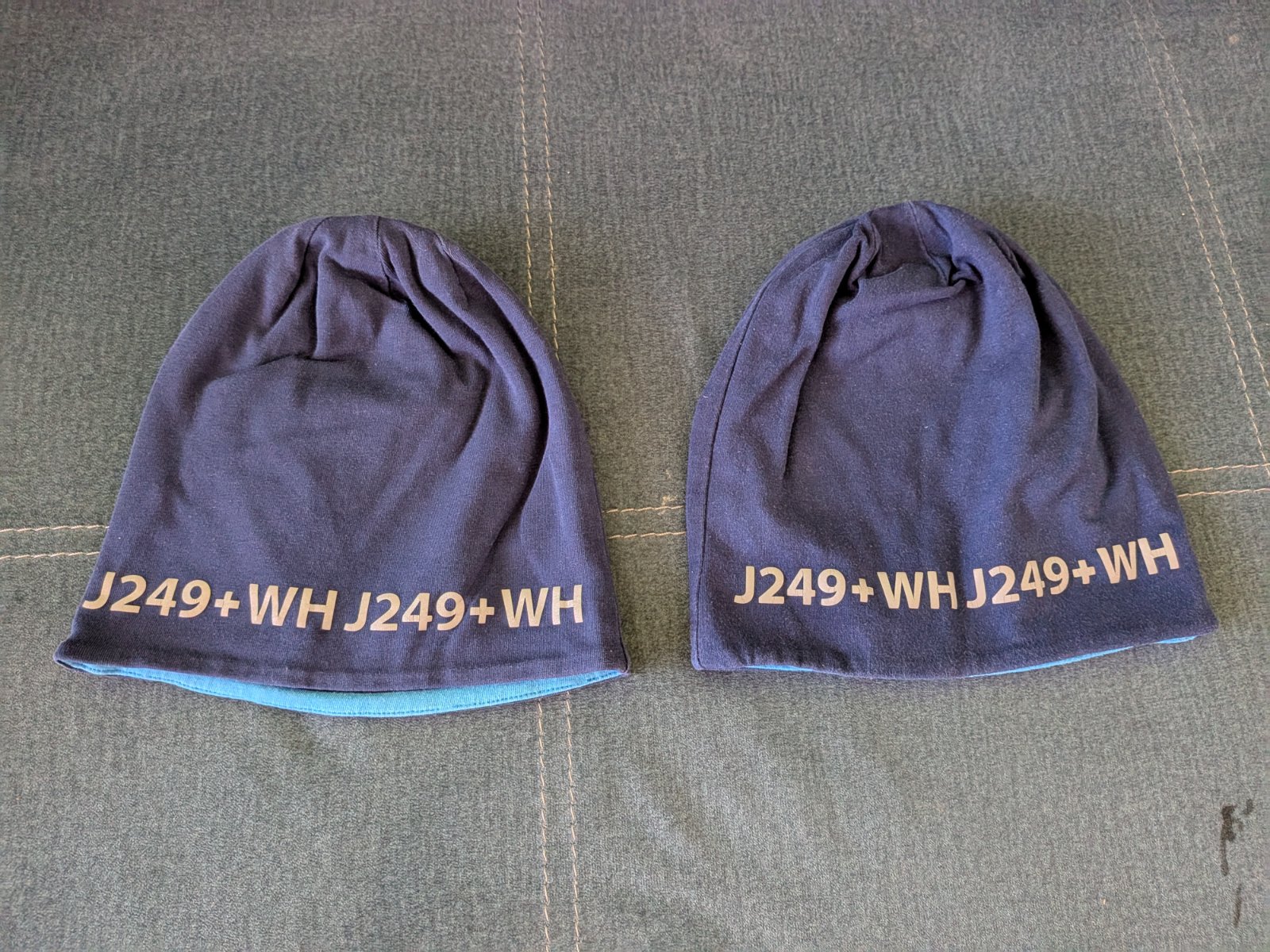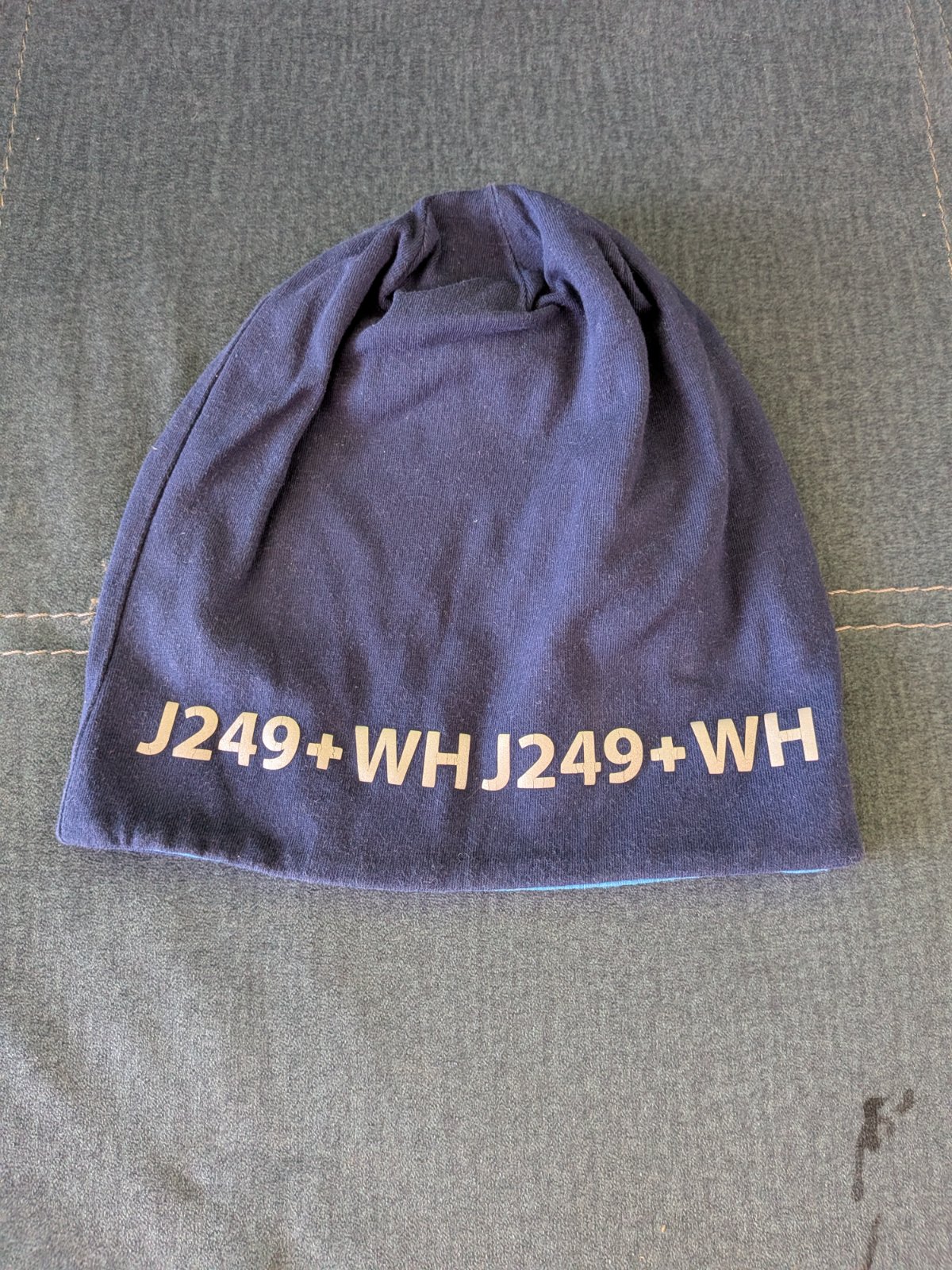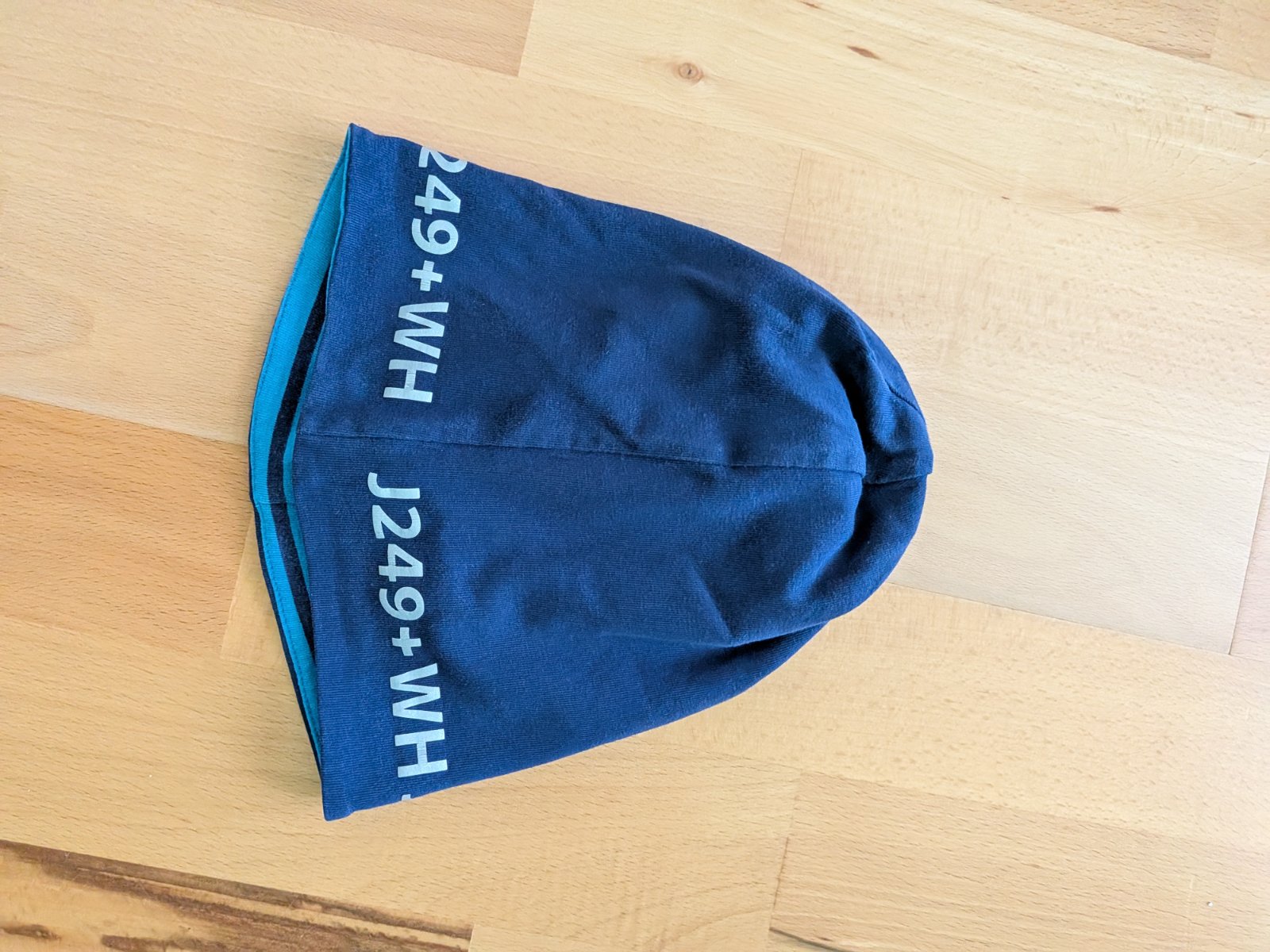 Detské čiapky z Tchiba s reflexným nápisom. Veľkosť 54 cm. Lístok je odstrihnutý - nosili ju aj naruby.