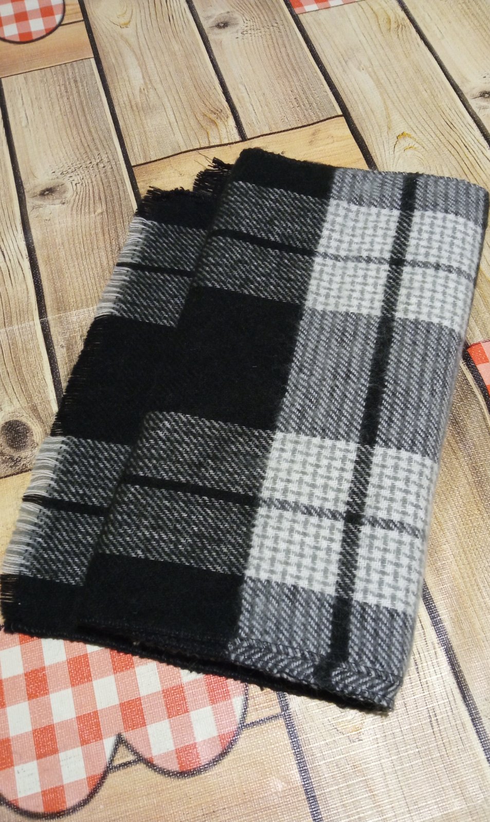 Nenosený vlnený hrubší šál, podšitý flísovou vrstvou, dĺžka aj so strapcami je cca 2 metre, šírka cca 15 cm.