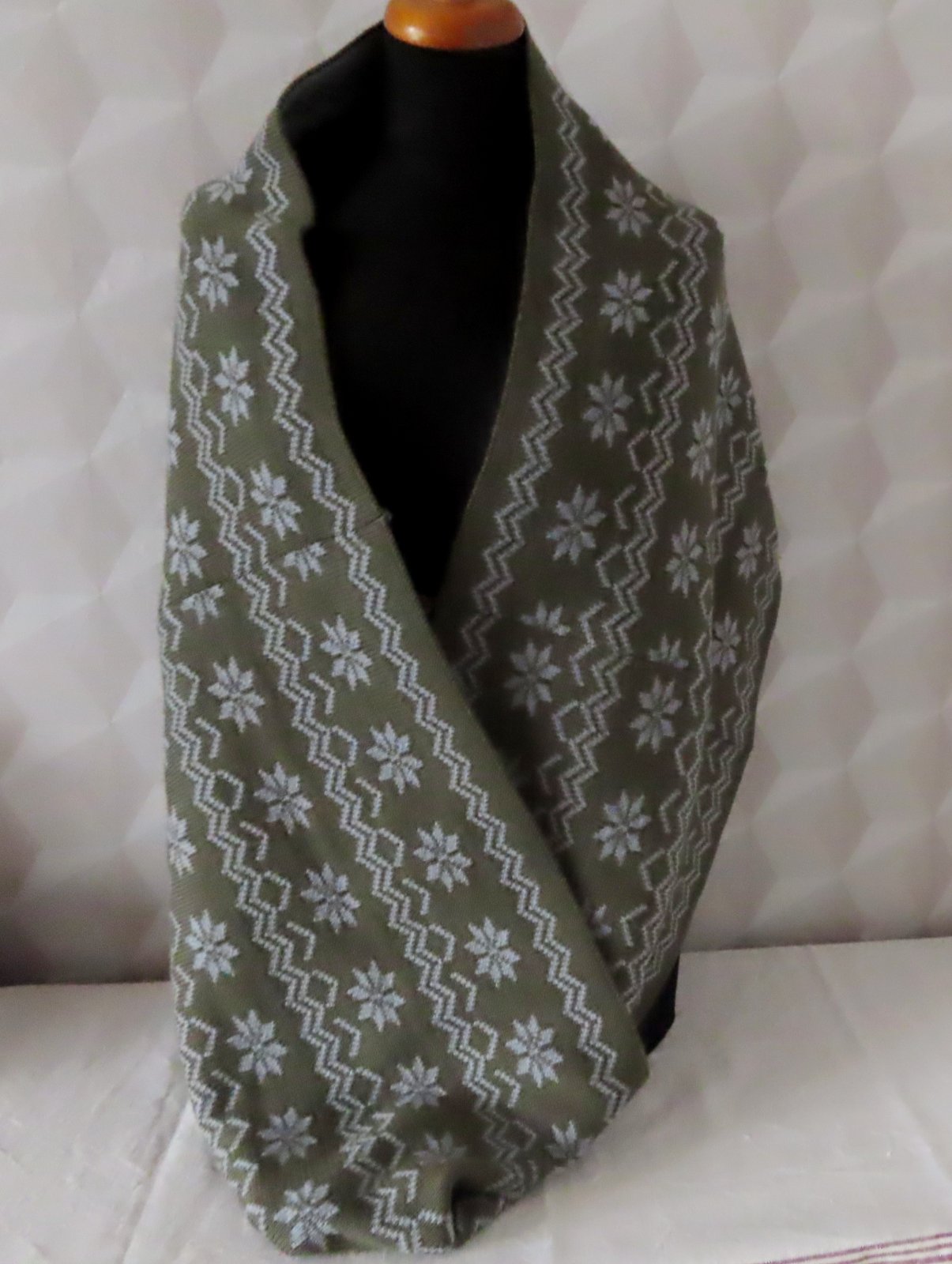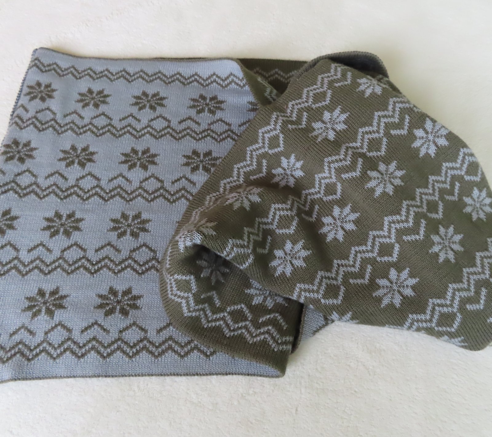 Obojstranne nositeľný, z jednej strany olivovo zelený so šedo-modrým vzorom, z druhej strany naopak.