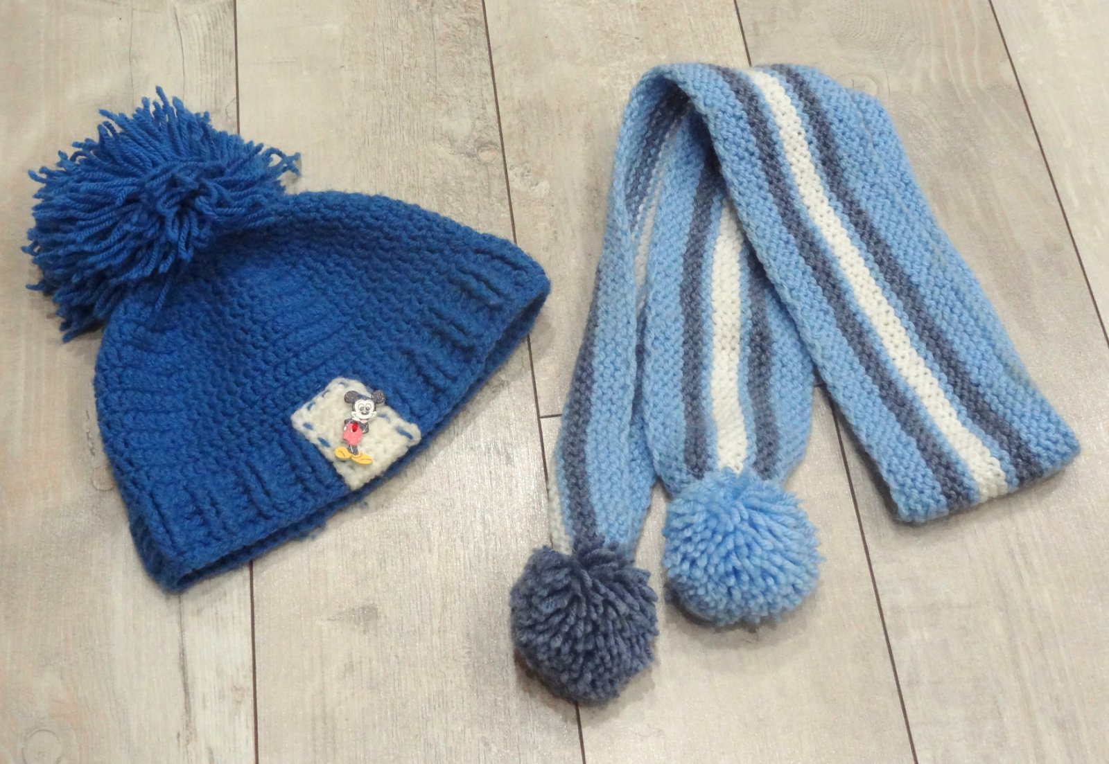 pletená čiapka s Mickey Mouse figúrkou + šál s brmbolcami *** HANDMADE *** v dobrom stave *** 3-5 rokov