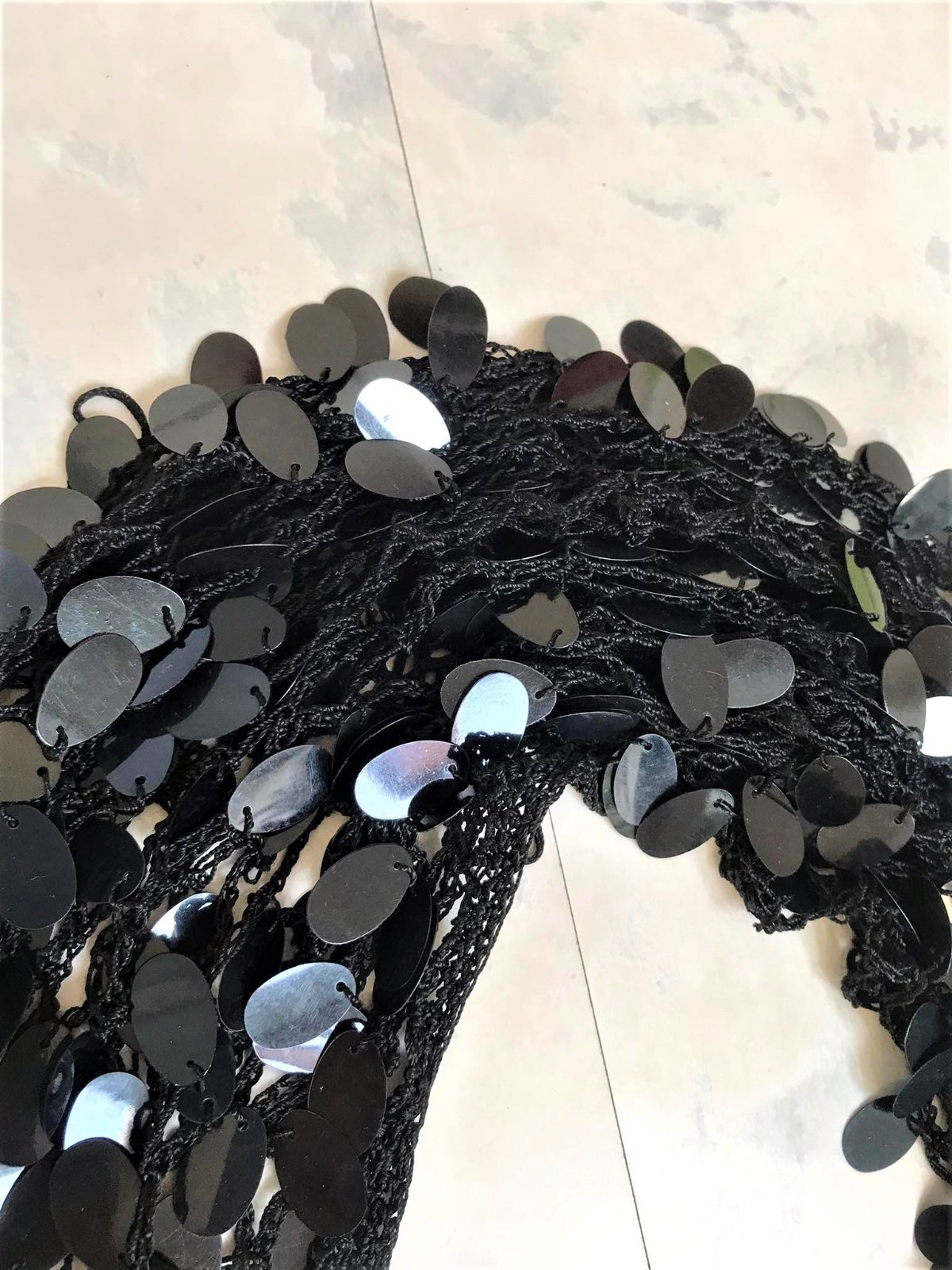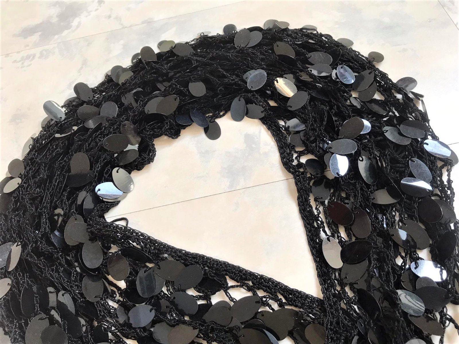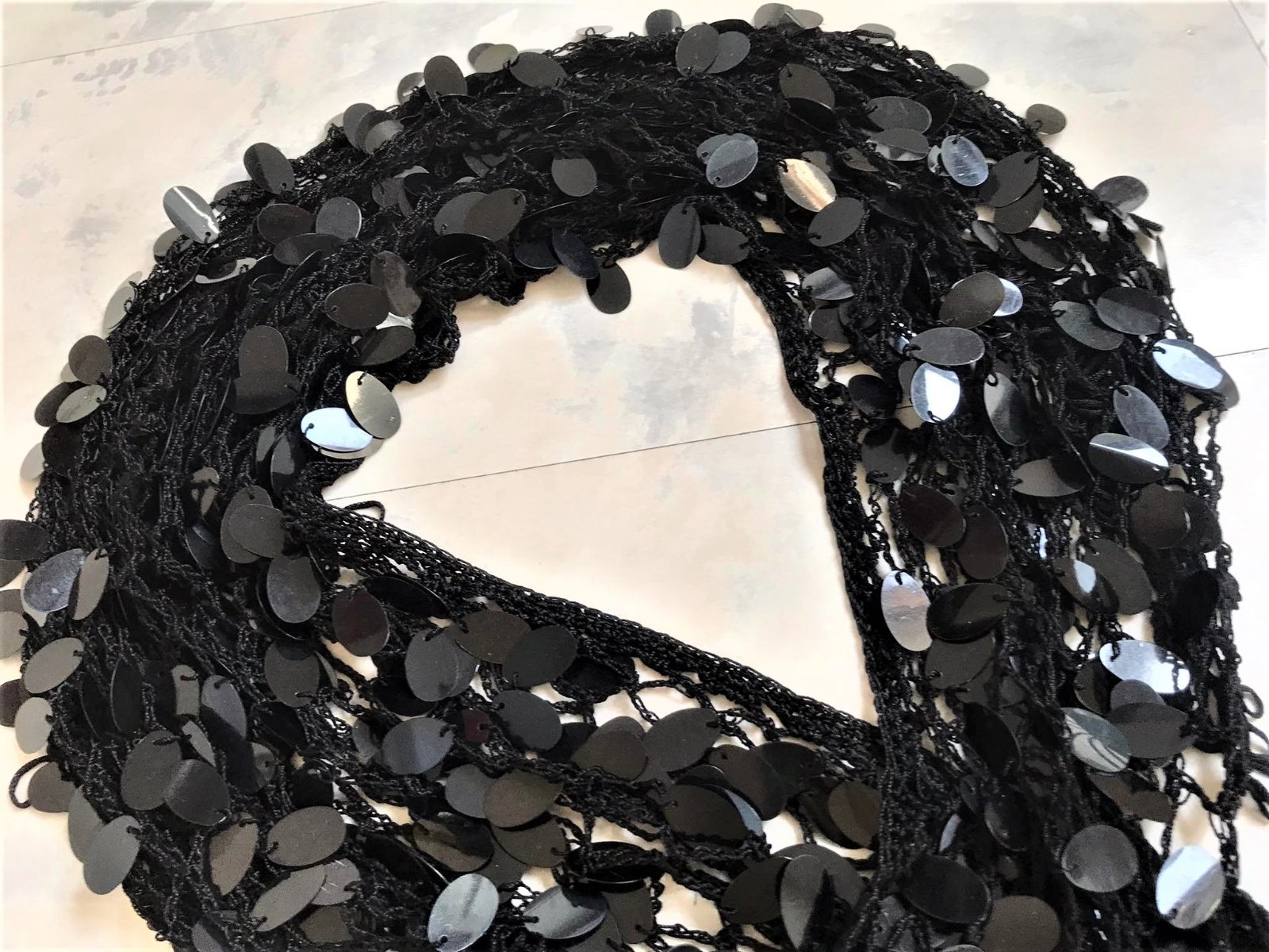 krásna extravagantná šatka na krk,100 % stav,trojuholníkový tvar, s čiernymi lesklými akoby šupinami ktoré menia farby v svetle - sú ligotavé a pôsobí to veľmi luxusne,vhodná aj okolo pása na orientálne tance,alebo okolo krku - ako krásna dekorácia na spoločenské podujatia,po obvode strapce,raz použitá na svadbe