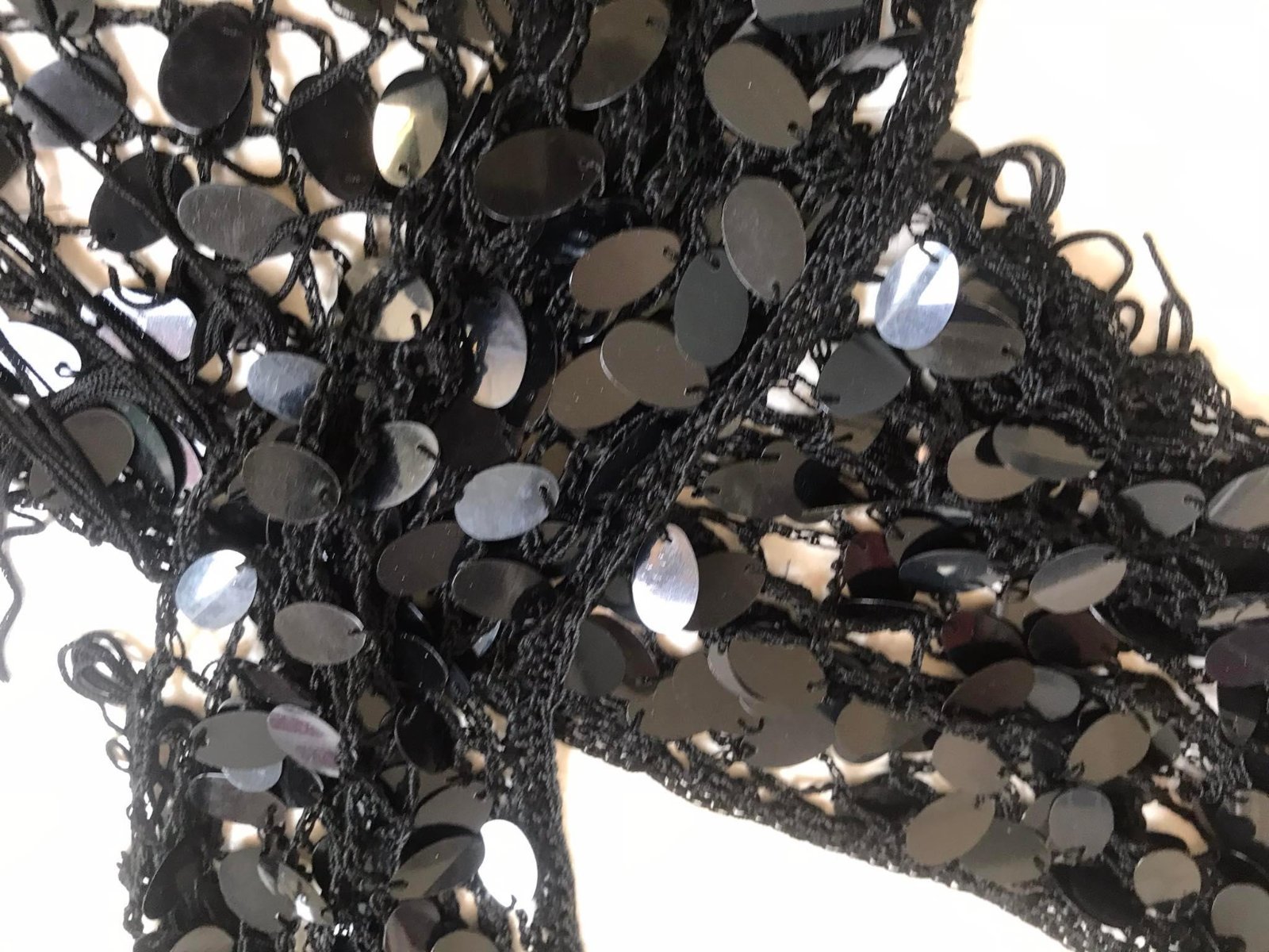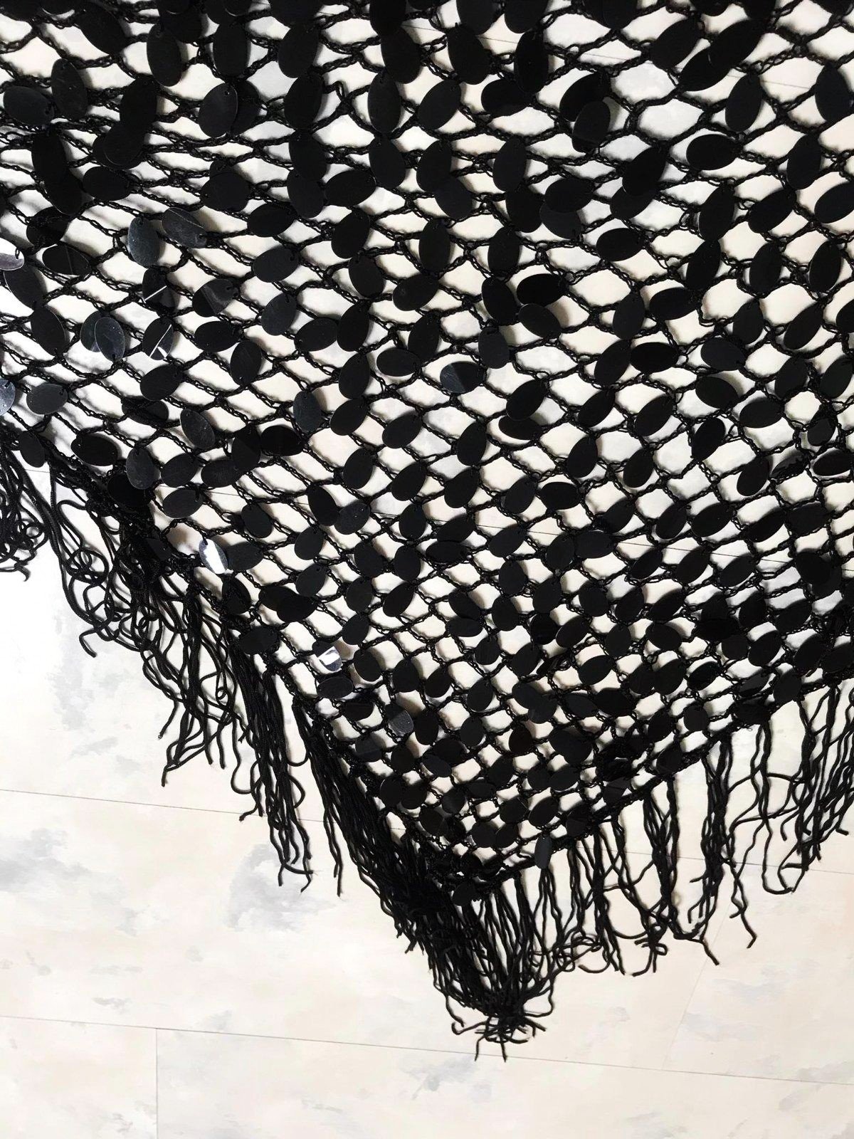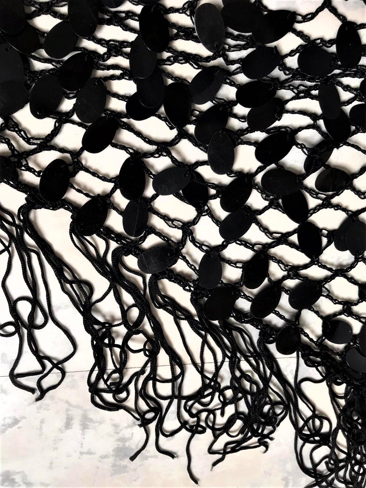 krásna extravagantná šatka na krk,100 % stav,trojuholníkový tvar, s čiernymi lesklými akoby šupinami ktoré menia farby v svetle - sú ligotavé a pôsobí to veľmi luxusne,vhodná aj okolo pása na orientálne tance,alebo okolo krku - ako krásna dekorácia na spoločenské podujatia,po obvode strapce,raz použitá na svadbe