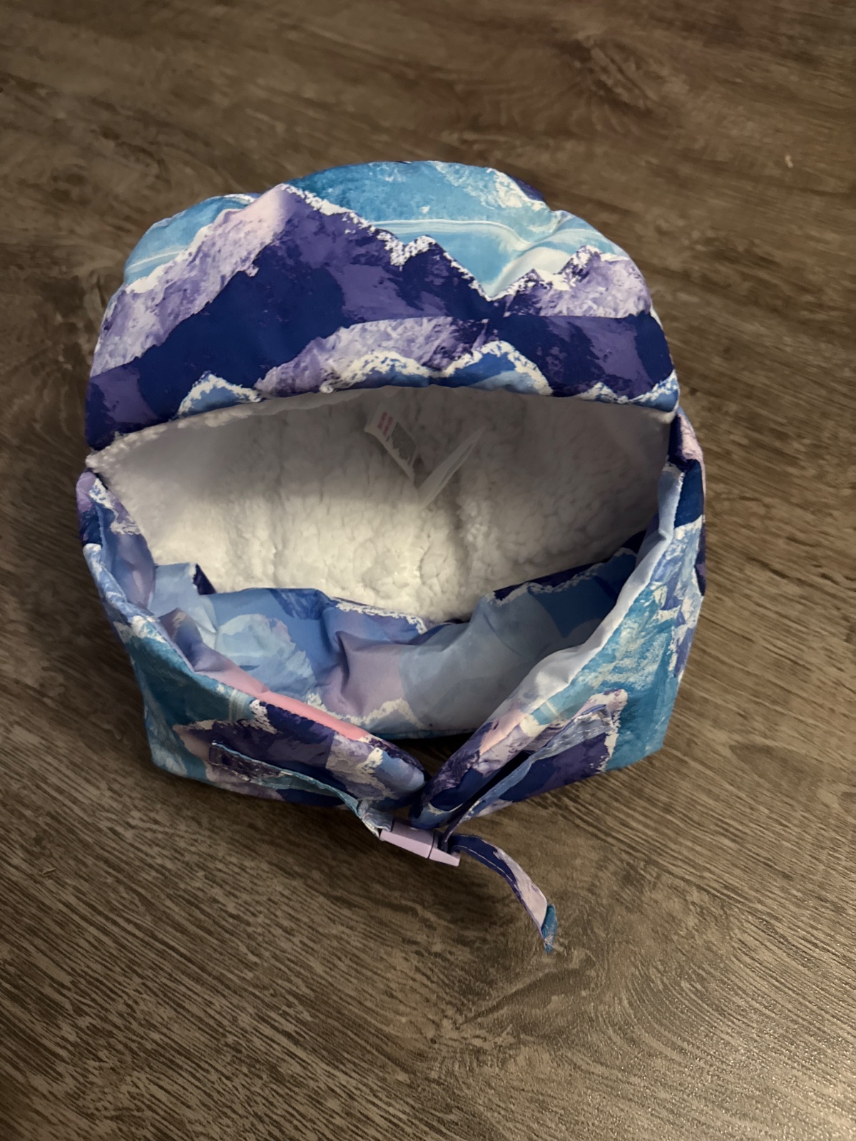 naša obľúbená,výška 22 cm,š.20 cm v klude,my sme nosili tak v 10-11 rokoch,farba je taká ružovo-modro-biela s lososovým kvetom,pôv.cena 10 Eur