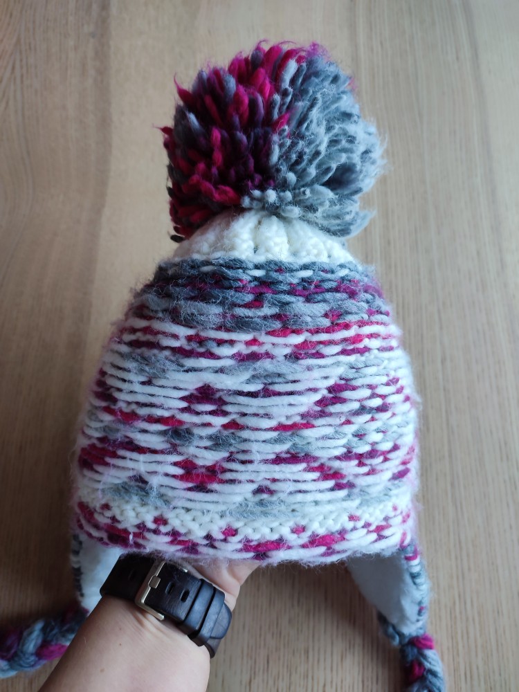 mega teplá, mohutná, materiál je vlnená zmes a vnútri je ešte umelá kožušinka. veľkosť odhadom, je to čiapka pre škôlkárku. bez akýchkoľvek poškodení, oblečená asi dva krát.
