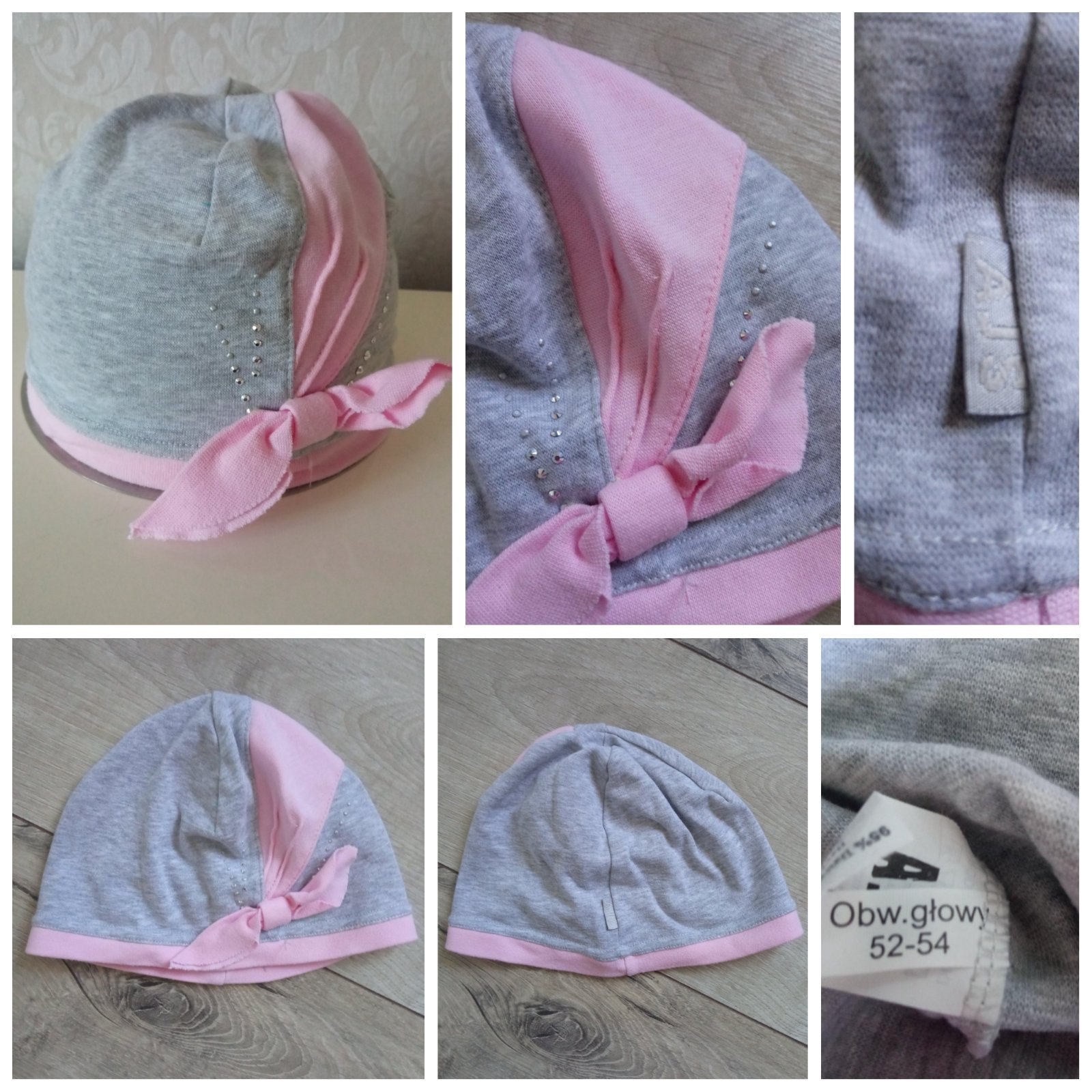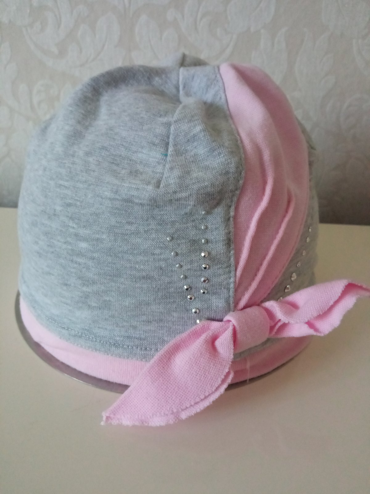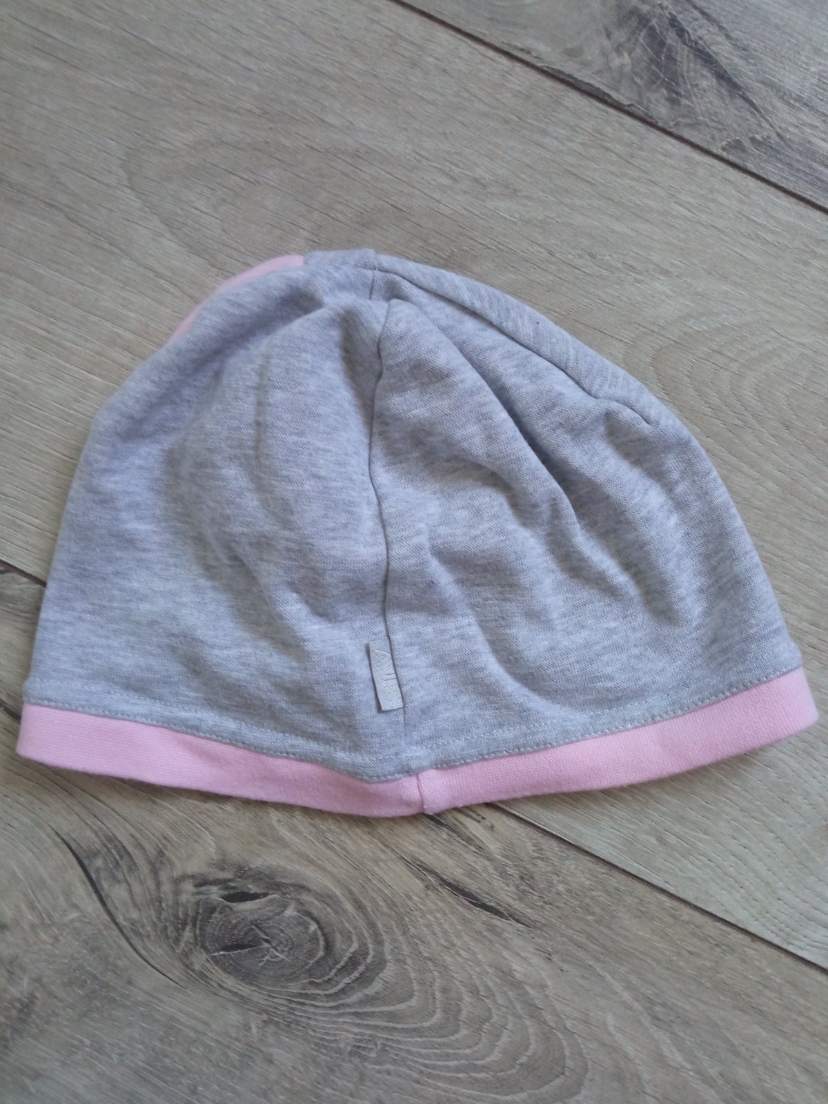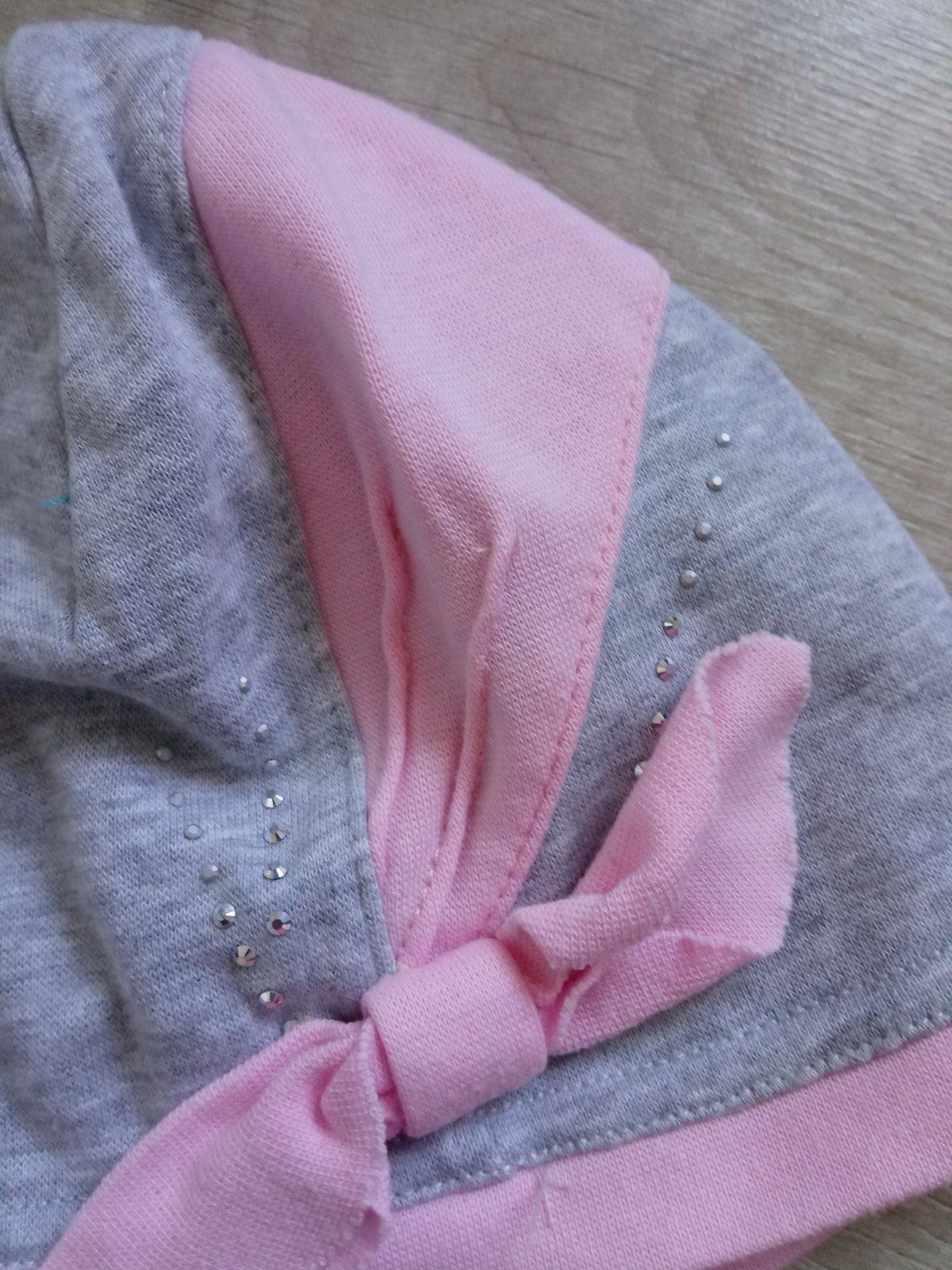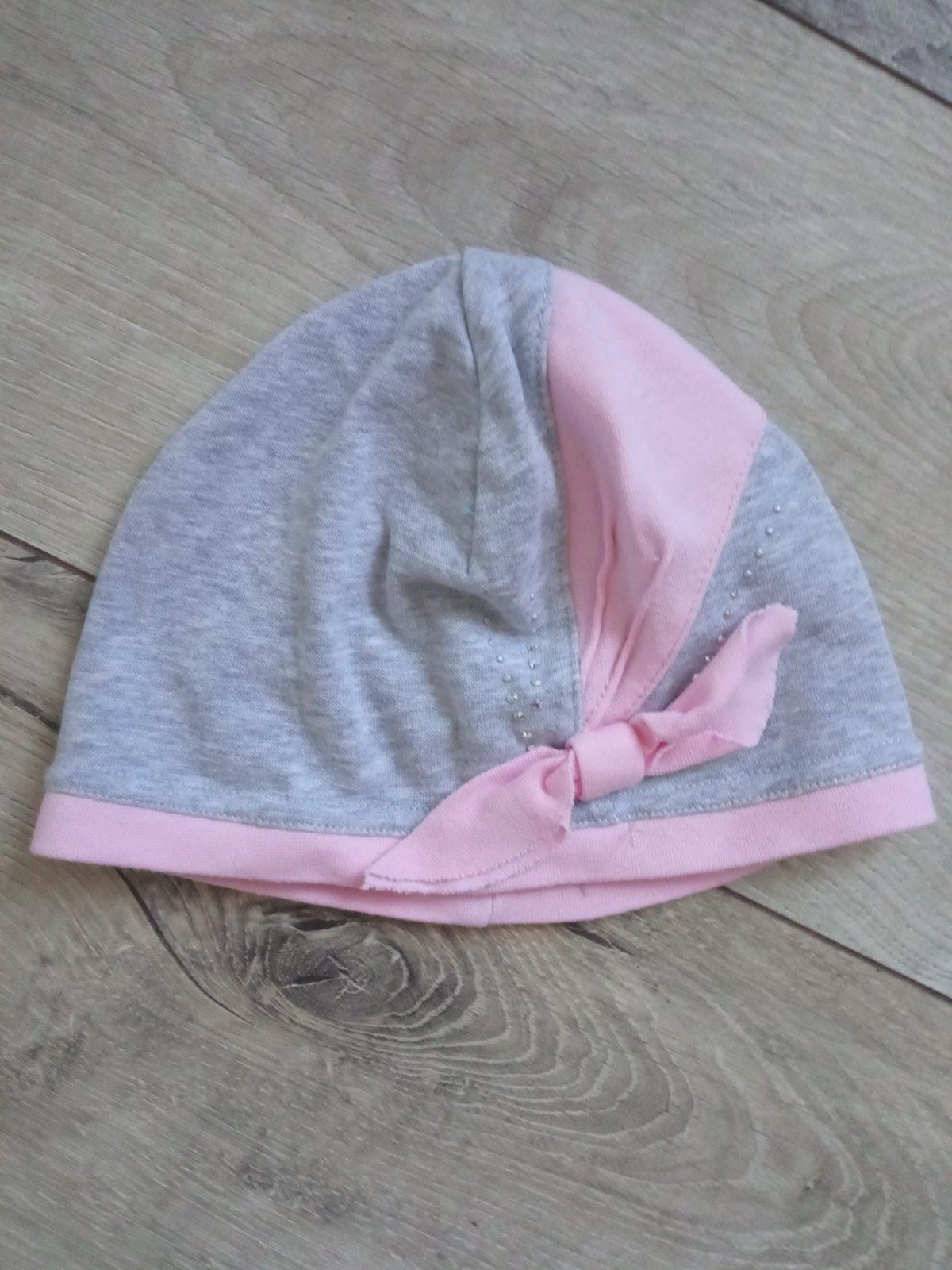 Dievčenská tenká čiapka, sivá, ružová, elastická, materiál 95%bavlna,5%elastan, veľkosť cca 92.