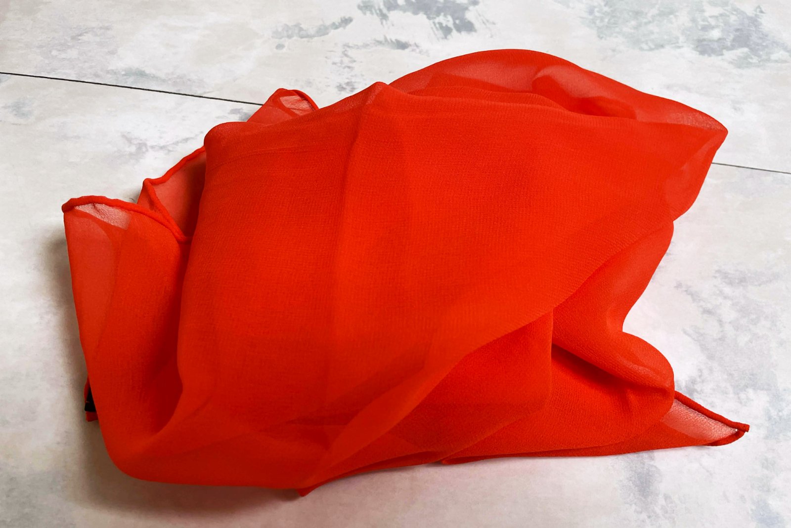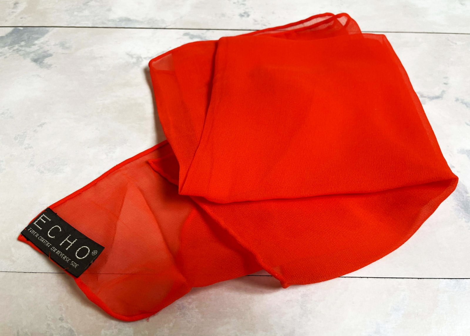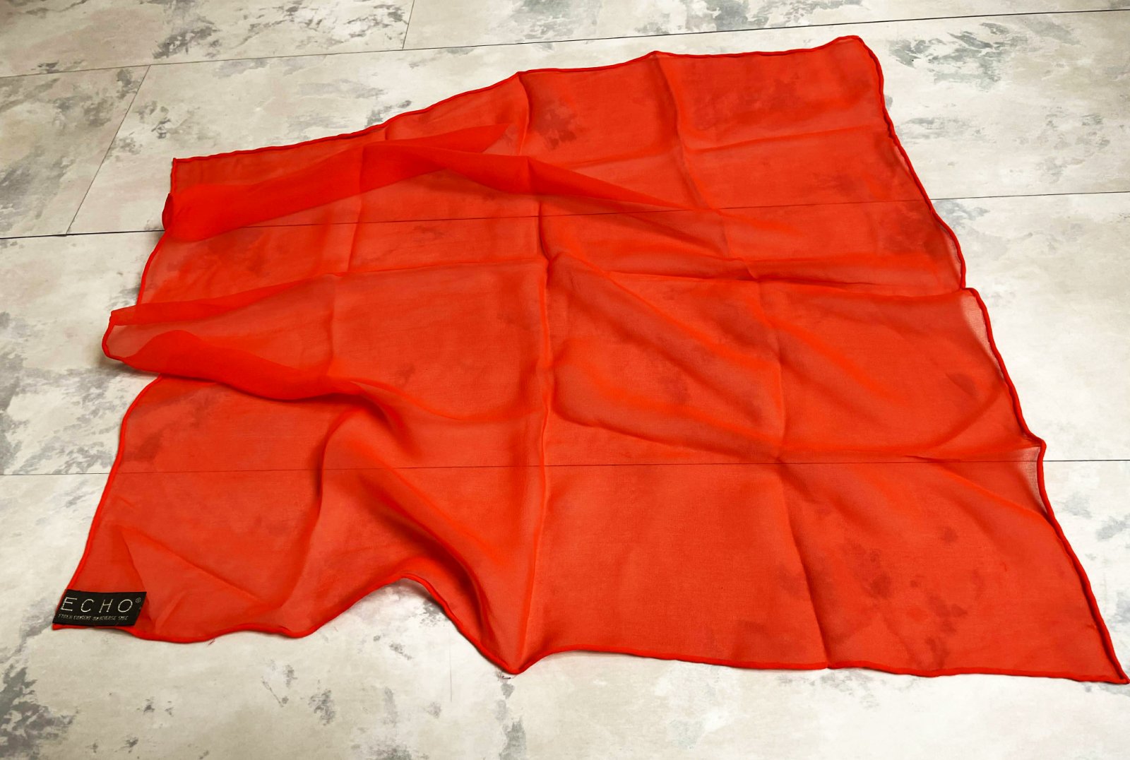 značková tenká priesvitná ľahká šatka značky Echo New York, renomovanej americkej značky doplnkov, ktorá sa špecializuje na šatky už od svojho založenia v roku 1923,veľmi pestrá,je výraznej ostrej červenej farby teplého odtieňu - sýta lososová,materiál šifón