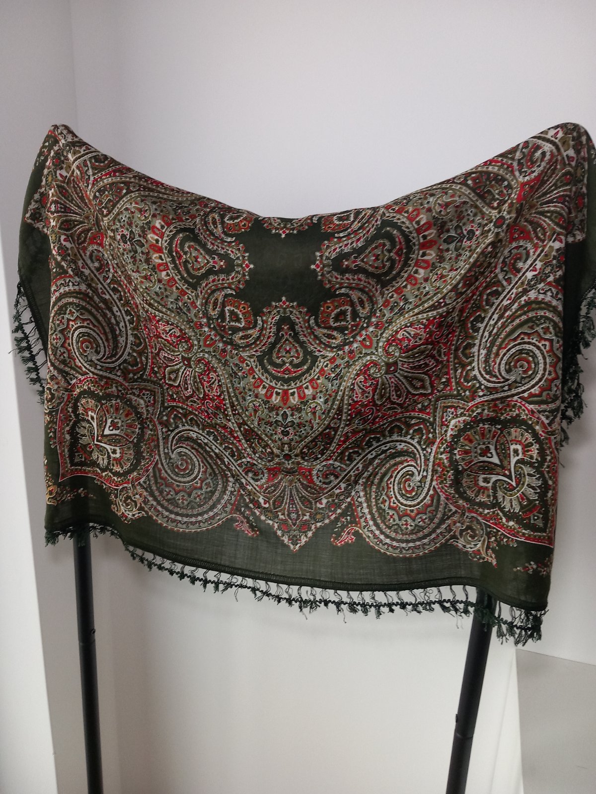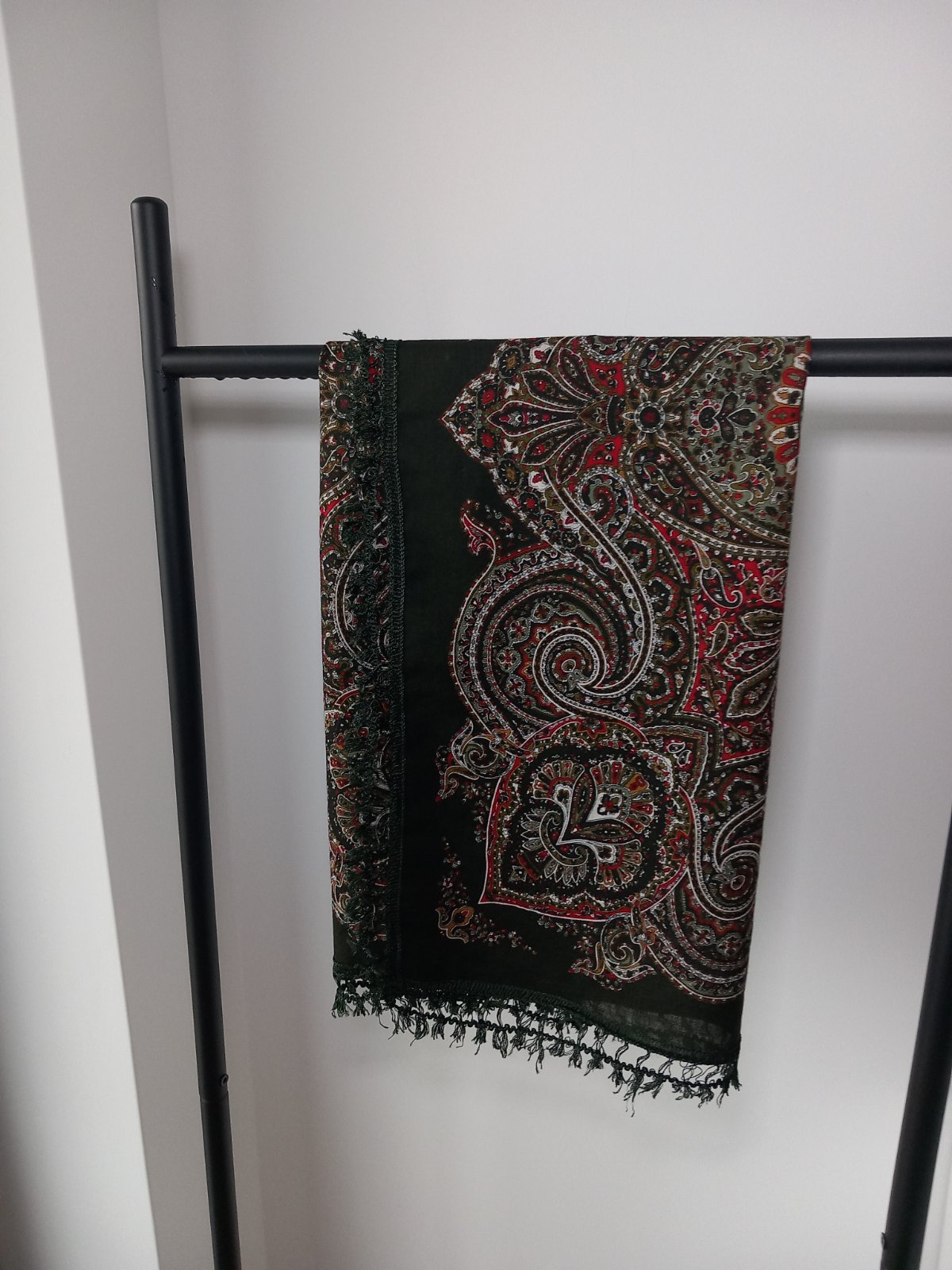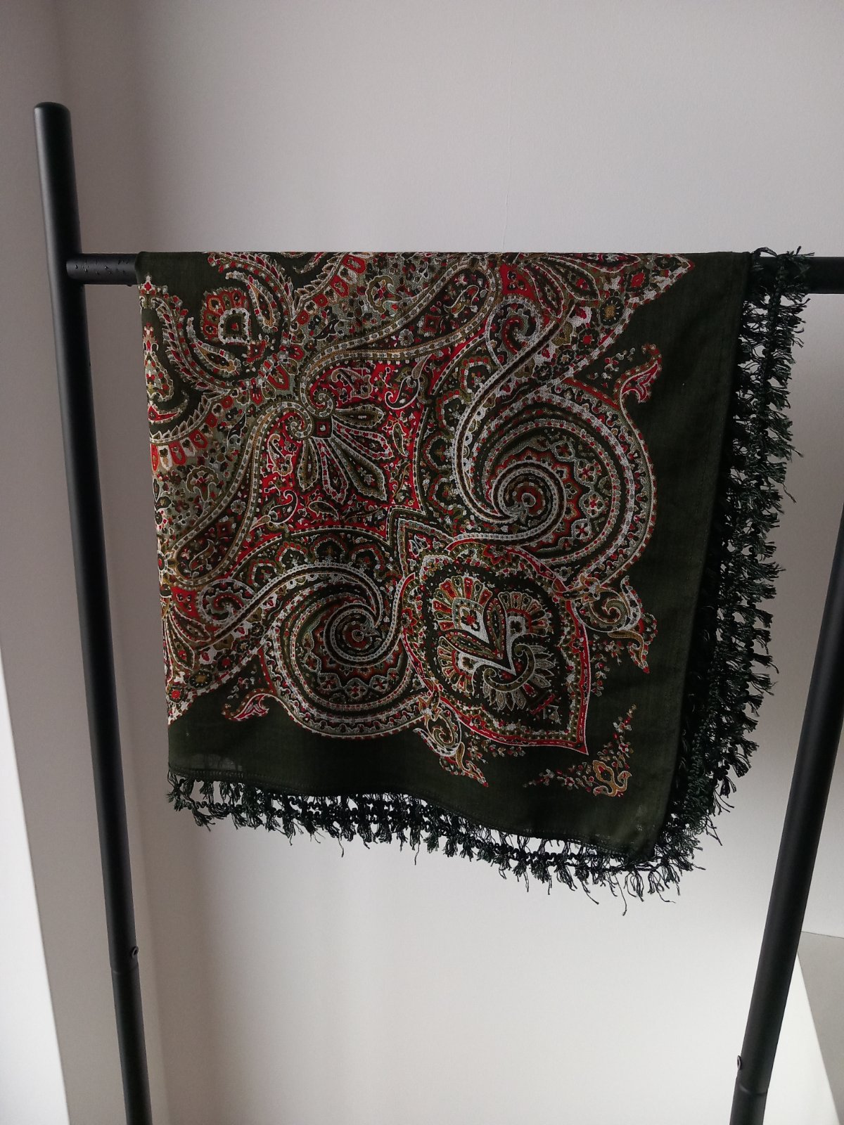 Jedinečná vlnená šatka s jemným lemovaným okrajom. Je to originálny kúsok, ktorý sa hodí na ozvláštnie outfitu. Šatka je ľahká, nebude škriabať na pokožke. Je s minimálnymi známkami nosenia.