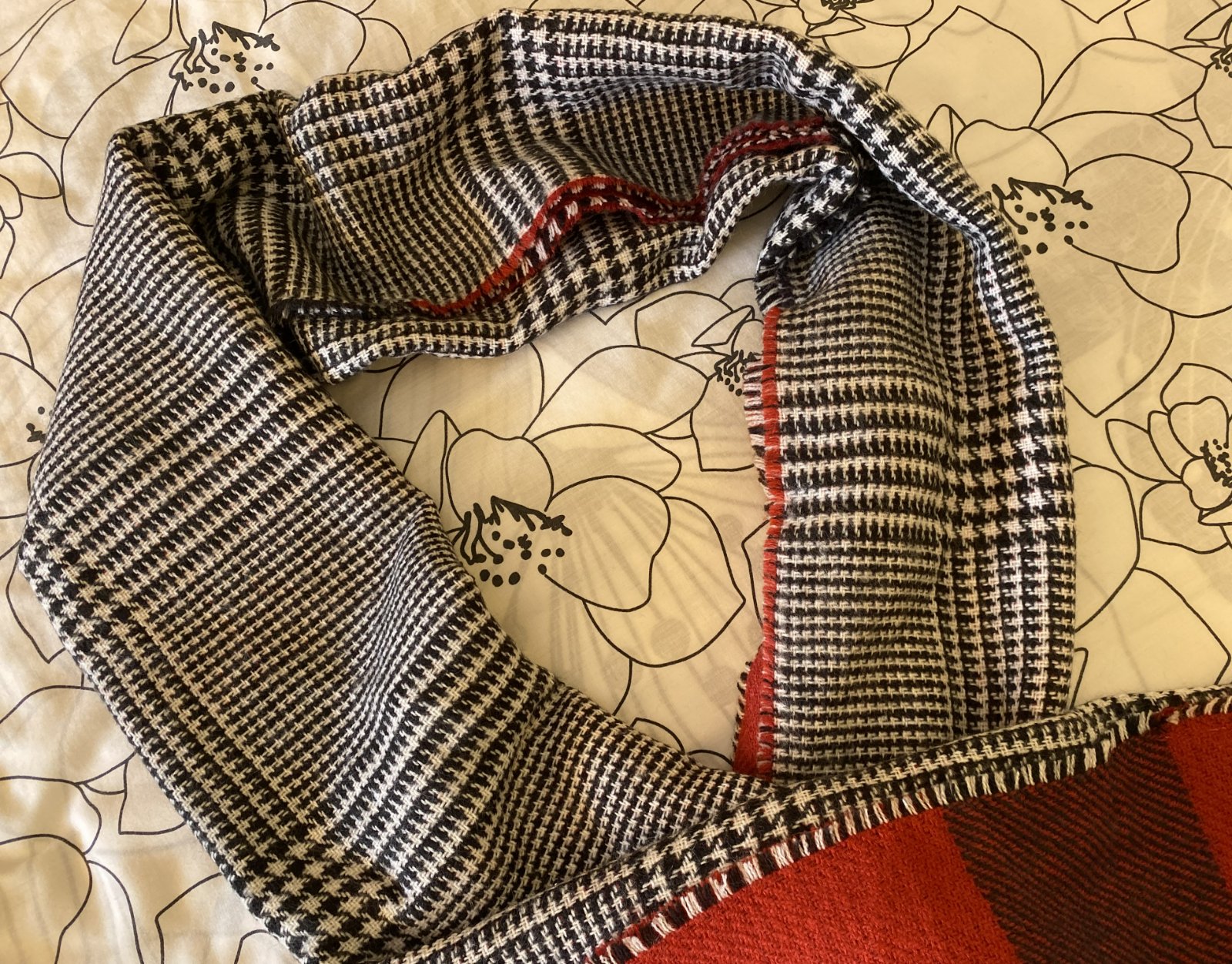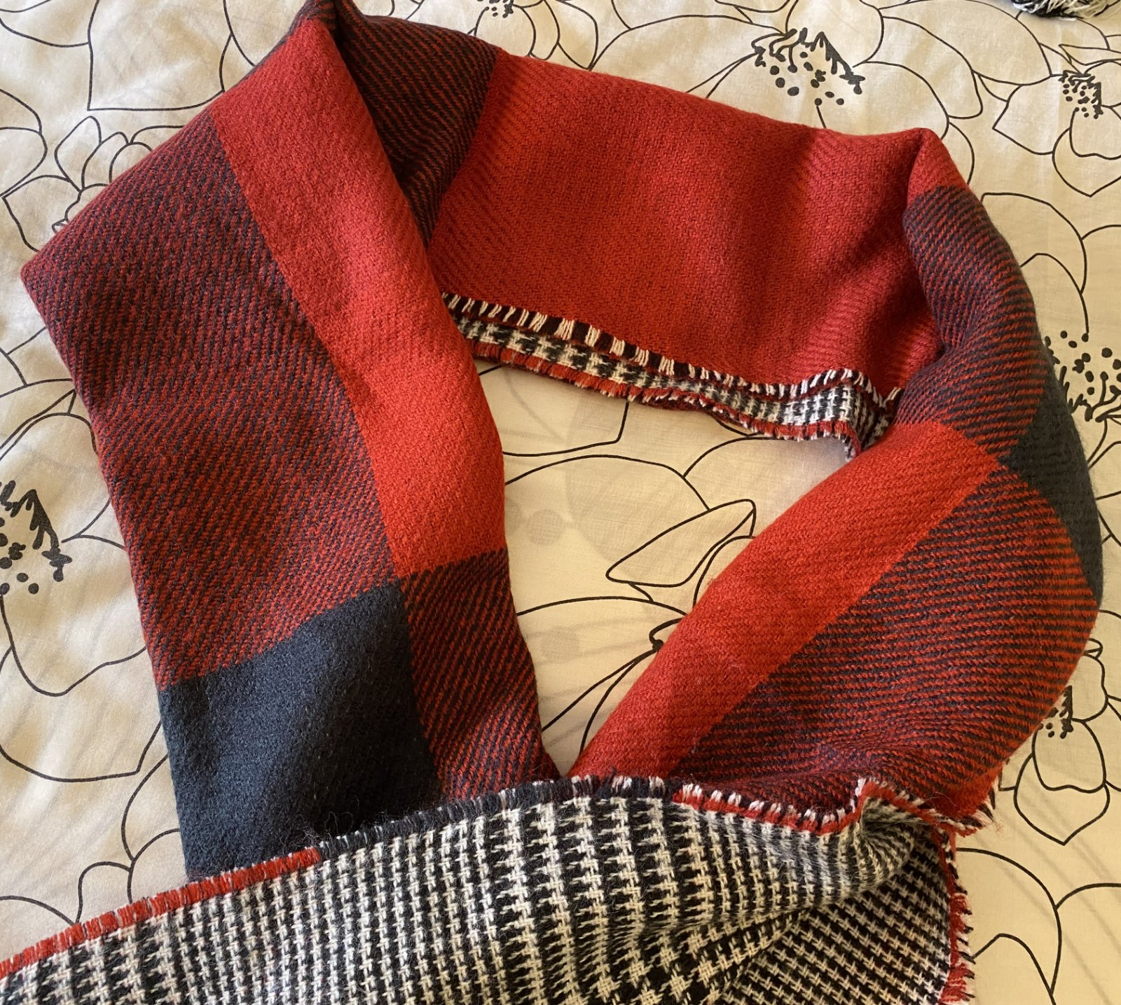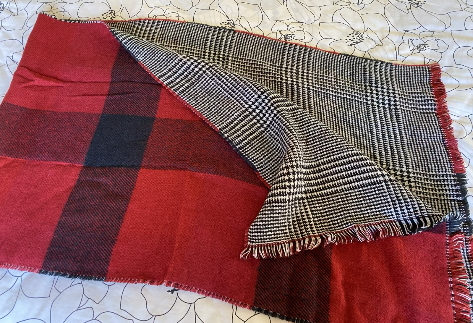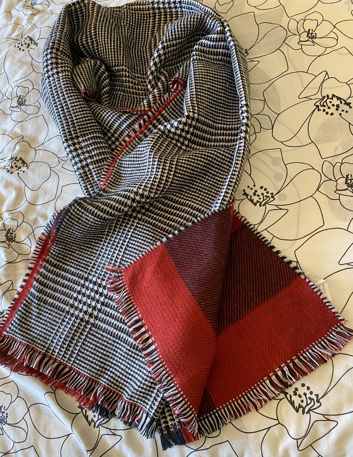 Nový elegantný mäkký obojstranný šál - UNI - iba skladovaný, už bez visačky, vhodný pre pánov aj dámy, materiál 100% acryl, kombinácia farieb čierna - biela, červená. Miery: dĺžka aj so strapcami: 200cm, šírka so strapcami: 63cm. Pôvodná cena: 12.98.