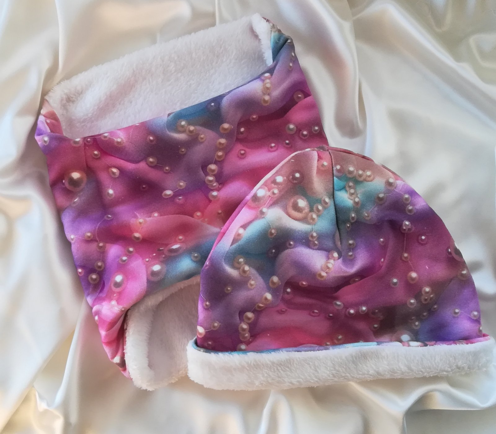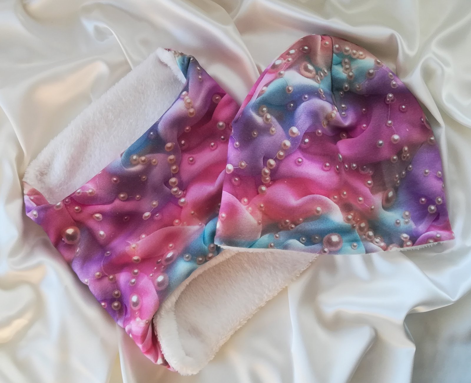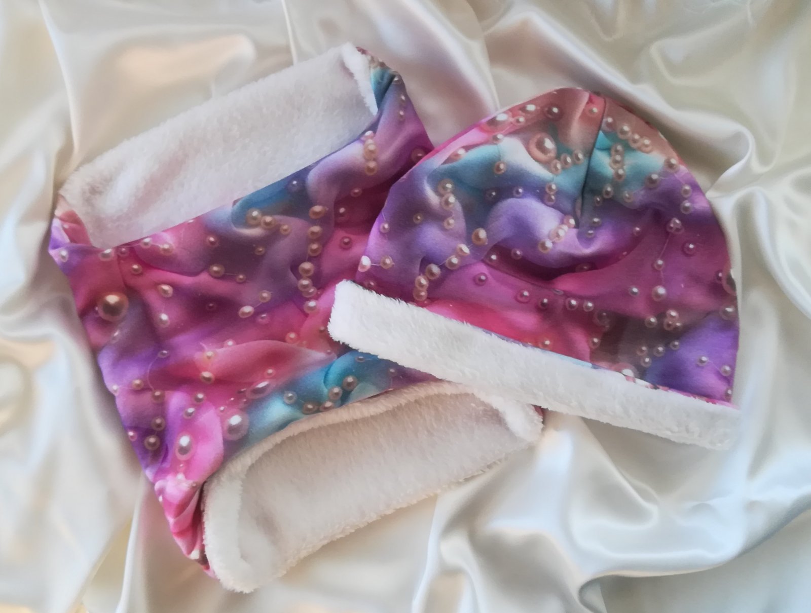 Tento SET je obojstranný, vrchný materiál je vzorovaný úplet v nádhernej farbe s perlami, druhá strana je z jemnučkého, mäkučkého materiálu nazývaného babysoft v krásnej maslovo bielej farbe.
