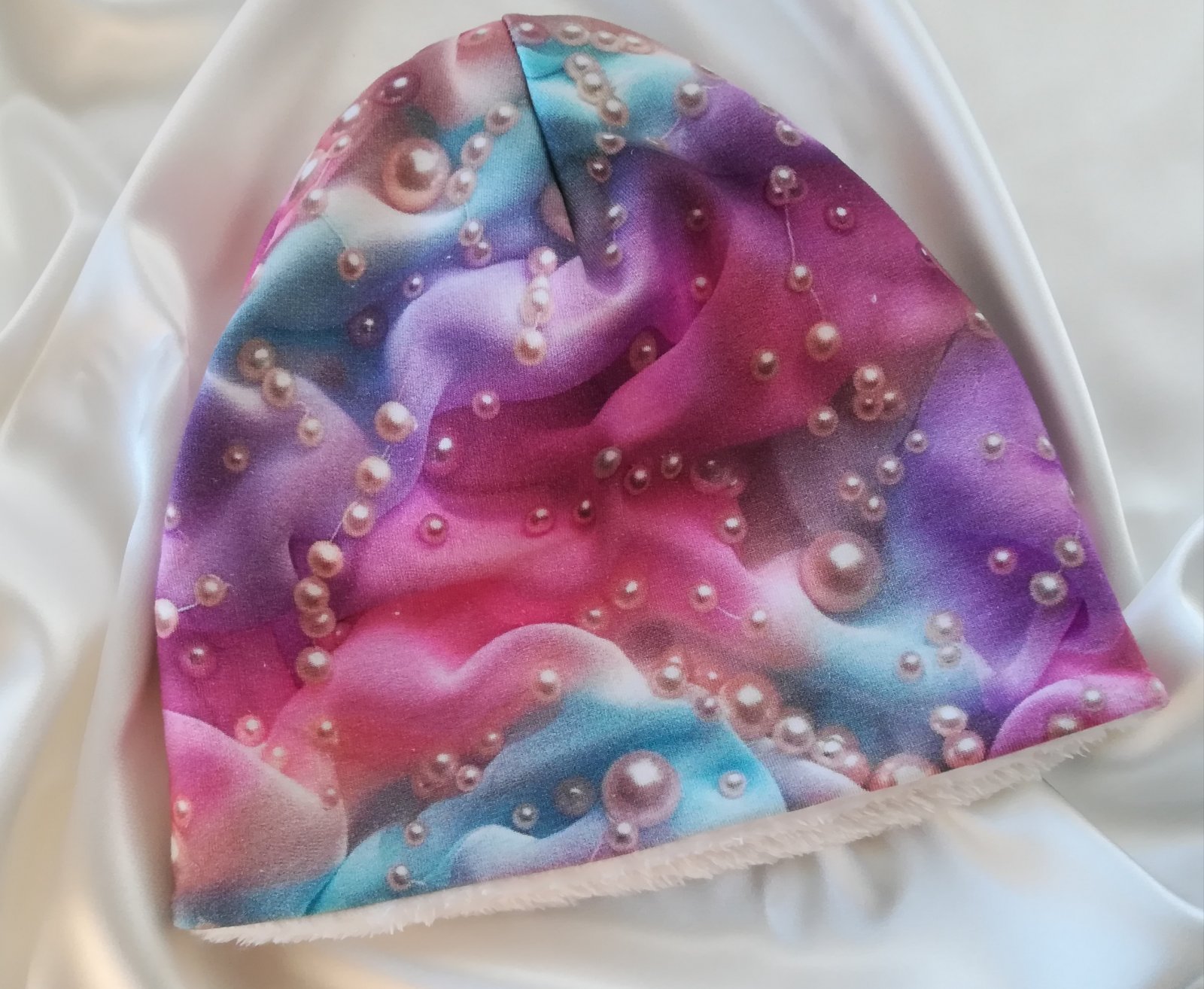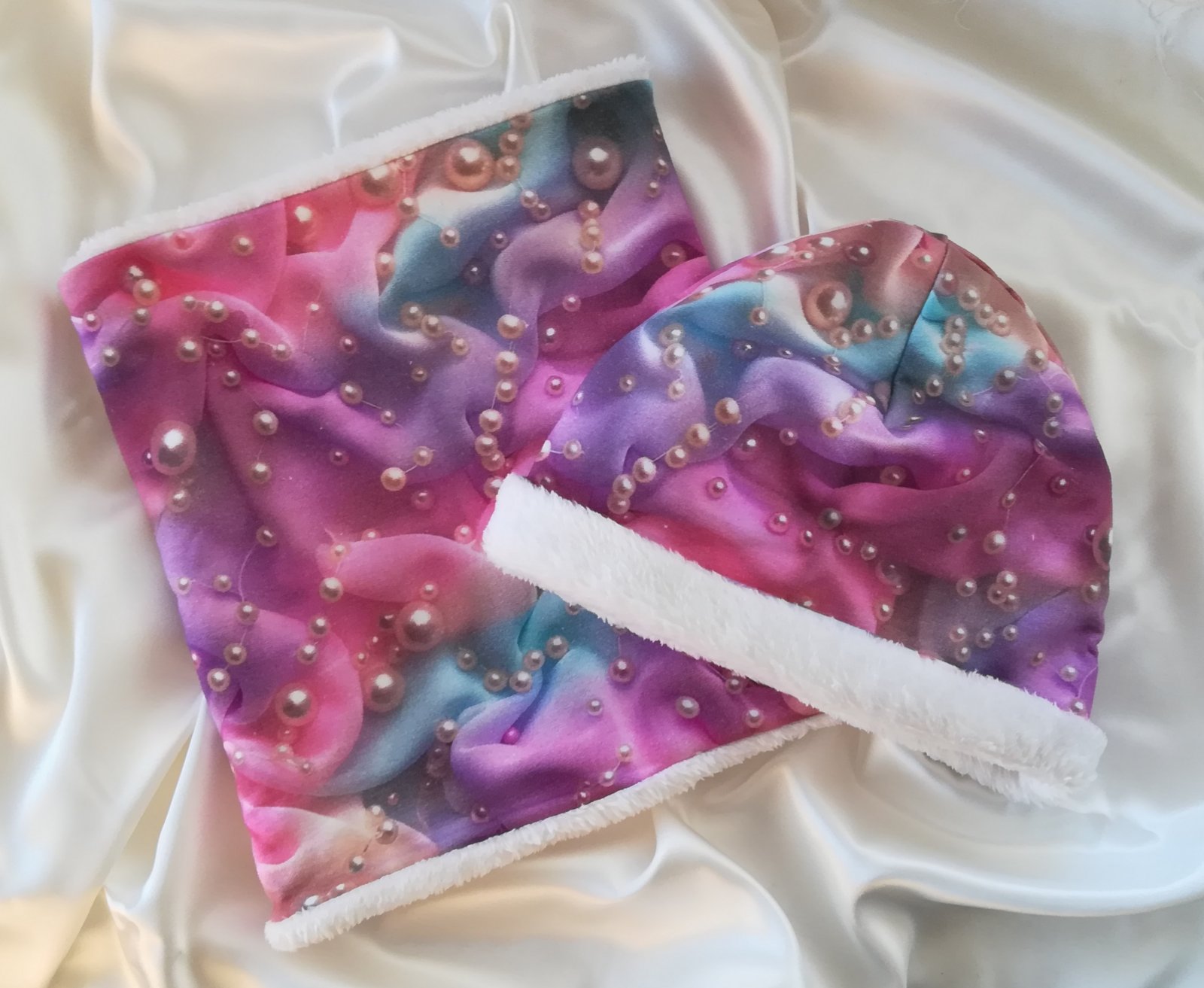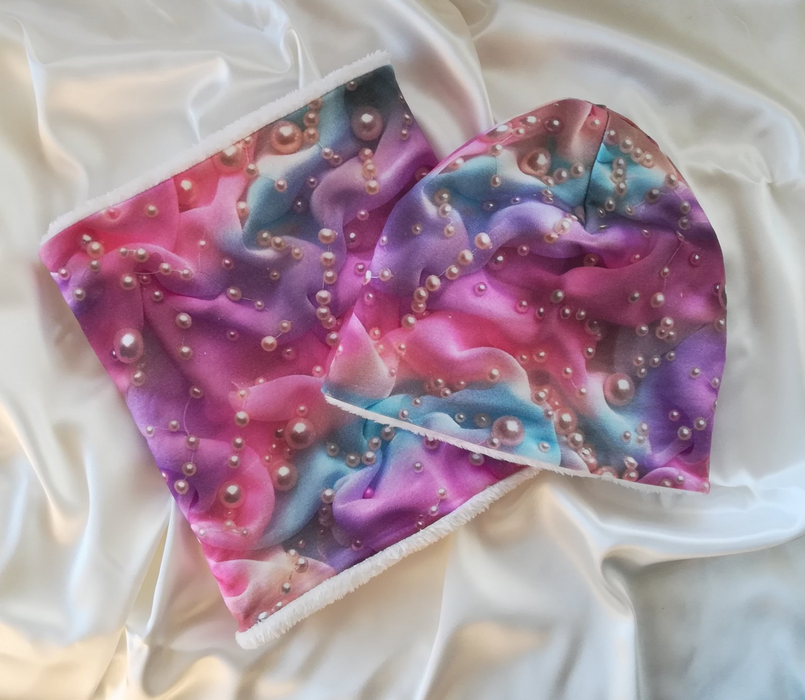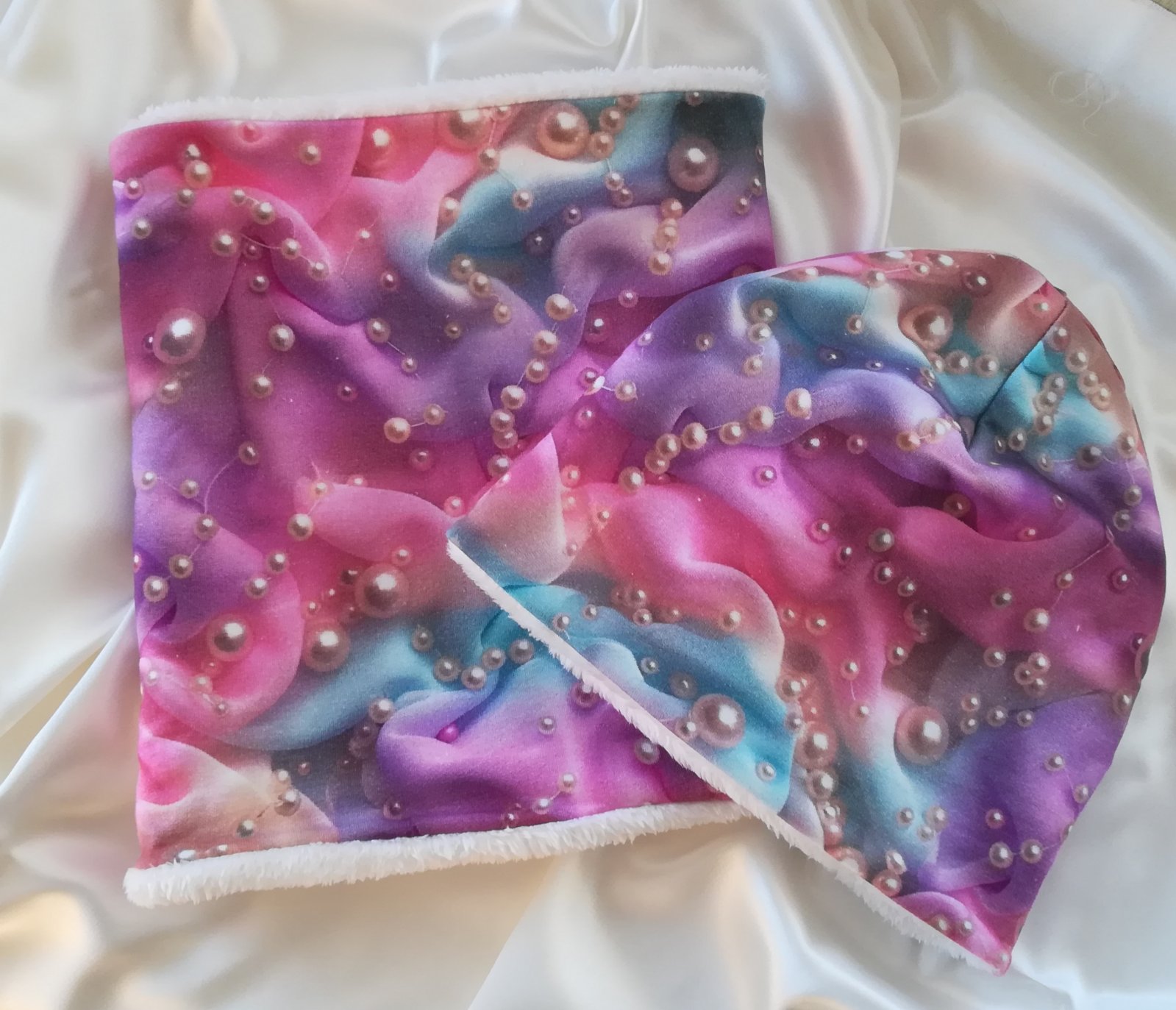 Tento SET je obojstranný, vrchný materiál je vzorovaný úplet v nádhernej farbe s perlami, druhá strana je z jemnučkého, mäkučkého materiálu nazývaného babysoft v krásnej maslovo bielej farbe.