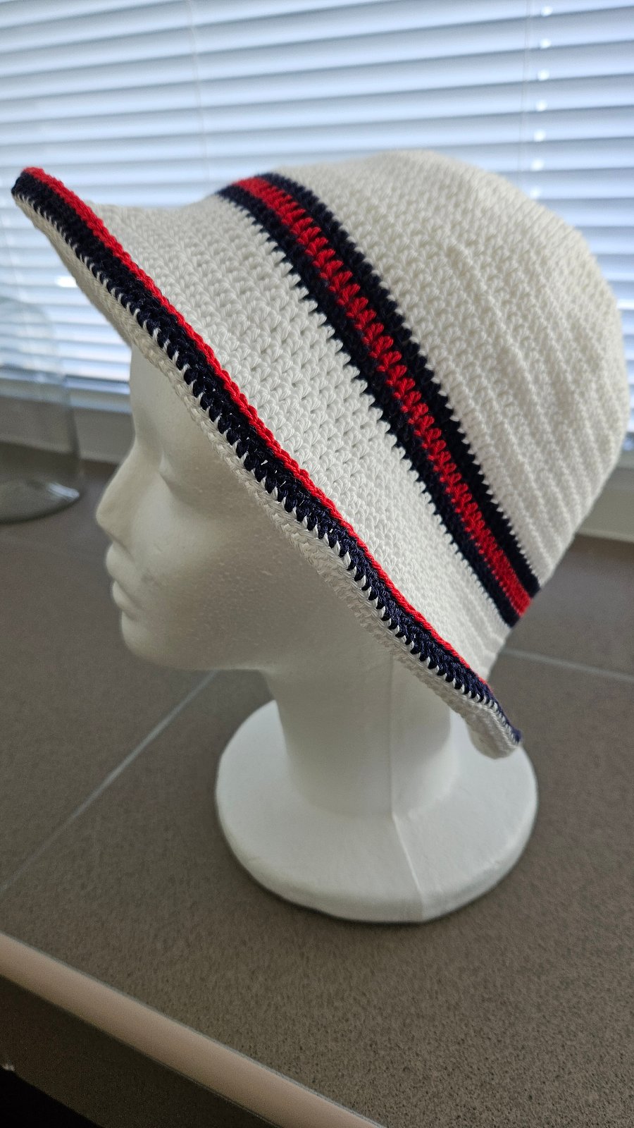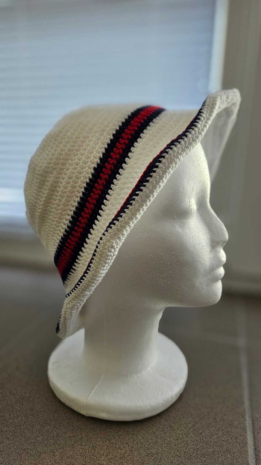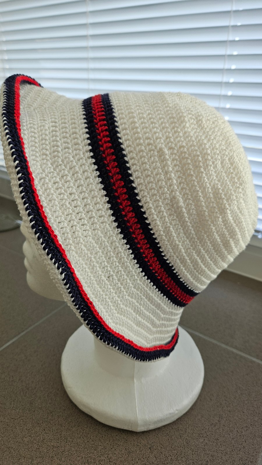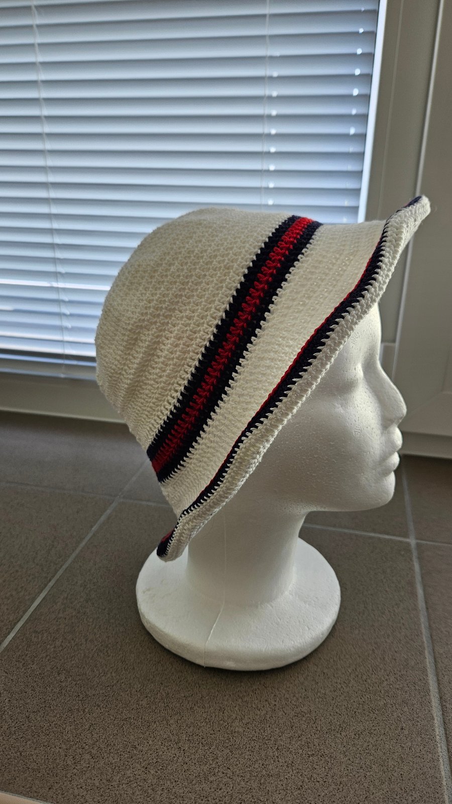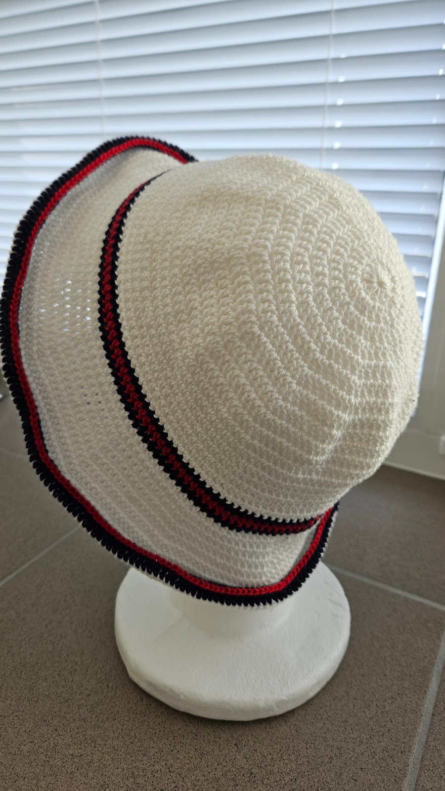 Klobúk na leto, handmade, biely s červeno-čiernym