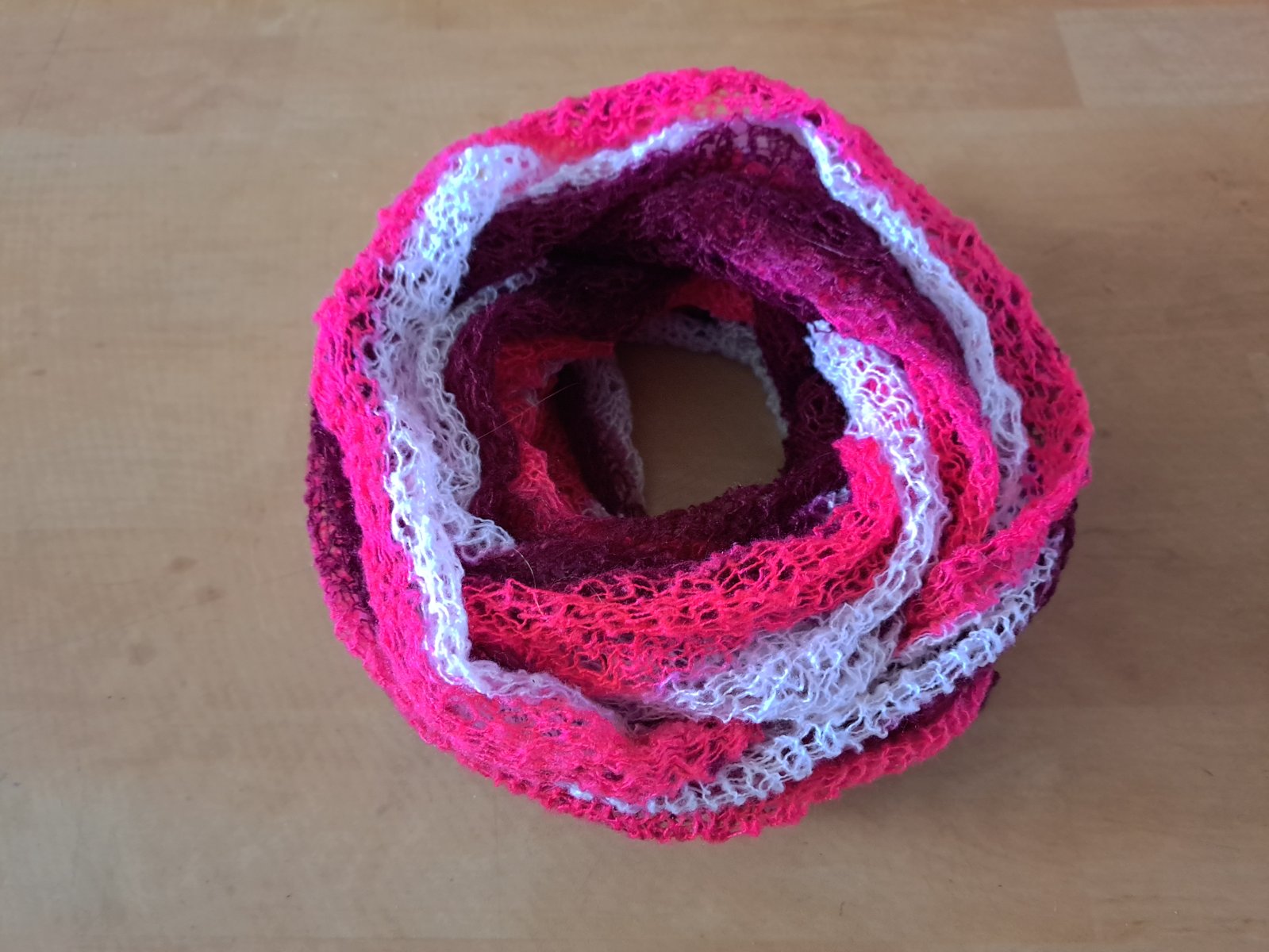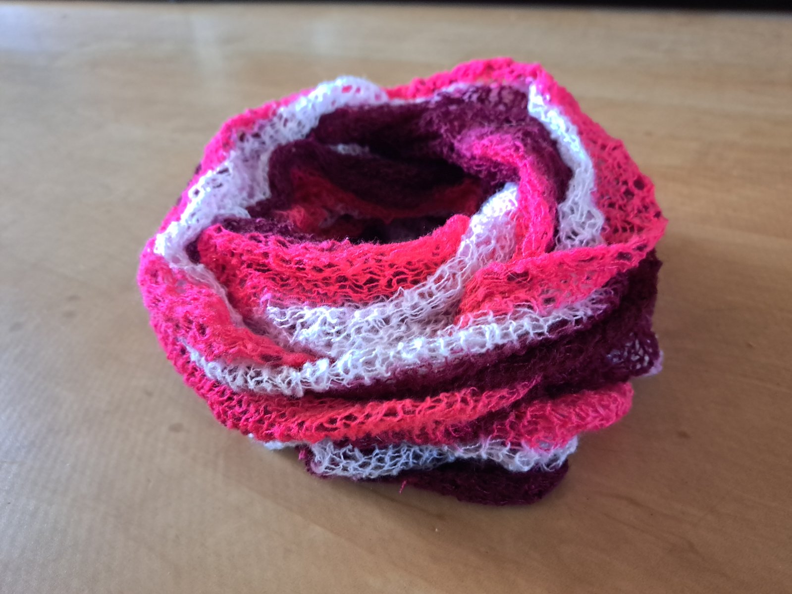 Dvojfarebný vlnený šál. Z jednej strany svetloružový, z druhej tmavoružový.