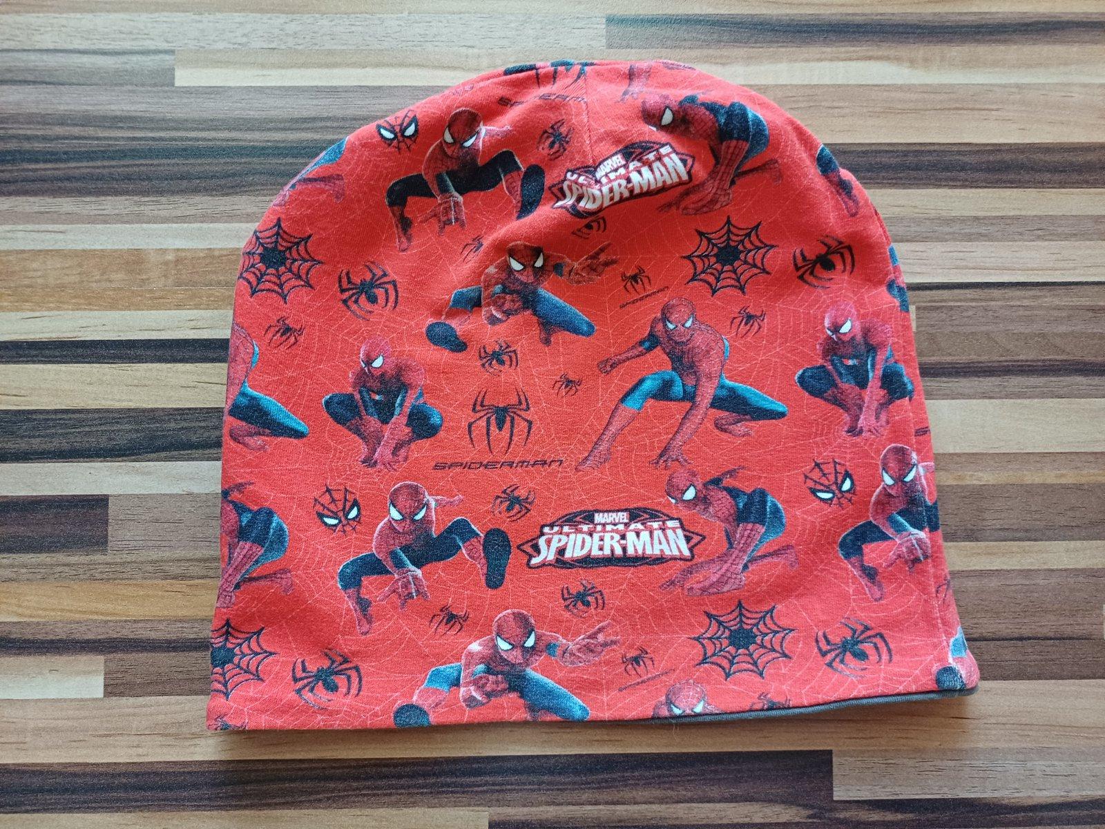 Obojstranná čiapka. Z jednej strany čisto červená, z druhej Spiderman. Veľkosťou tak na 8-10 rokov (cca 140-152). Rozmery v kľude: obvod 25 cm x2, výška stredom 22 cm.