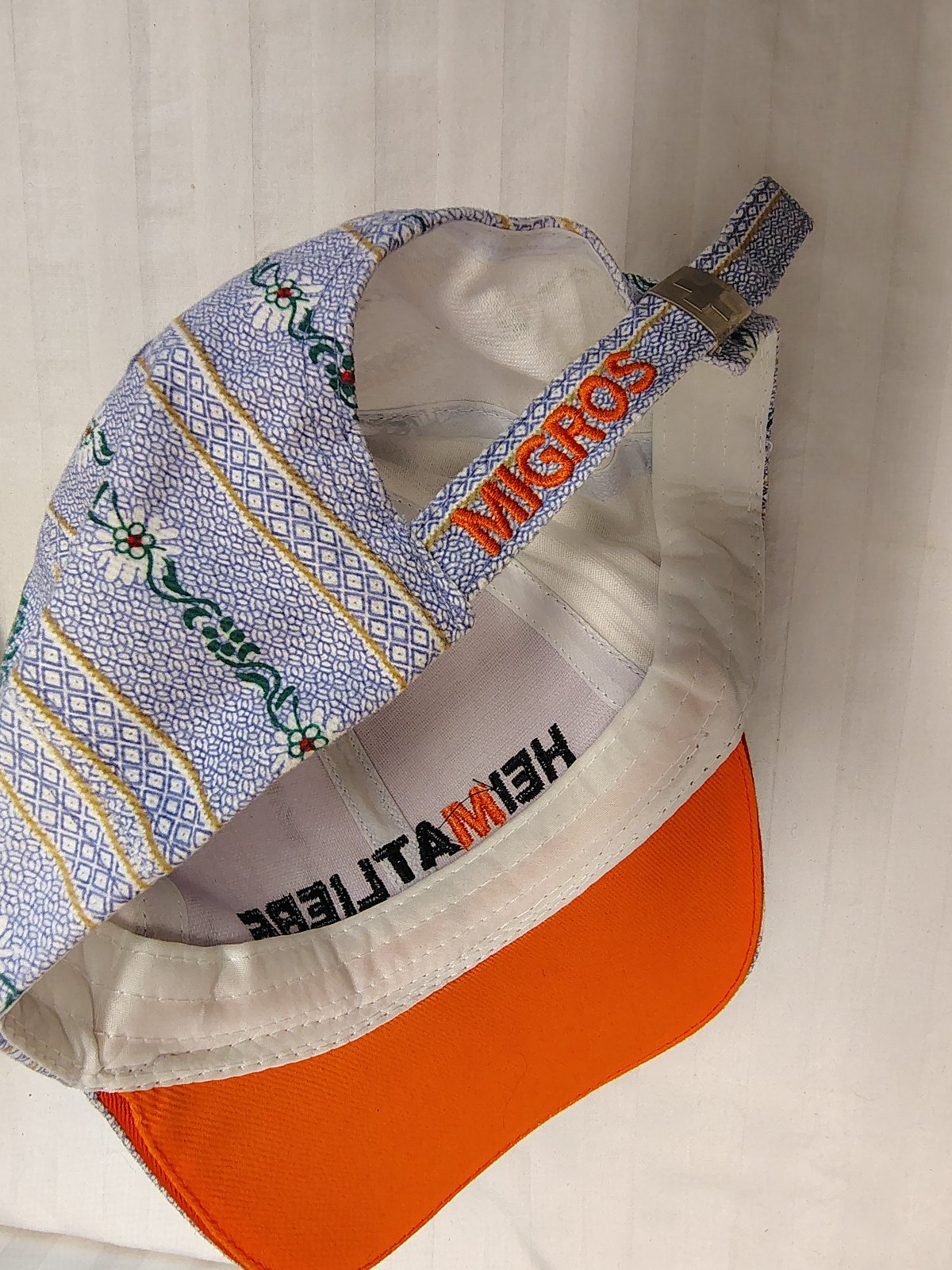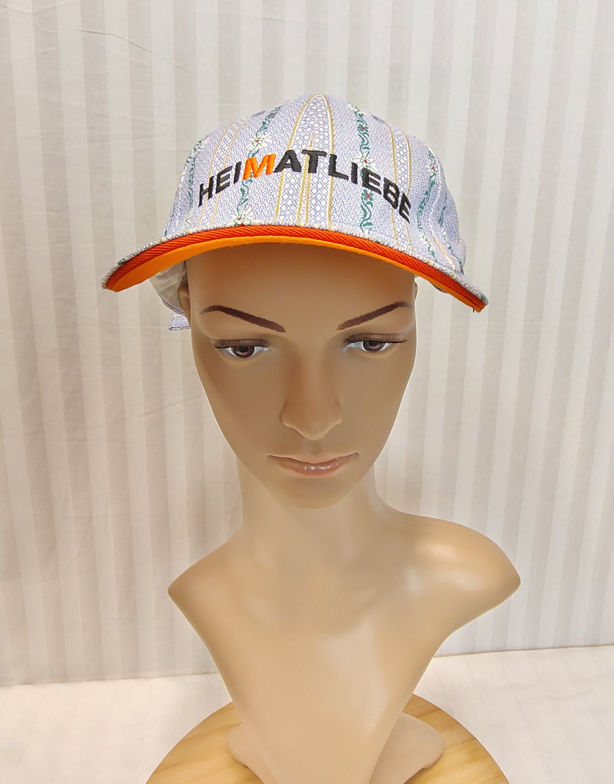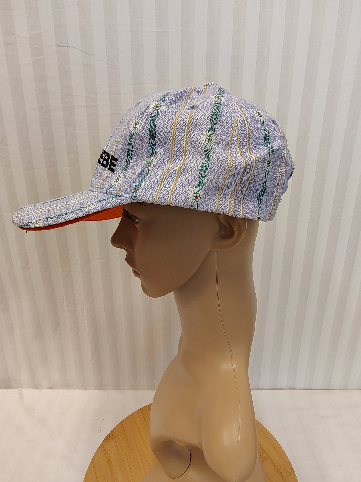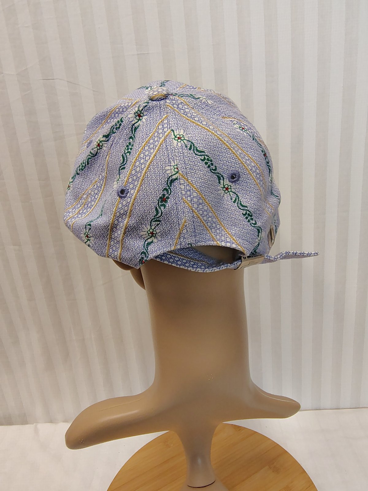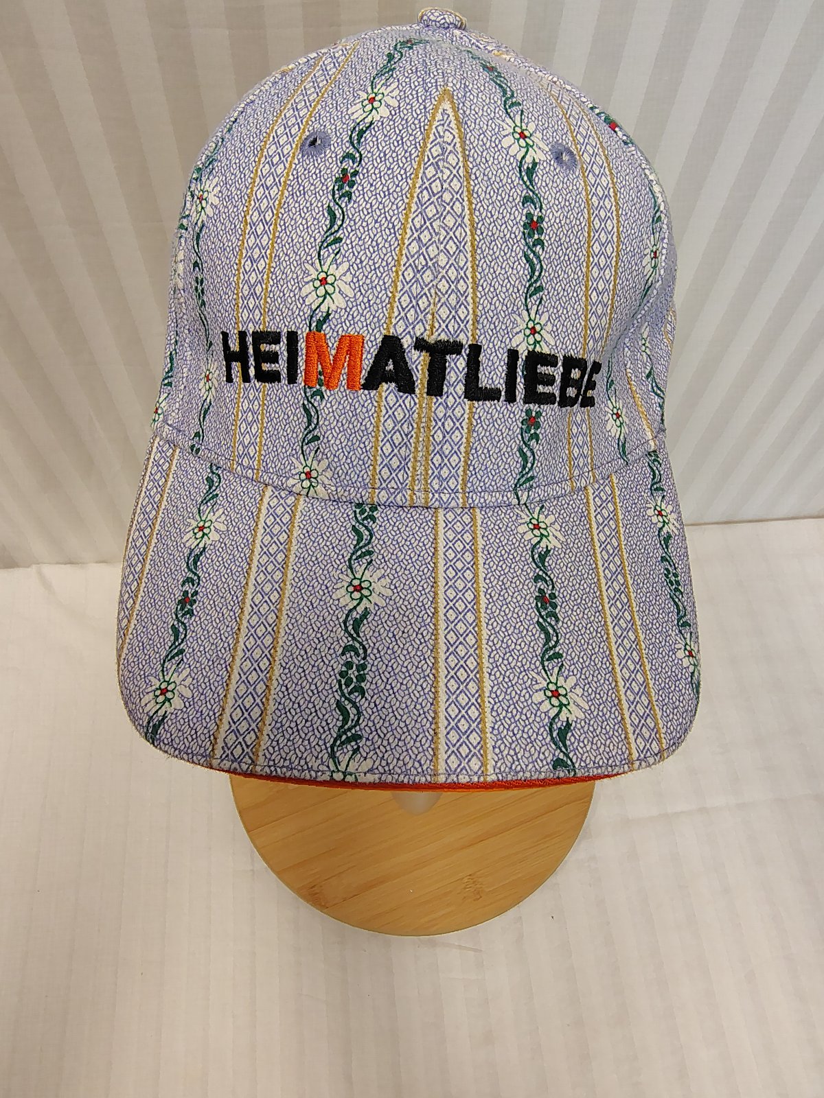 Farebná šiltovka s kvietkami č. 605, Weidmann, s klasickým šiltom, nastaviteľná - regulácia obvodu hlavy - zapínanie vzadu, je modro biela so zeleným vzorom a bielymi kvietkami, šilt zospodu je oranžový,