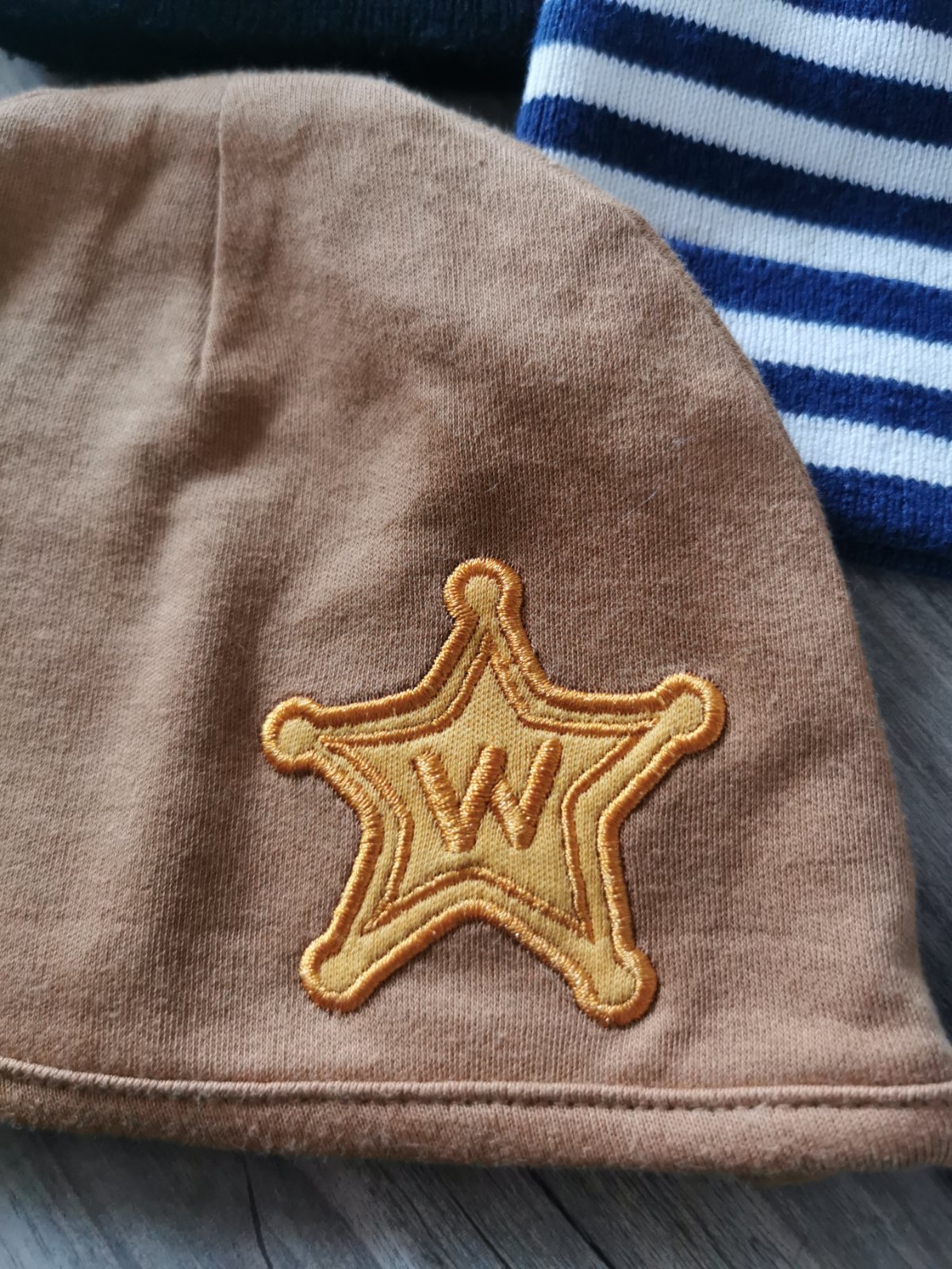 Hnedé, čierna a modré pásikavé čiapky