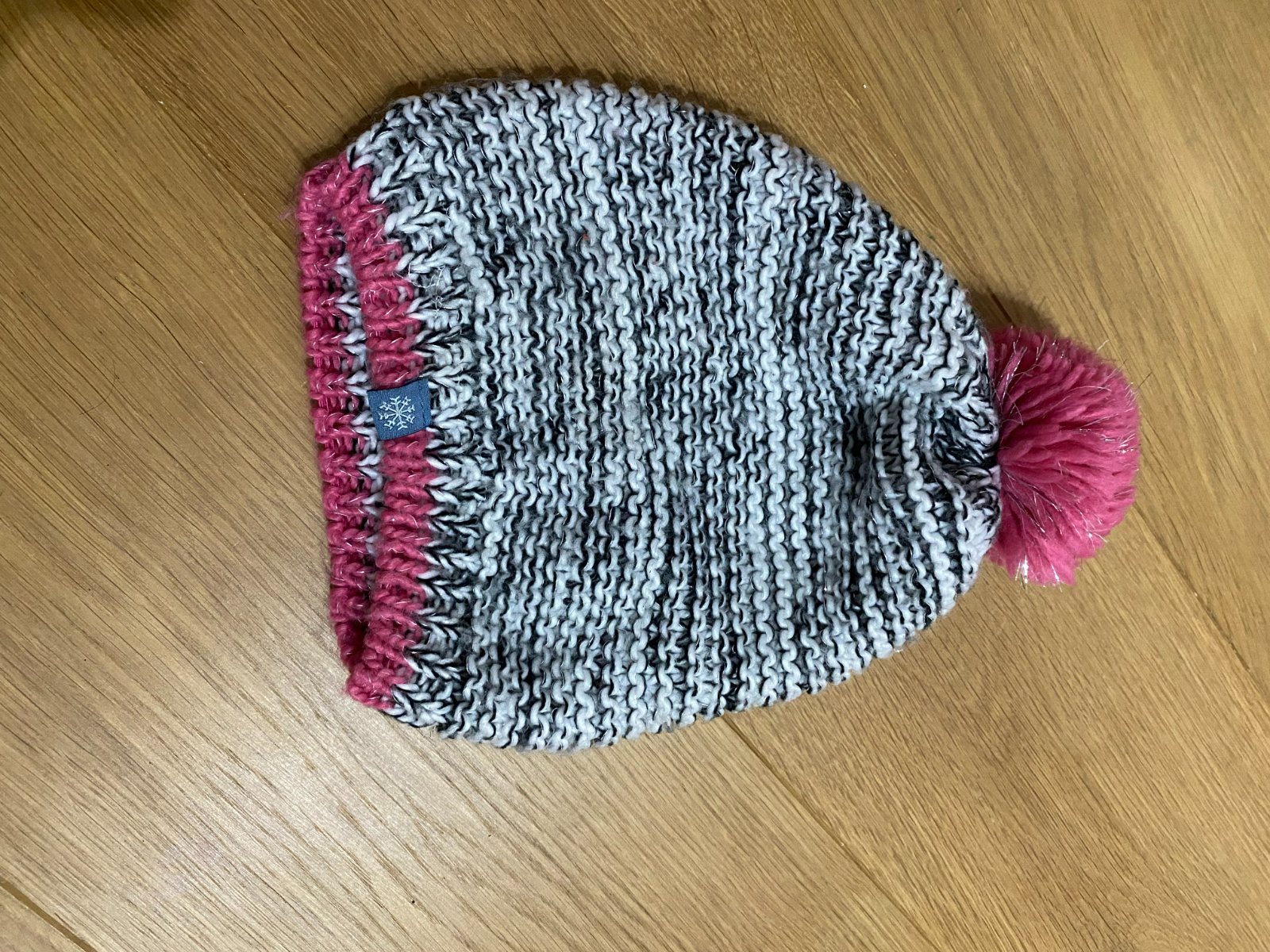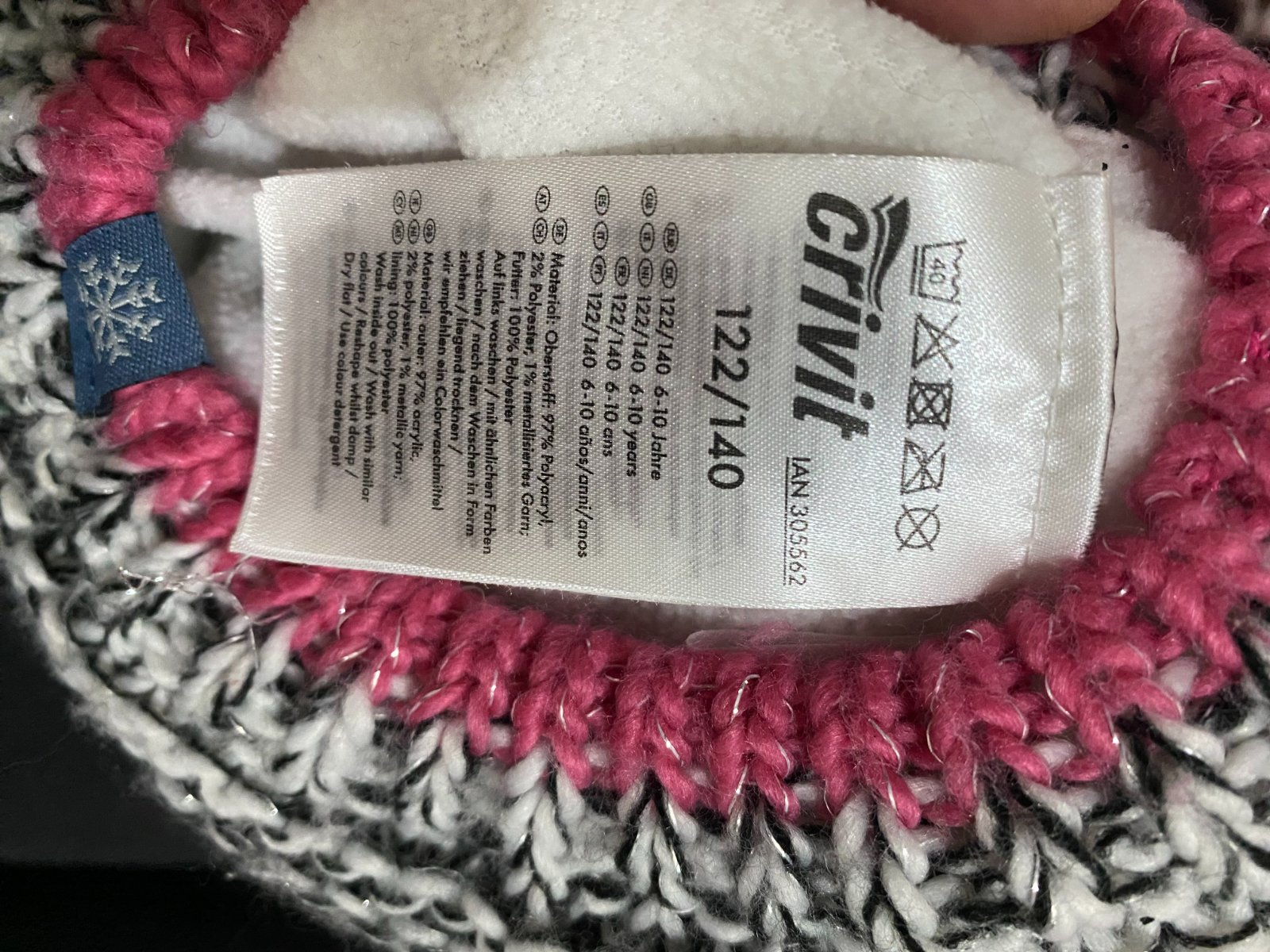 Teplucka ciapka na zimu s brmbolcom, znacka Crivit, velkost udavaju 122-140, ale to je podla mna len v pripade kratkych vlasov, skor by som to oznacila niekde okolo 80-92, najma ak do nej idu aj co...