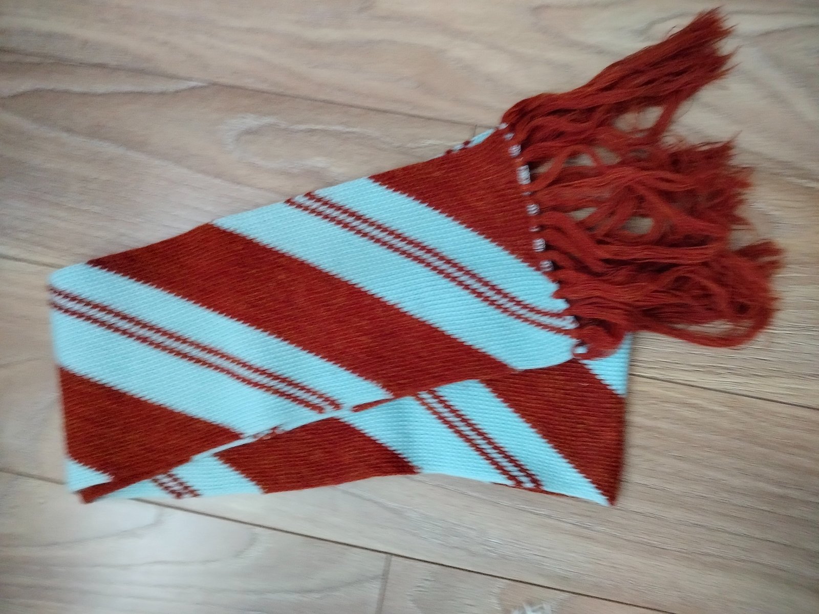 Predám pekný pletený šál, bordovočervenej farby so svetlomodrymi pruhy. Dĺžka: cca 170 cm + 15 cm strapce, šírka 15 cm. Materiál je mäkká vlna/akryl (príjemný na krk, nehryzie). Slovenská výroba.