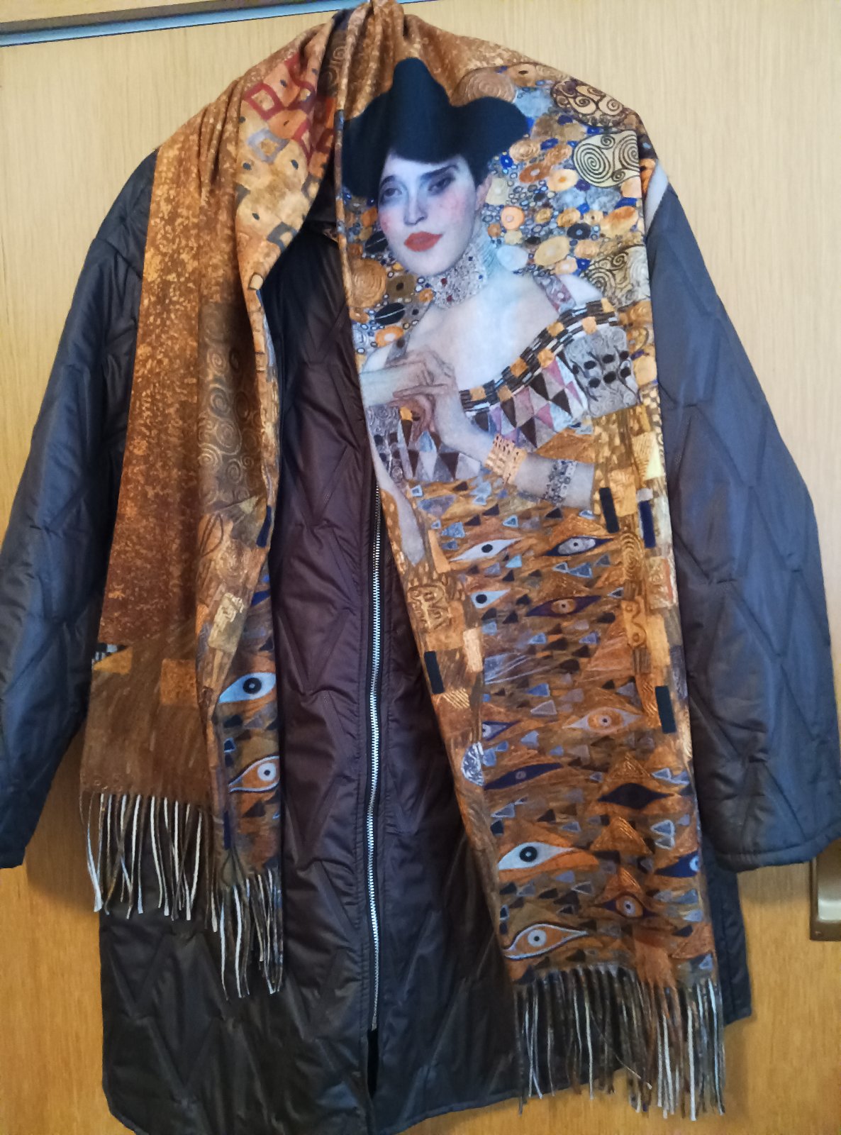 Krásny šál / raz použitý/ s motívom G. Klimta, v pekných farbách jesene: hnedé odtiene, čierna., horčicová, bordová. Dĺžka: 180cm + strapce, šírka: 72cm, veľmi príjemný na telo, značka: VERSOLI. TOP stav.