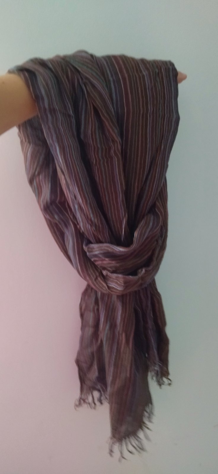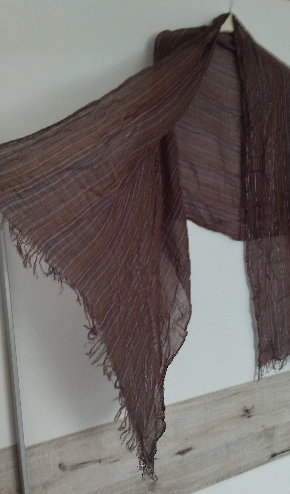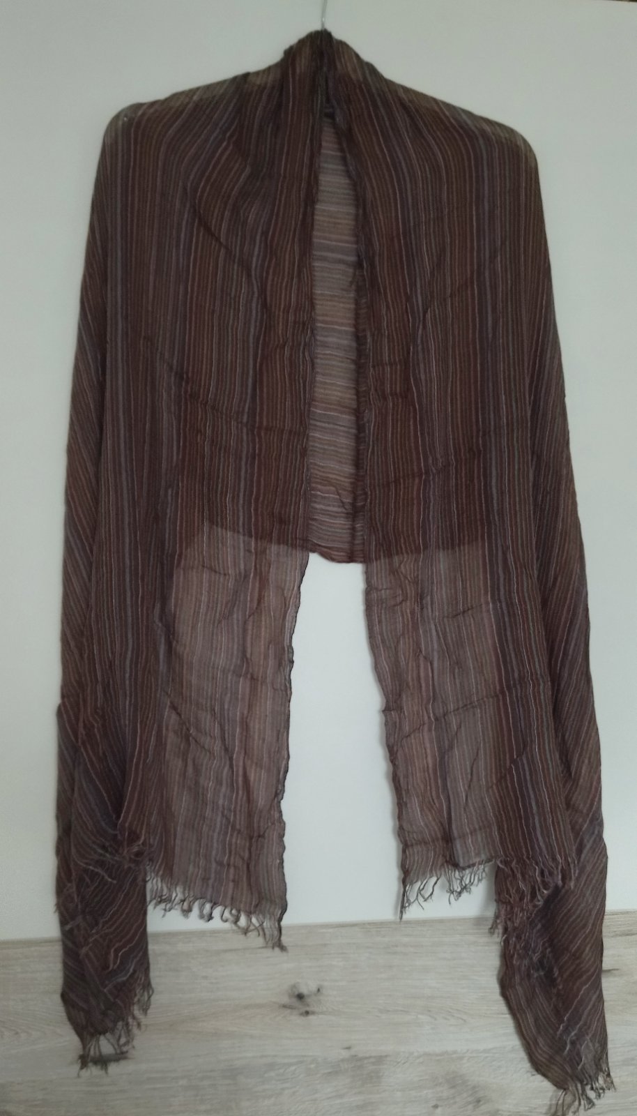 tmavo hnedý pletený šál so strapcami, bez poškodení, v dobrom nosenom stave, materiál 100 akryl. Miery: šírka = 27 cm, dĺžka = 220 cm.