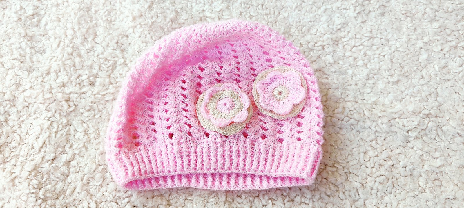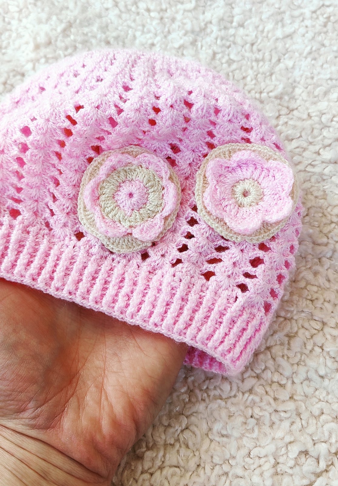 Makucka ciapka v kombinacii bielej a pudrovo ruzovej. Obvod: 34 cm. Vyska: 17 cm.