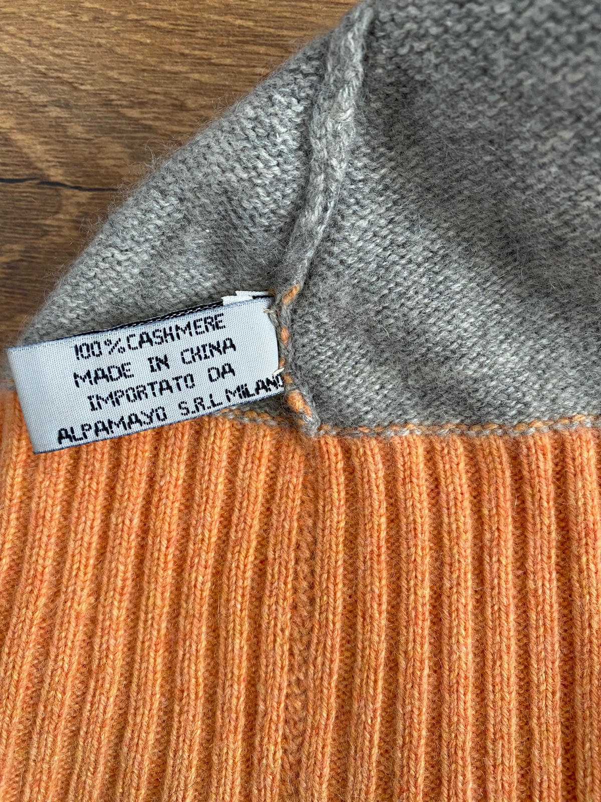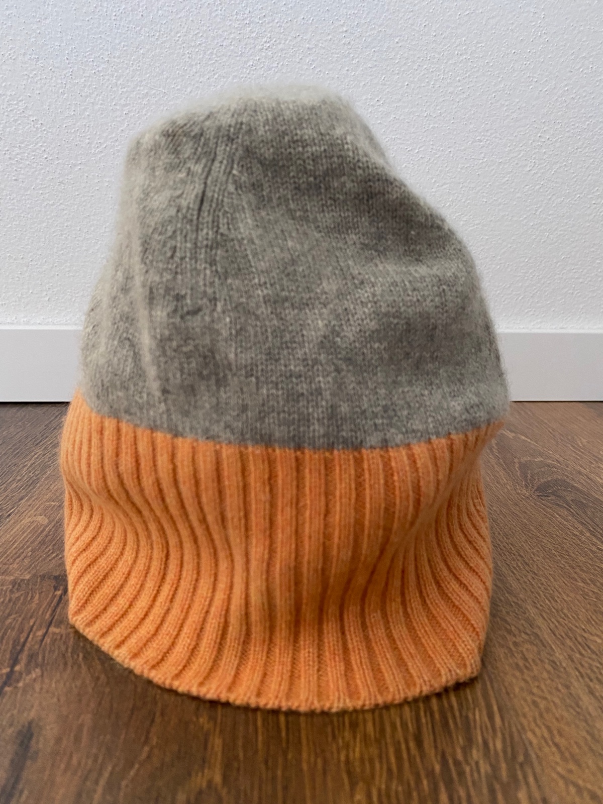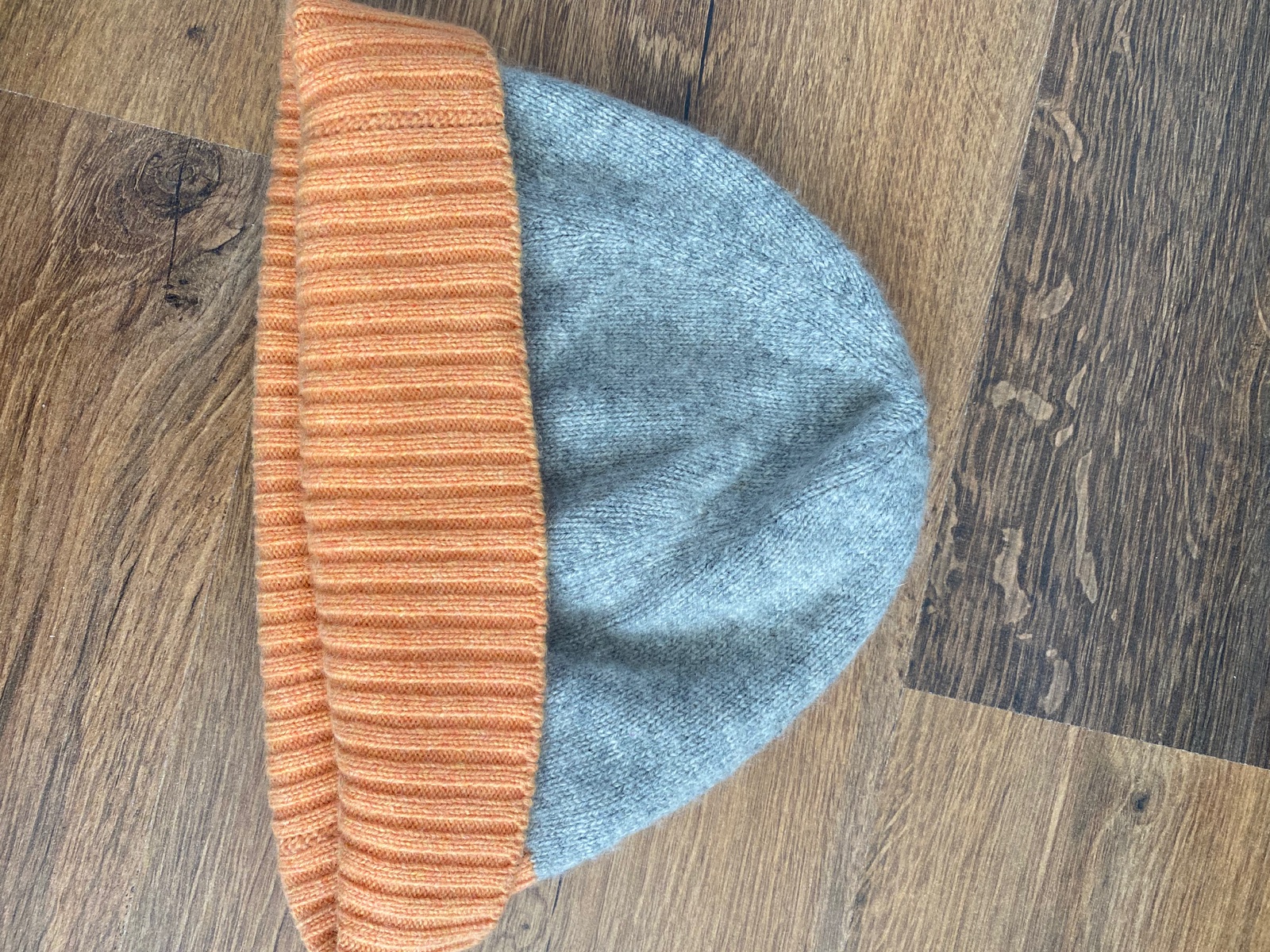 Pekná čiapka 100% kašmír. Príjemná a tepla. Kombinácia farieb šedej a oranžovej