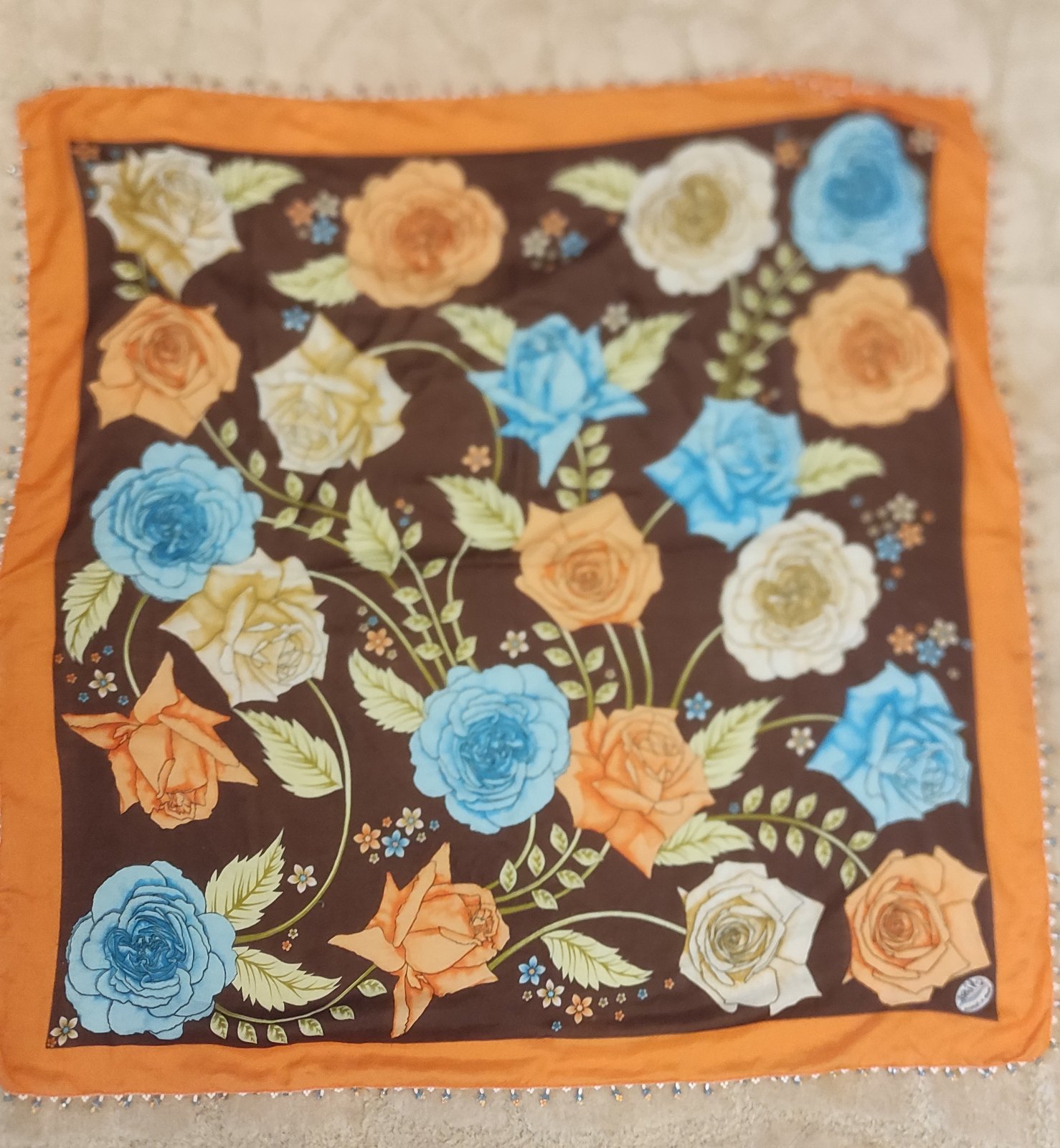 Oranžová šatka s kvetmi. Bola použitá asi 2krat. Nemá žiadne poškodenia. Rozmer cca 108×202cm. Farba je v skutočnosti sýtejsia ako na foto. Cena 3€ + poštovné.