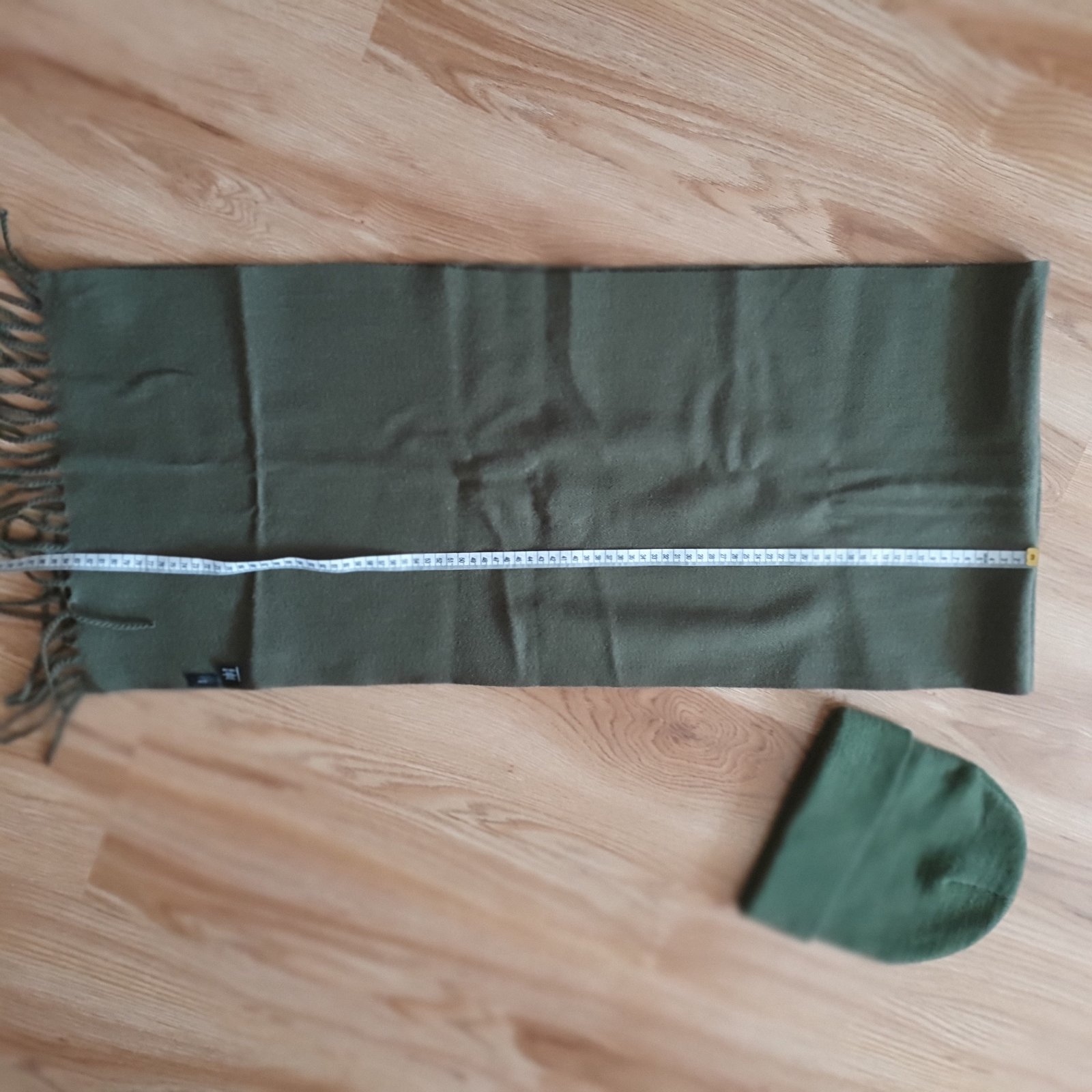 Nosená zimná súprava, podšitá čiapka, šál, rukavice - tie sú zasivane pri palcoch - pustil sev.