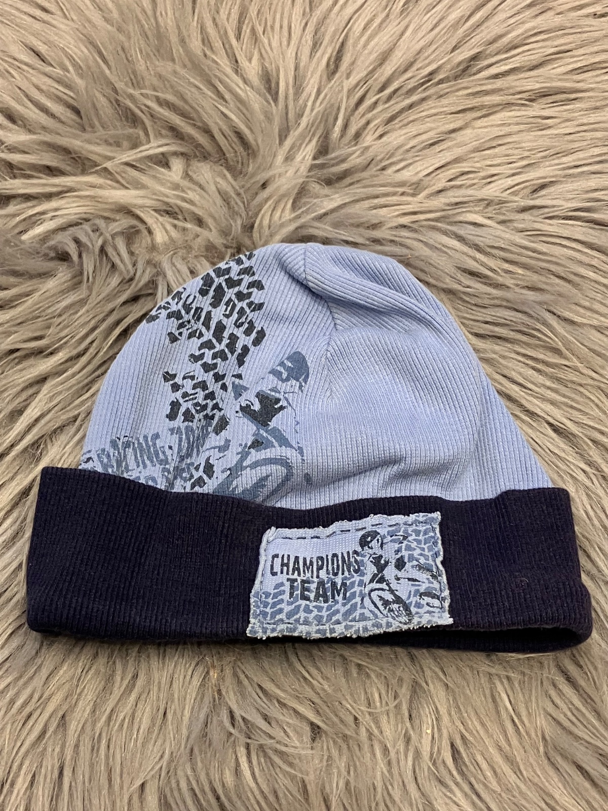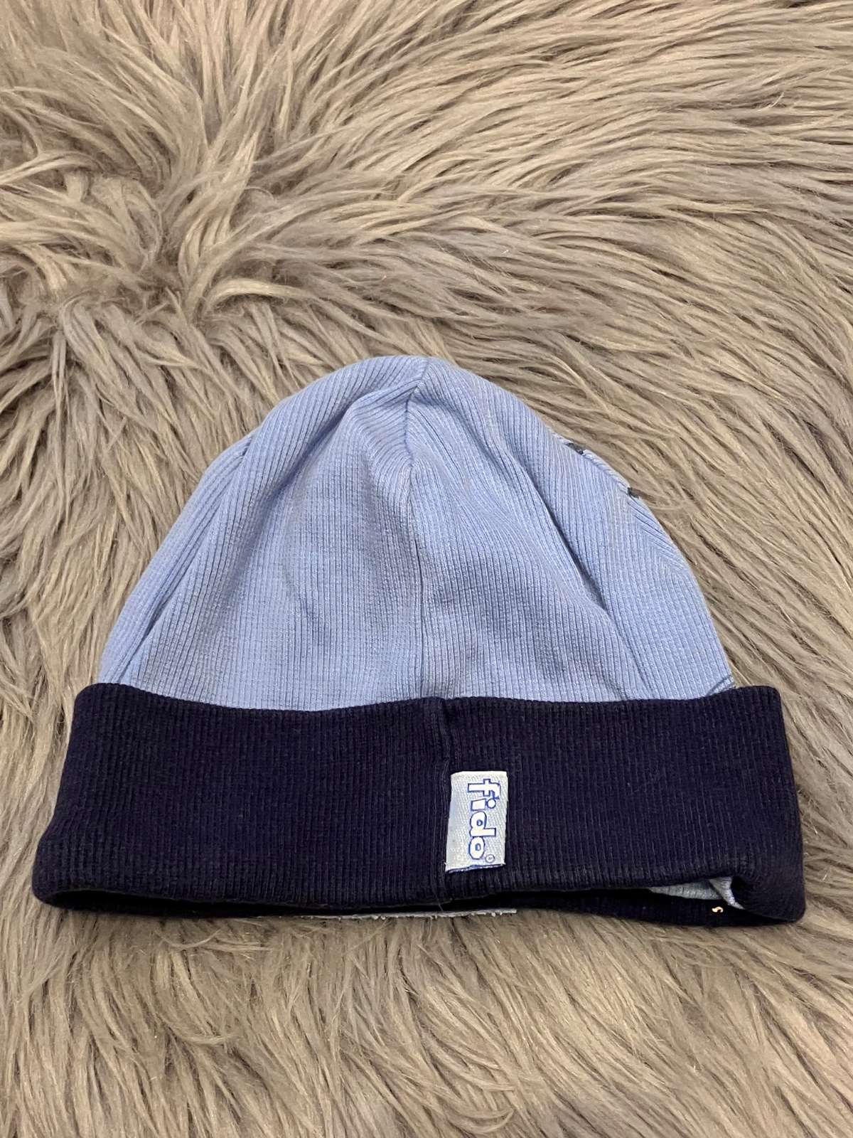 Chlapčenská prechodná čiapka, modro-tmavomodrá, elastická. Veľkosť cca 86.