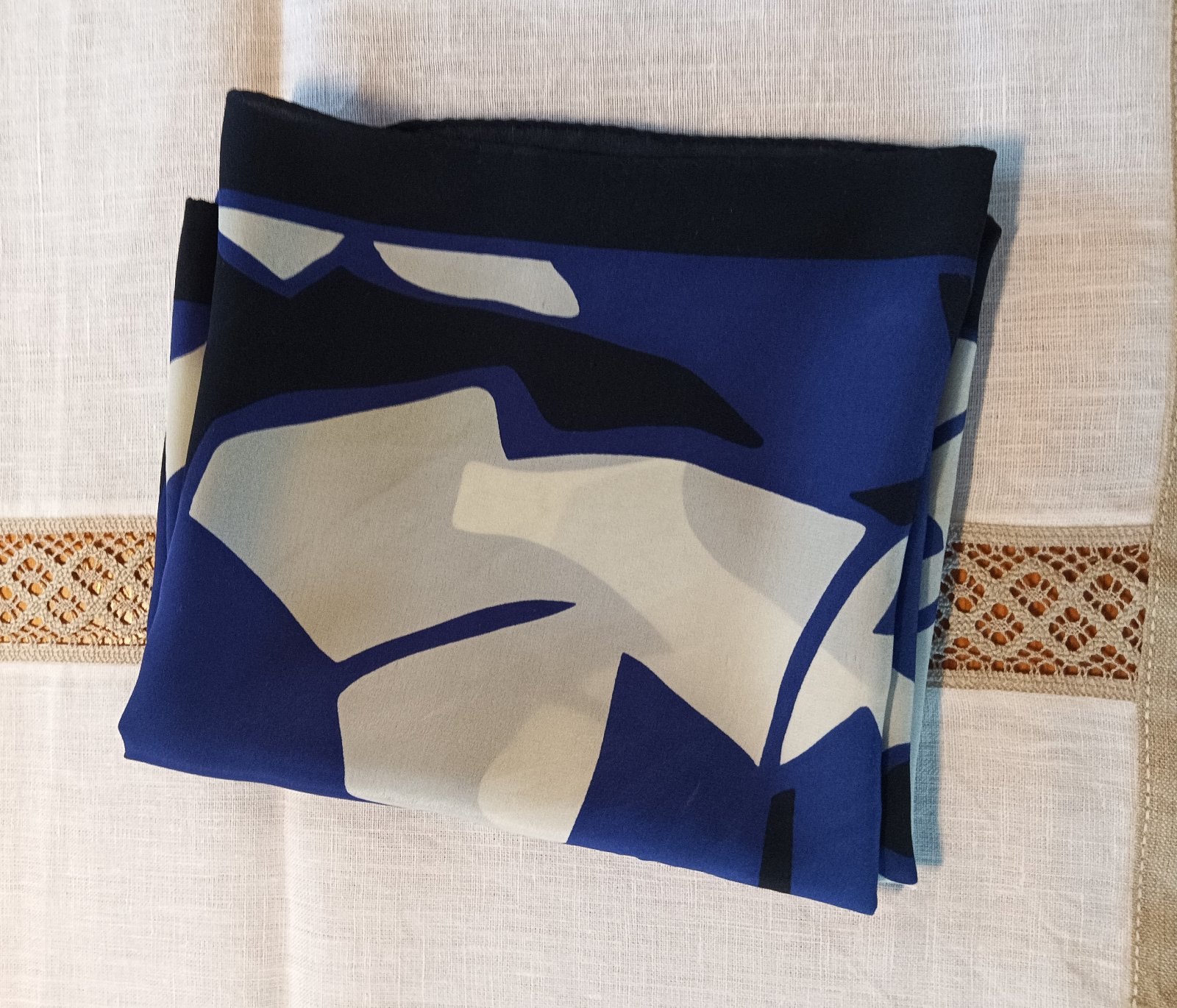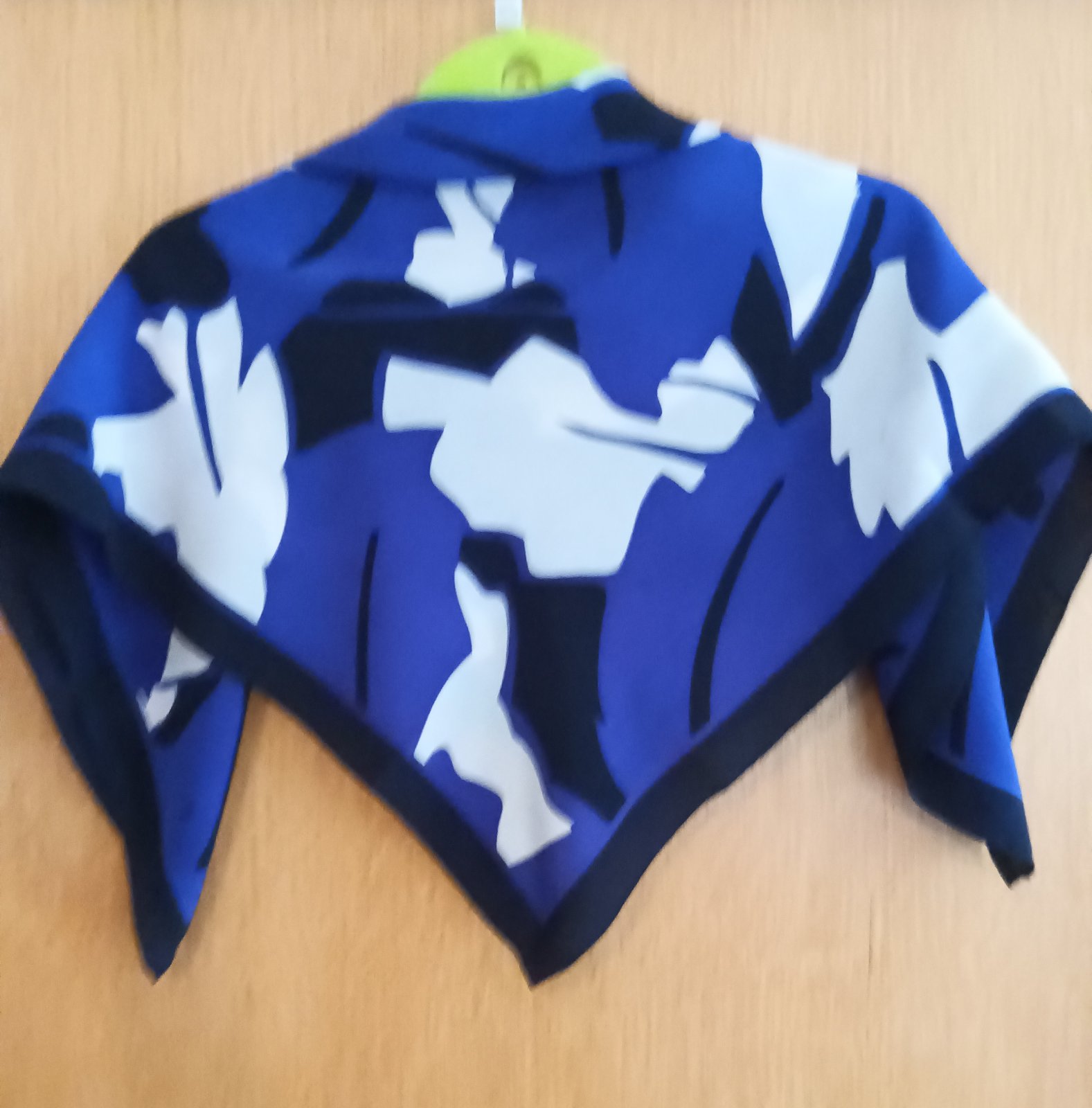 Elegantná hodvábna šatka je zo silnejšieho druhu hodvábu, rozmer: 75 x 75, farby: tm. modrofialová, čierna, biela. Málo nosená, v poriadku.