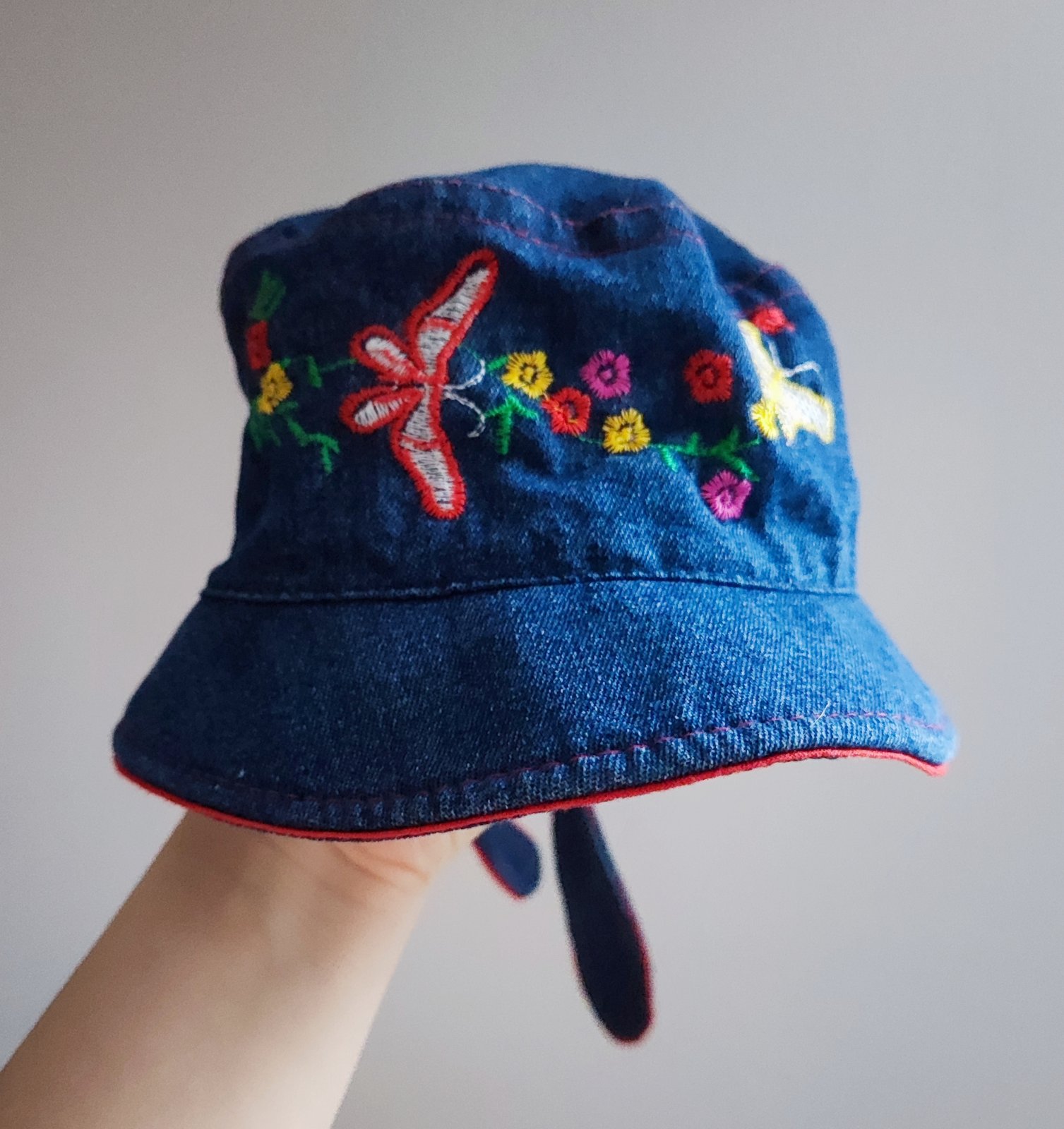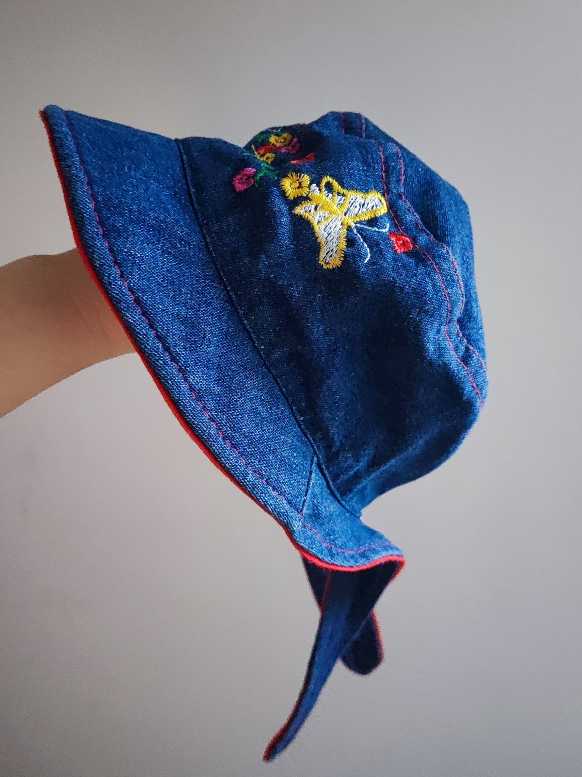 riflový klobúčik, veľkosť písaná 12 - 24 mesiacov, podšívaný modrou bavlnou, vnútor. obvod 50,5 - 51 cm je to približne 98, na ružovom okraji miestami malé zažltnuté fliačiky, z diaľky nevidno, ina...